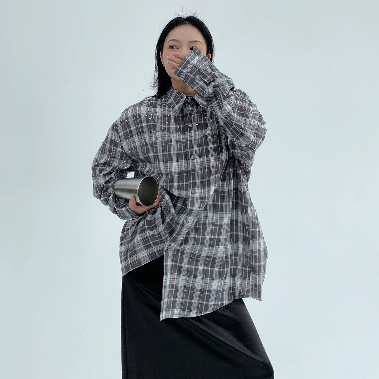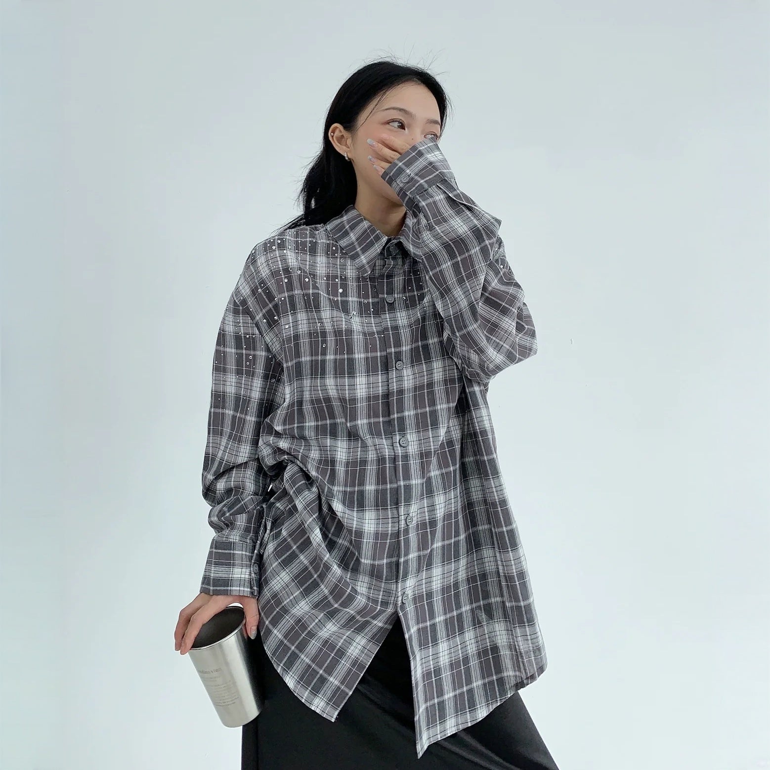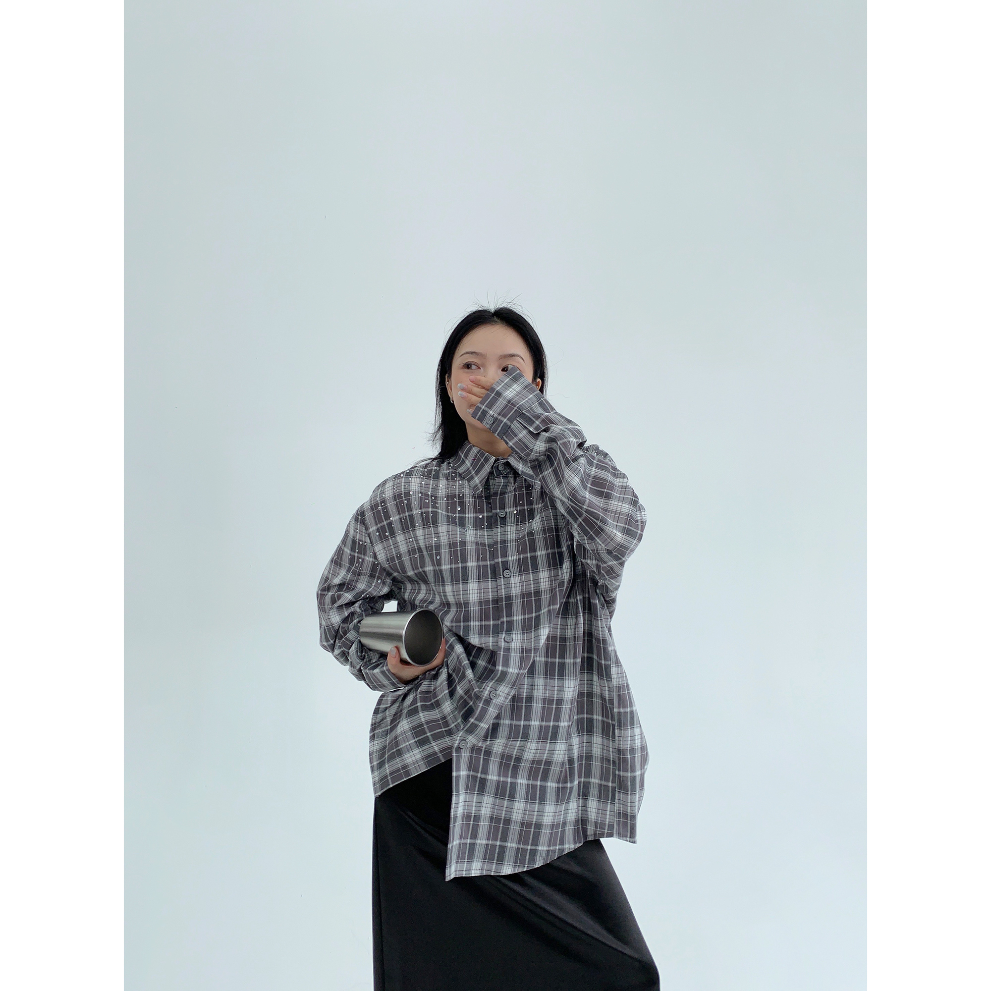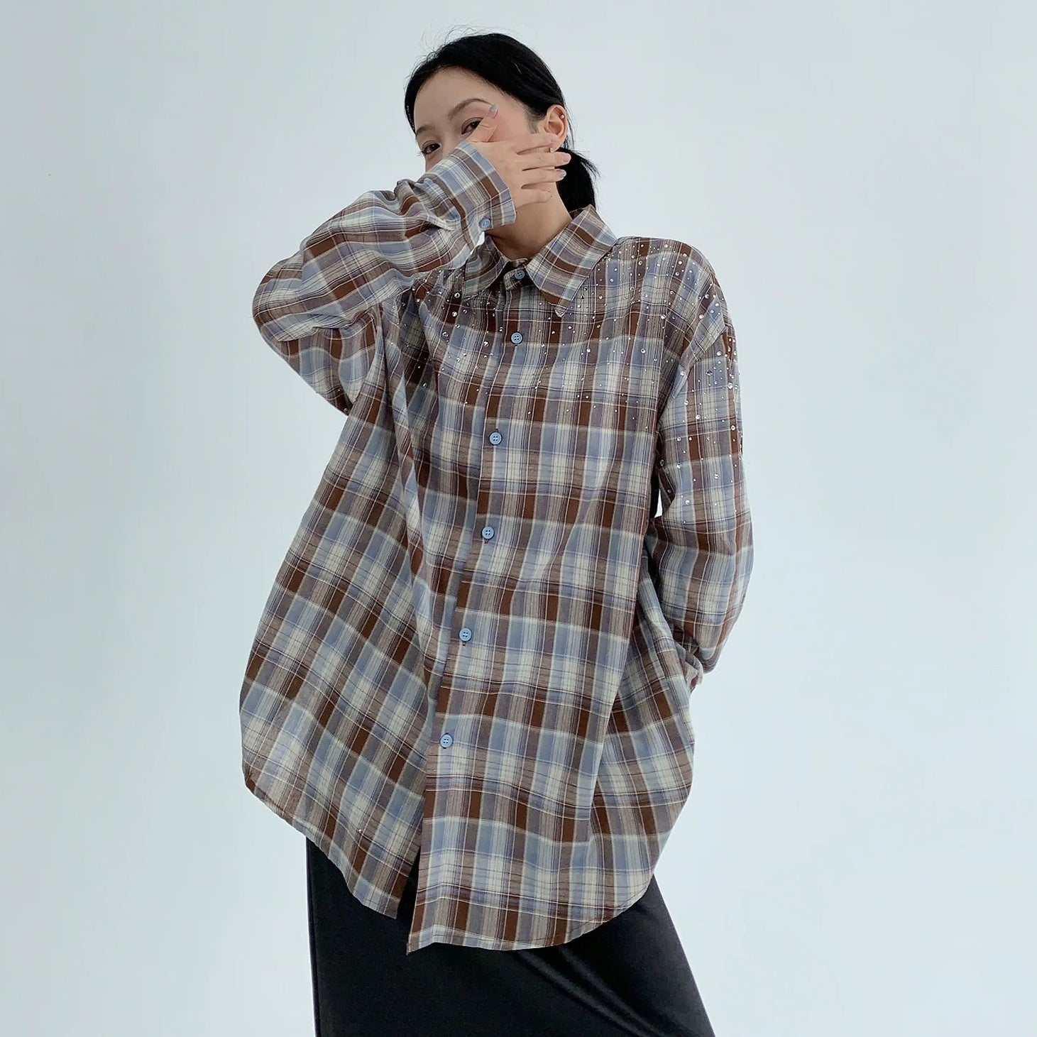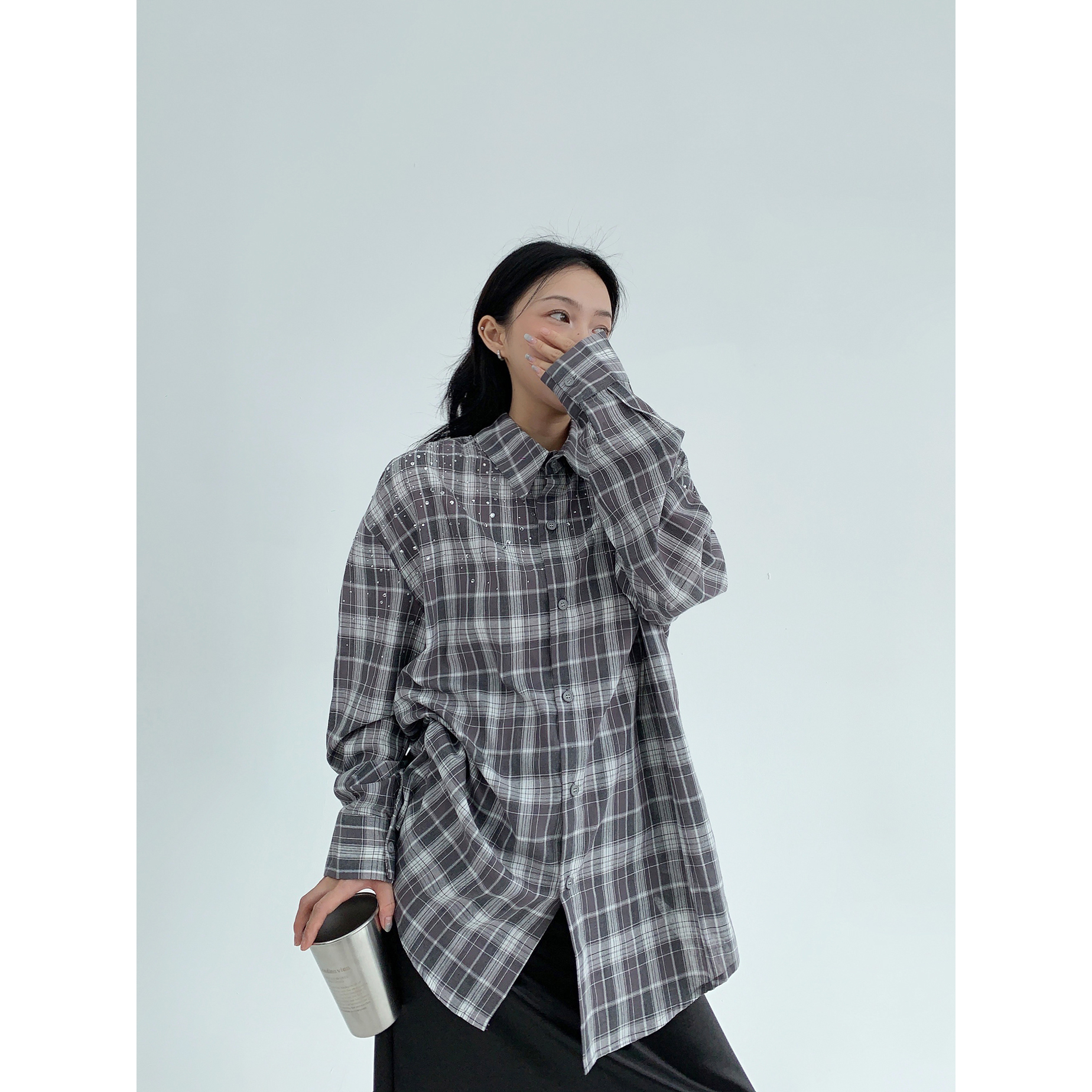 【商品名】【トップス】春 秋 冬 レトロ ラインストーン チェック 長袖シャツ 【FCシリーズ】