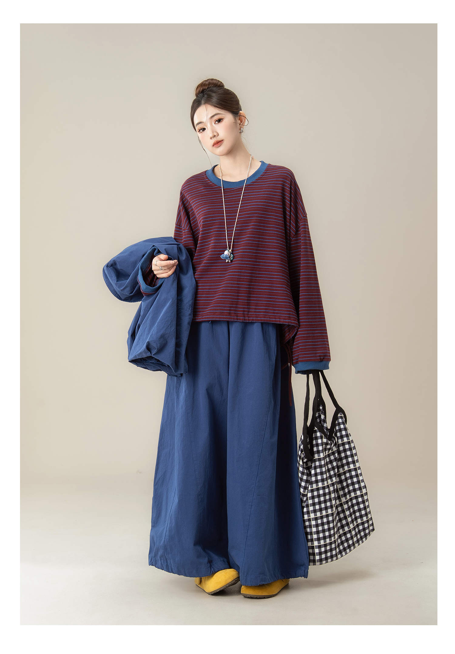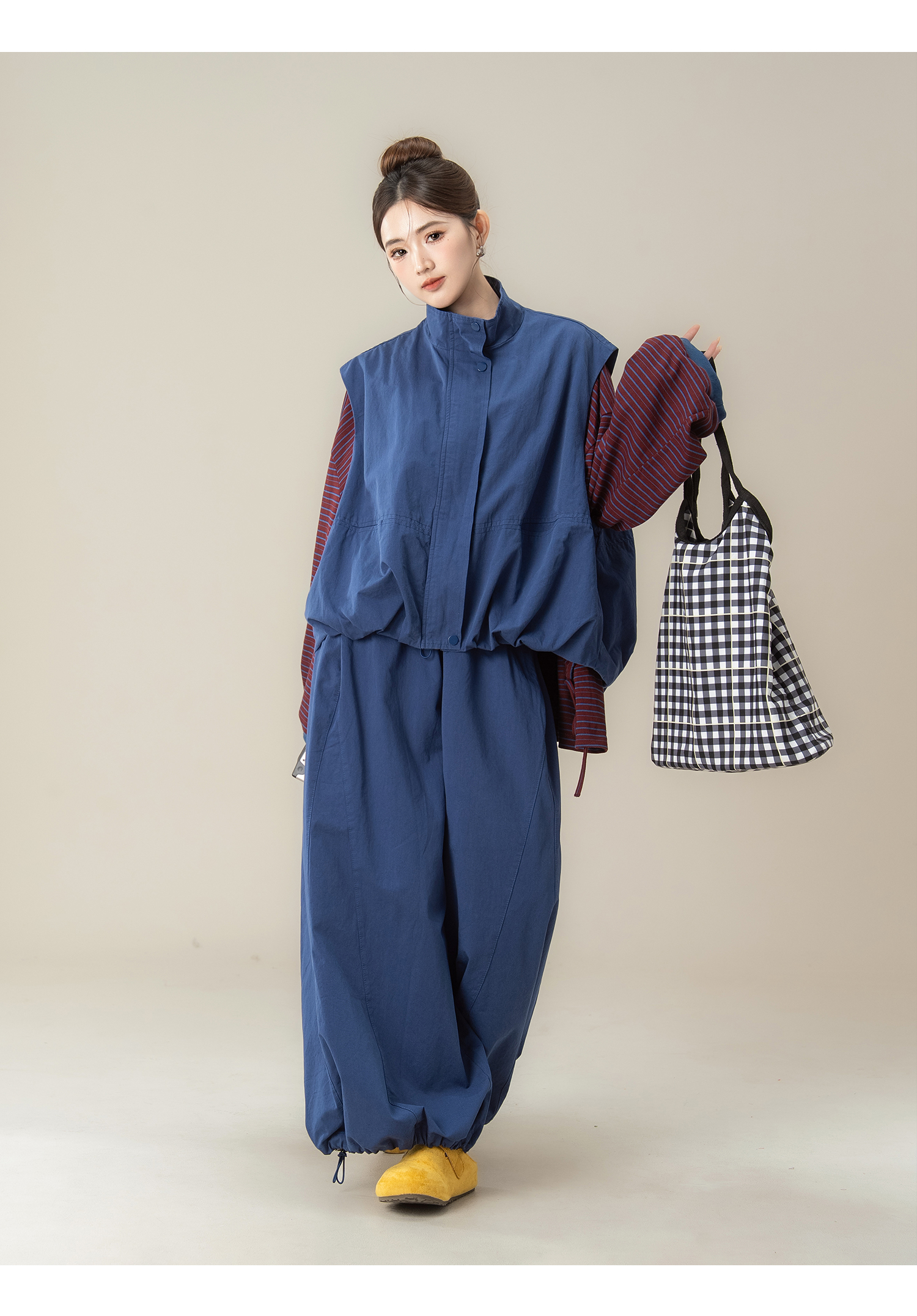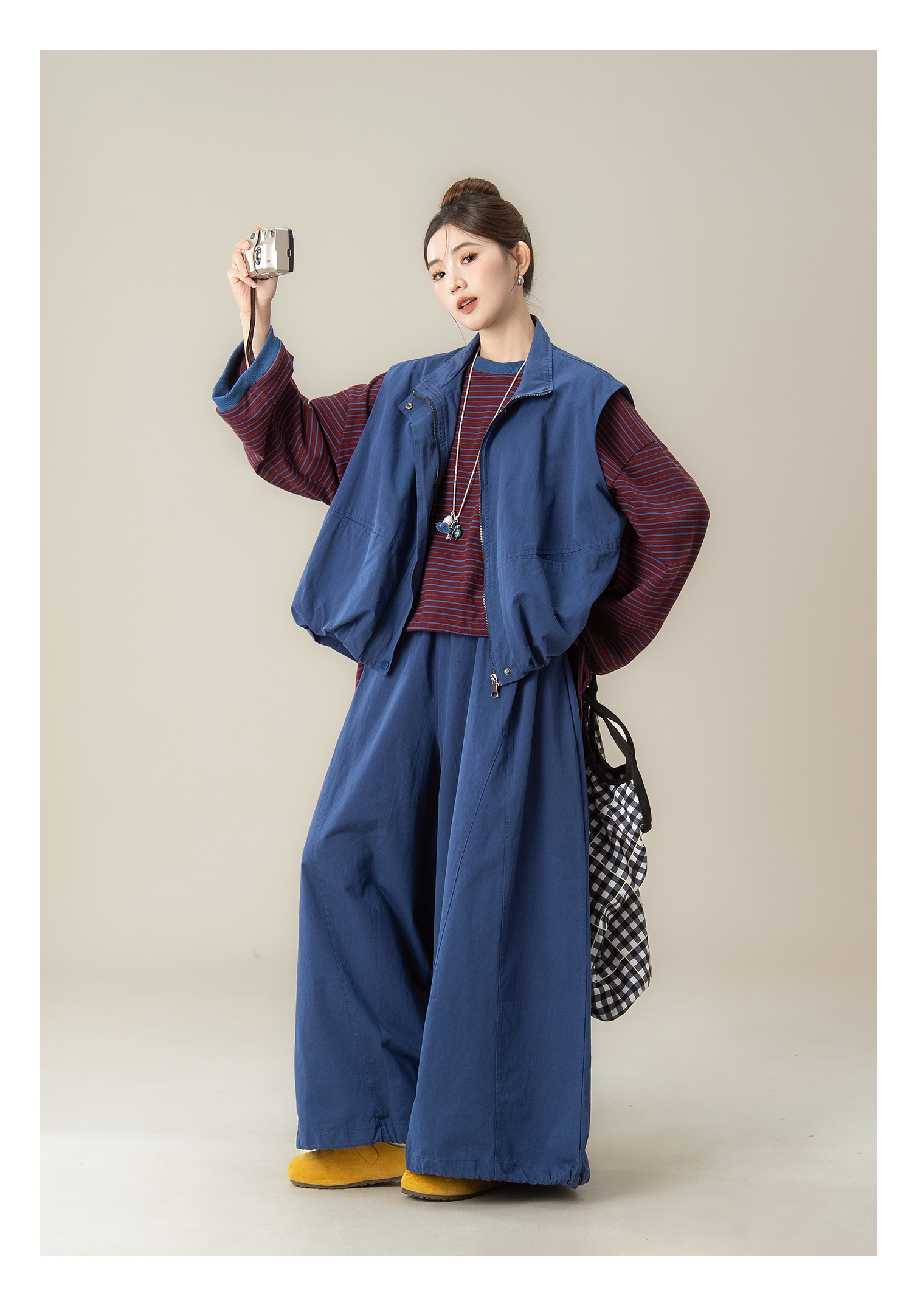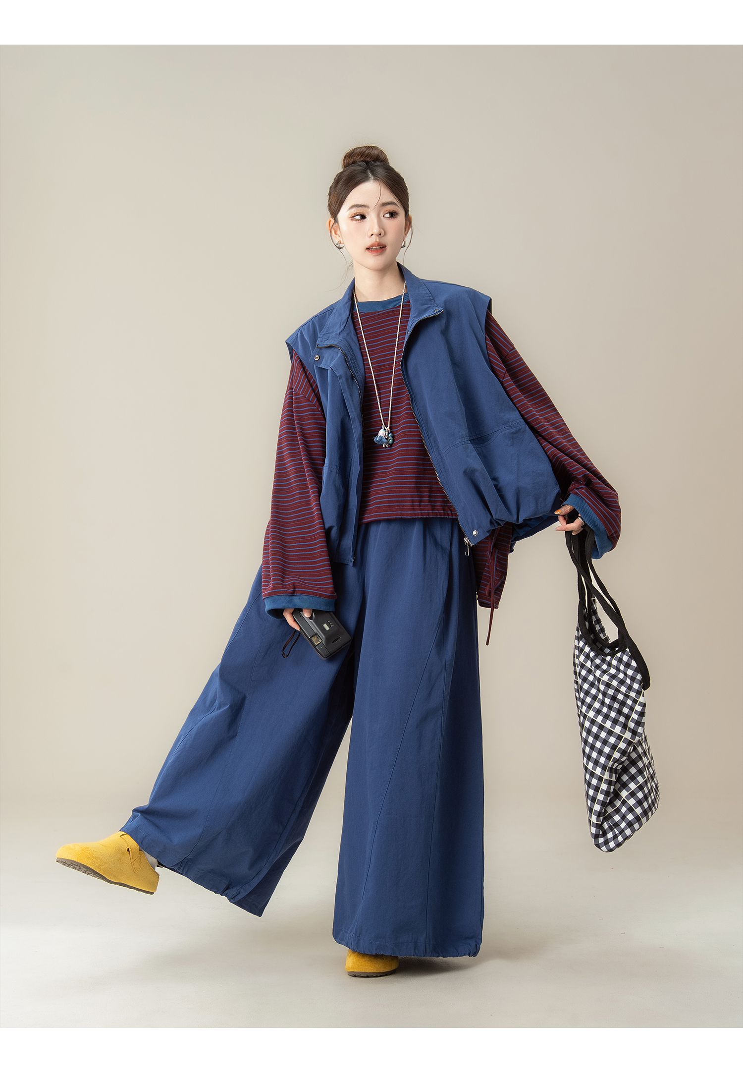 【商品名】【単品注文】【セットアップ】秋新作 ゆったり ストライプTシャツ+ベスト+ワイドパンツ 上下セット 体型カバー お洒落【JZシリーズ】