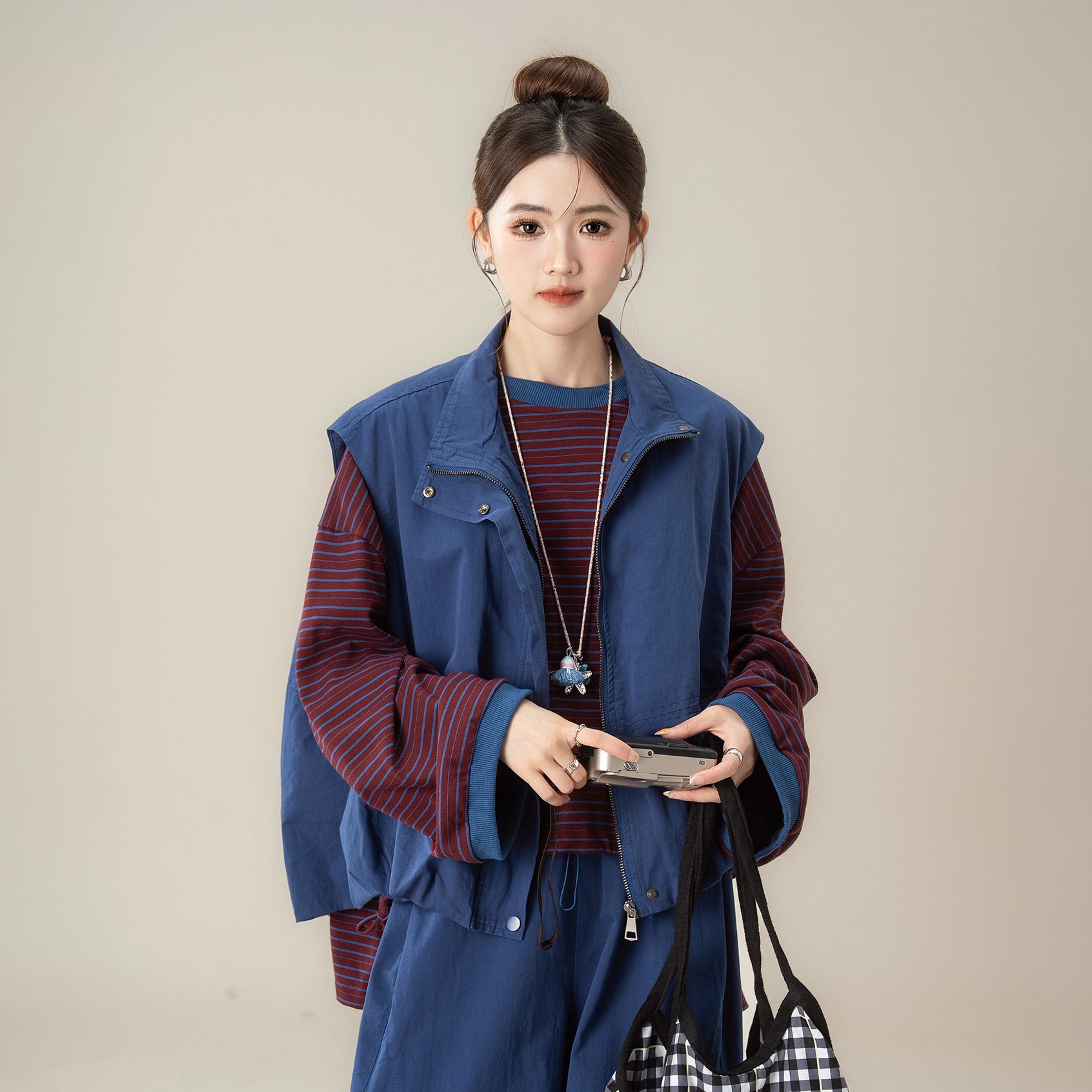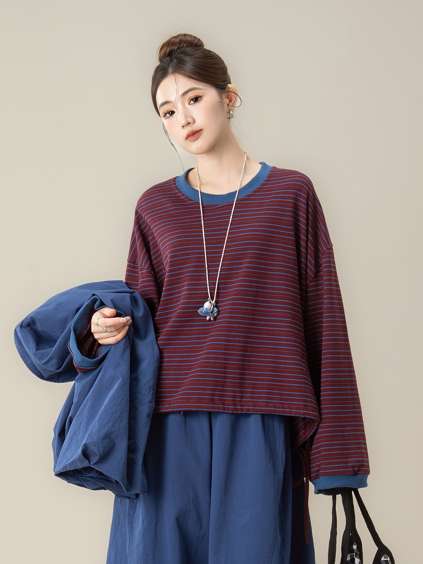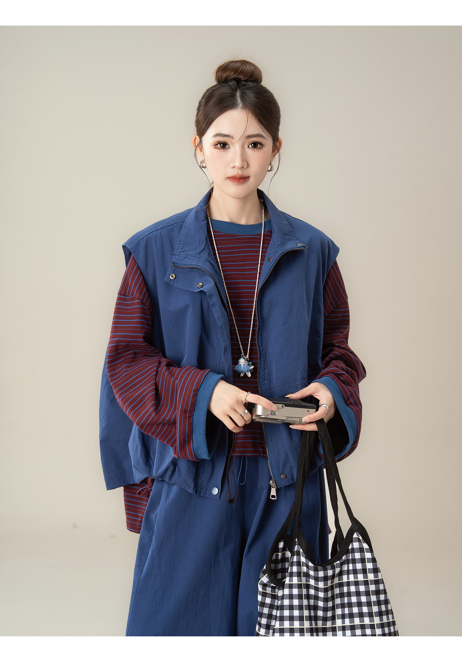 【商品名】【単品注文】【セットアップ】秋新作 ゆったり ストライプTシャツ+ベスト+ワイドパンツ 上下セット 体型カバー お洒落【JZシリーズ】