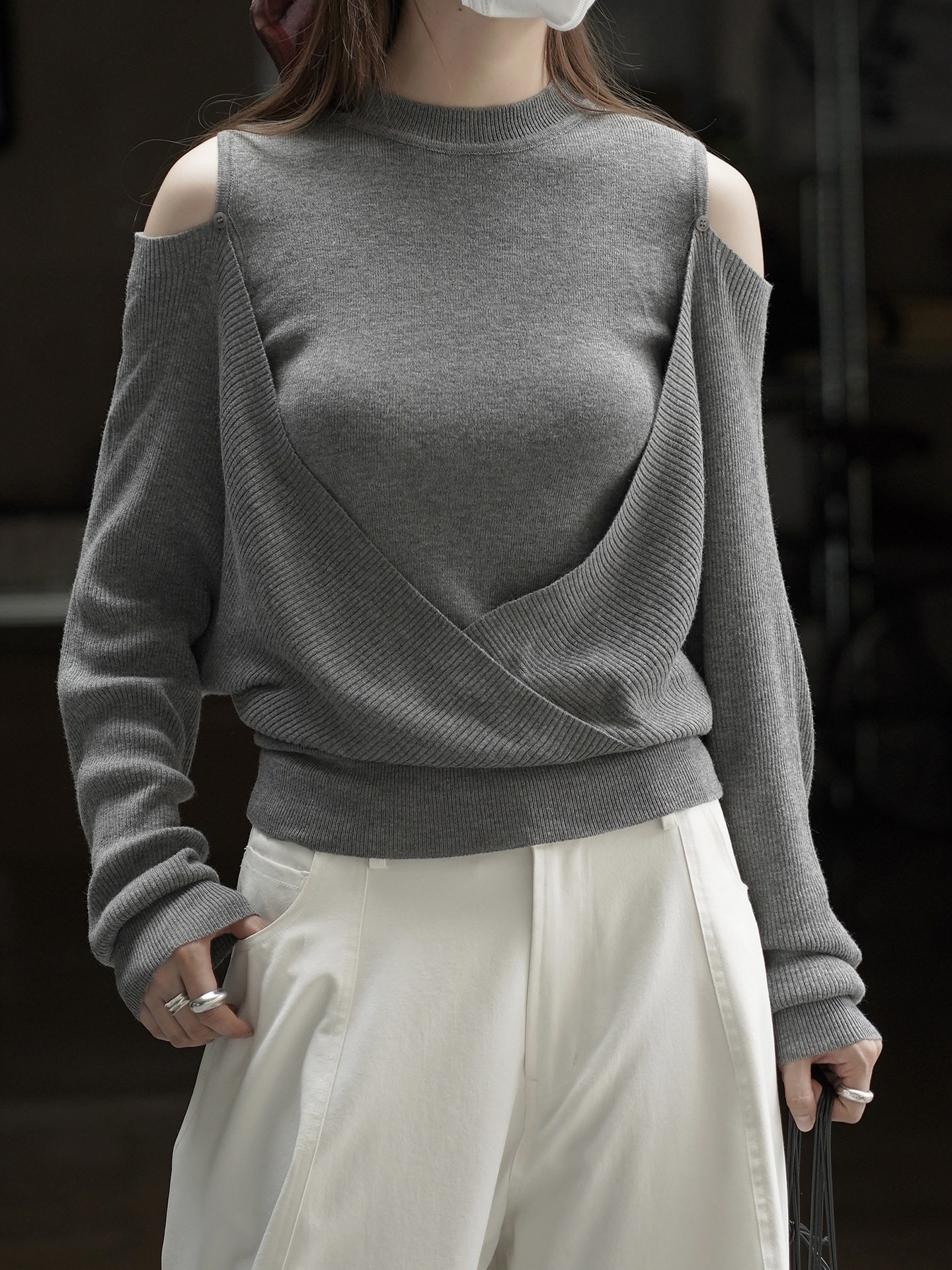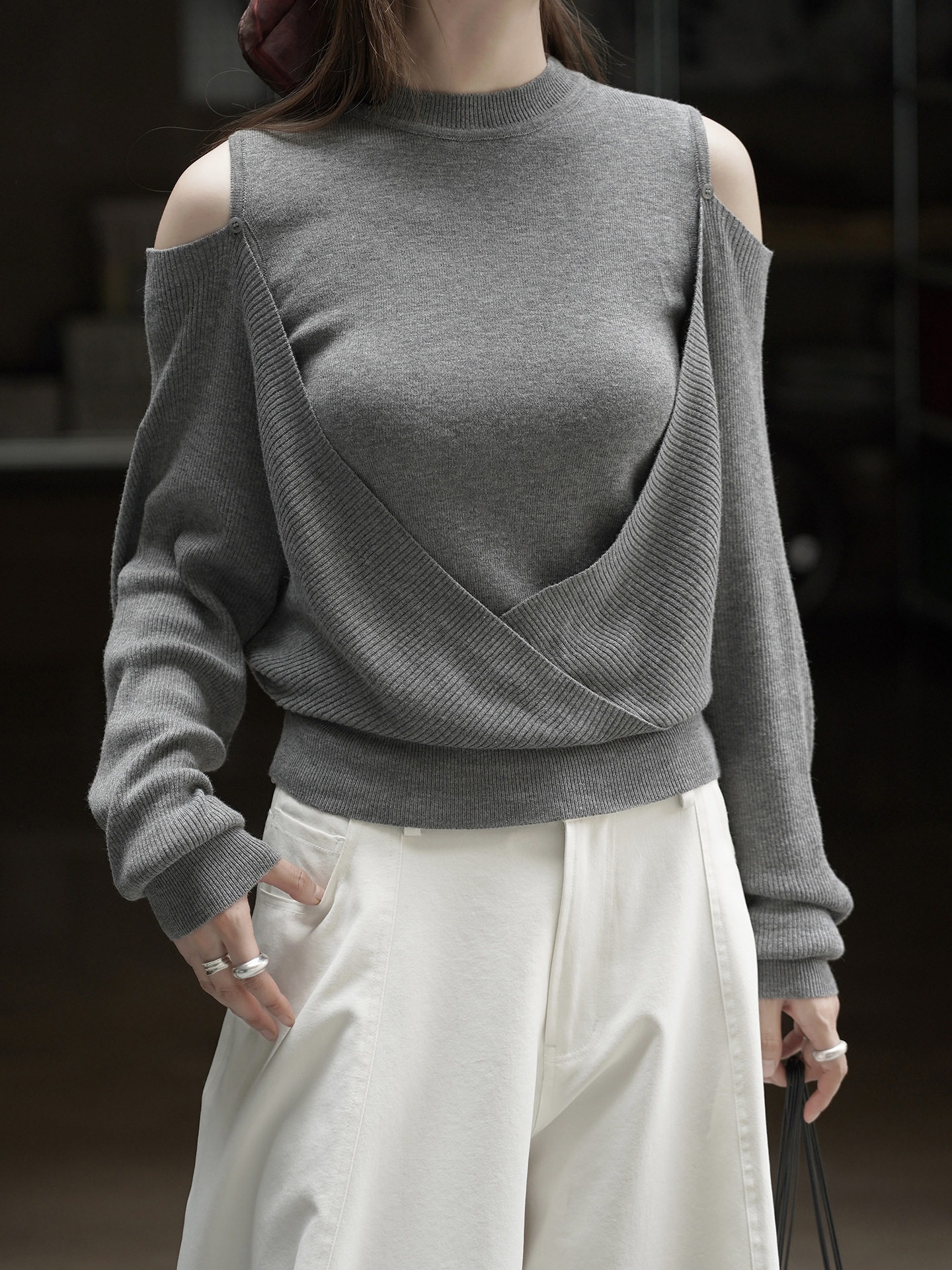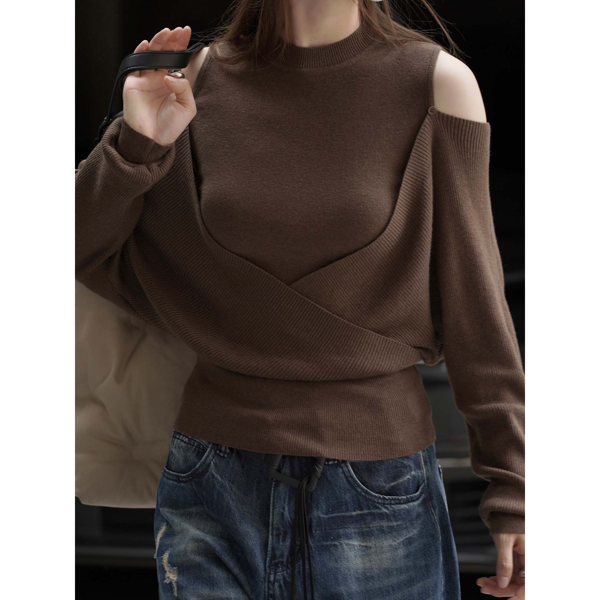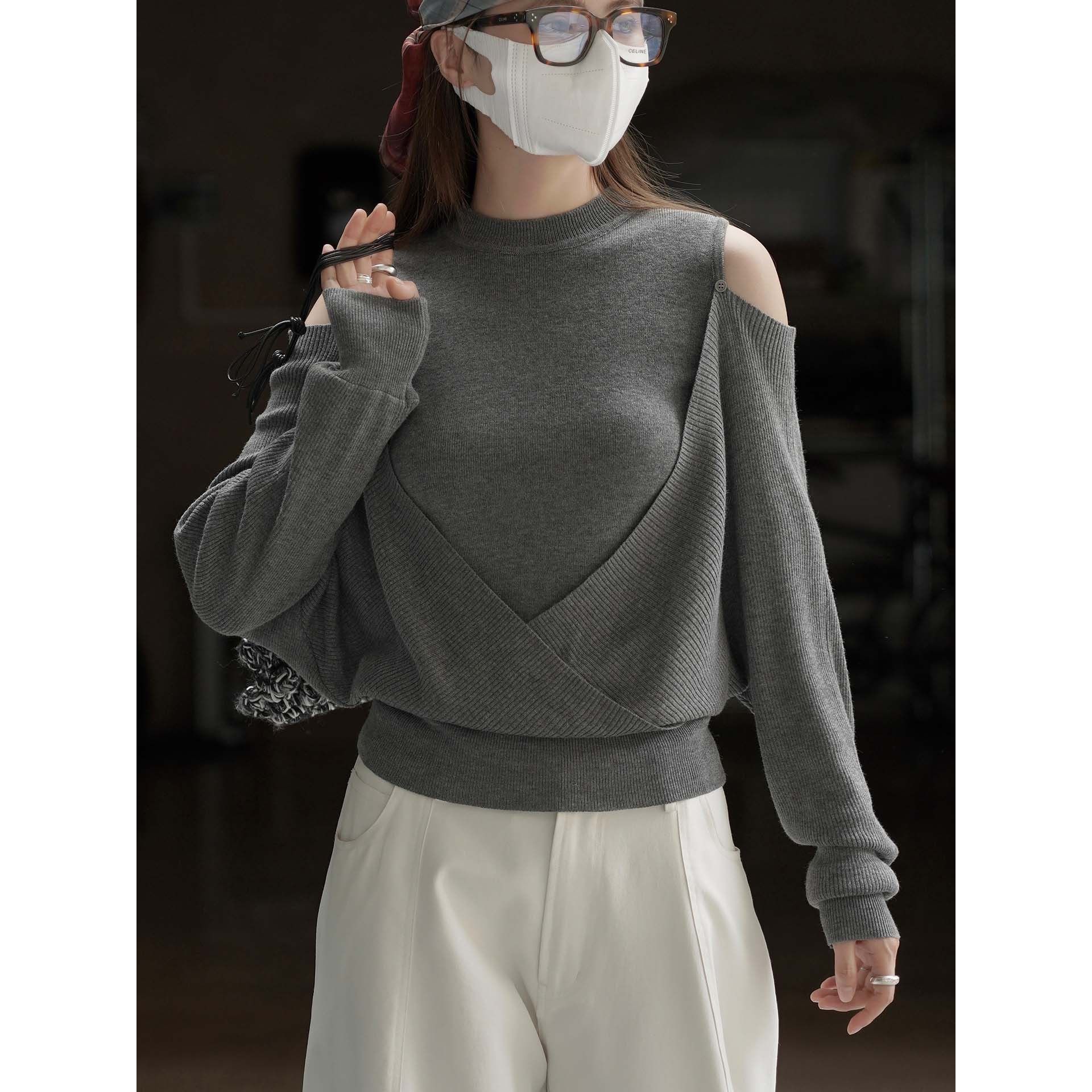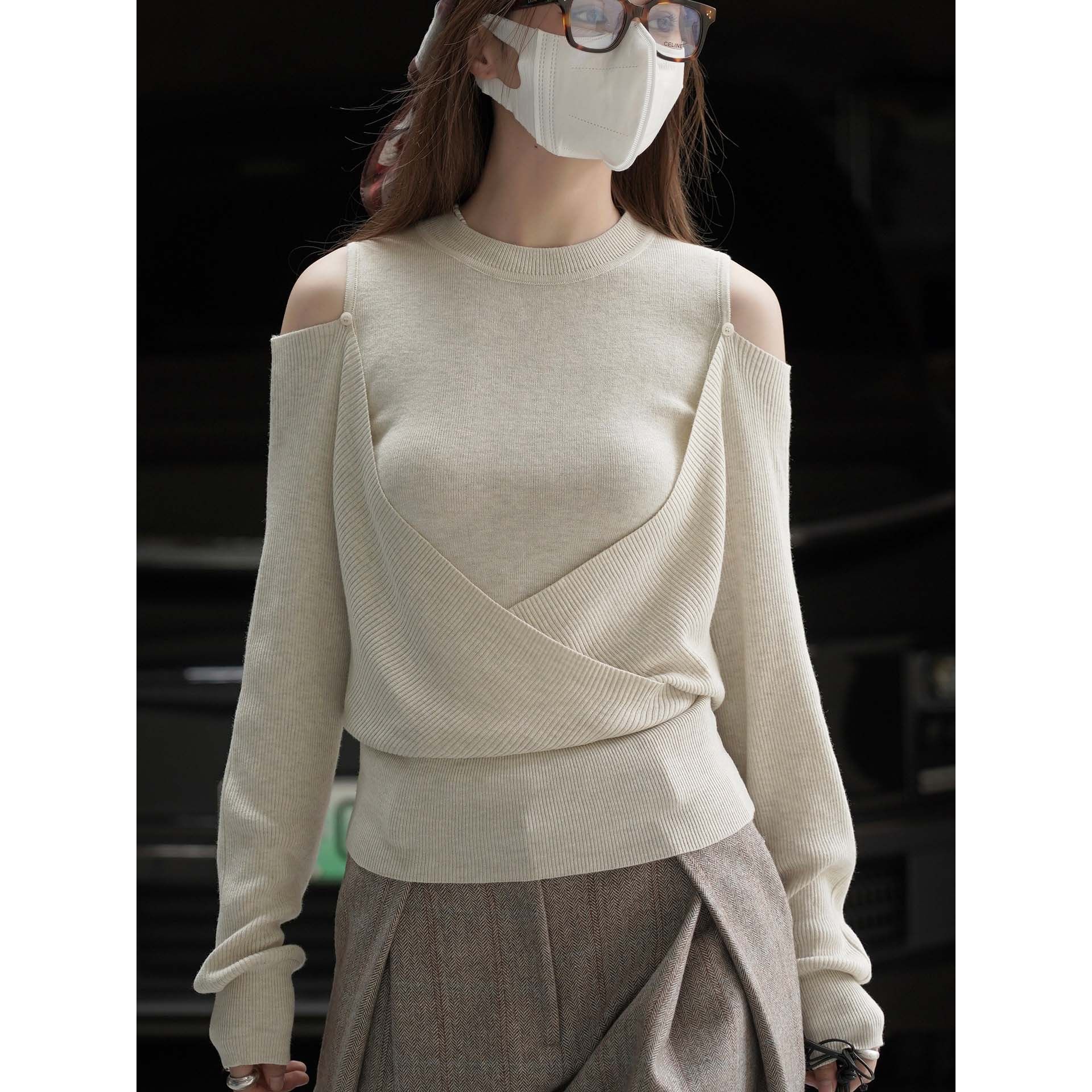 【商品名】【トップス】春 秋 冬 オフショルダー クロスデザイン 肌に優しい ニット Tシャツ 【JZシリーズ】