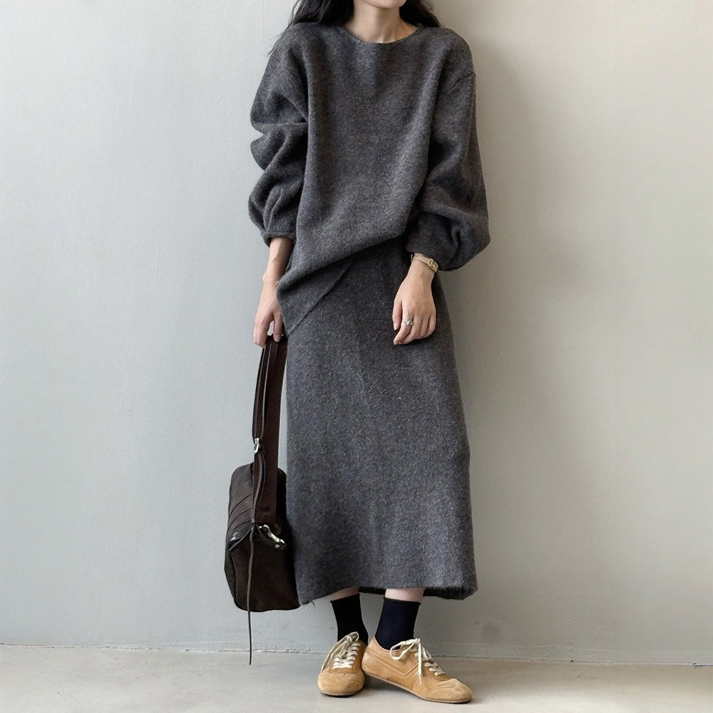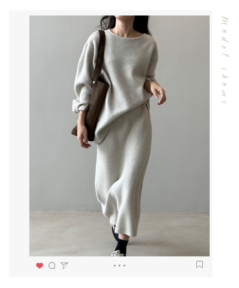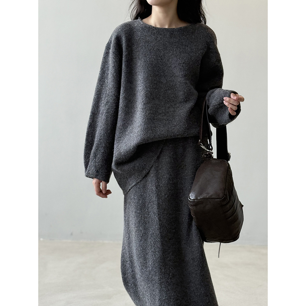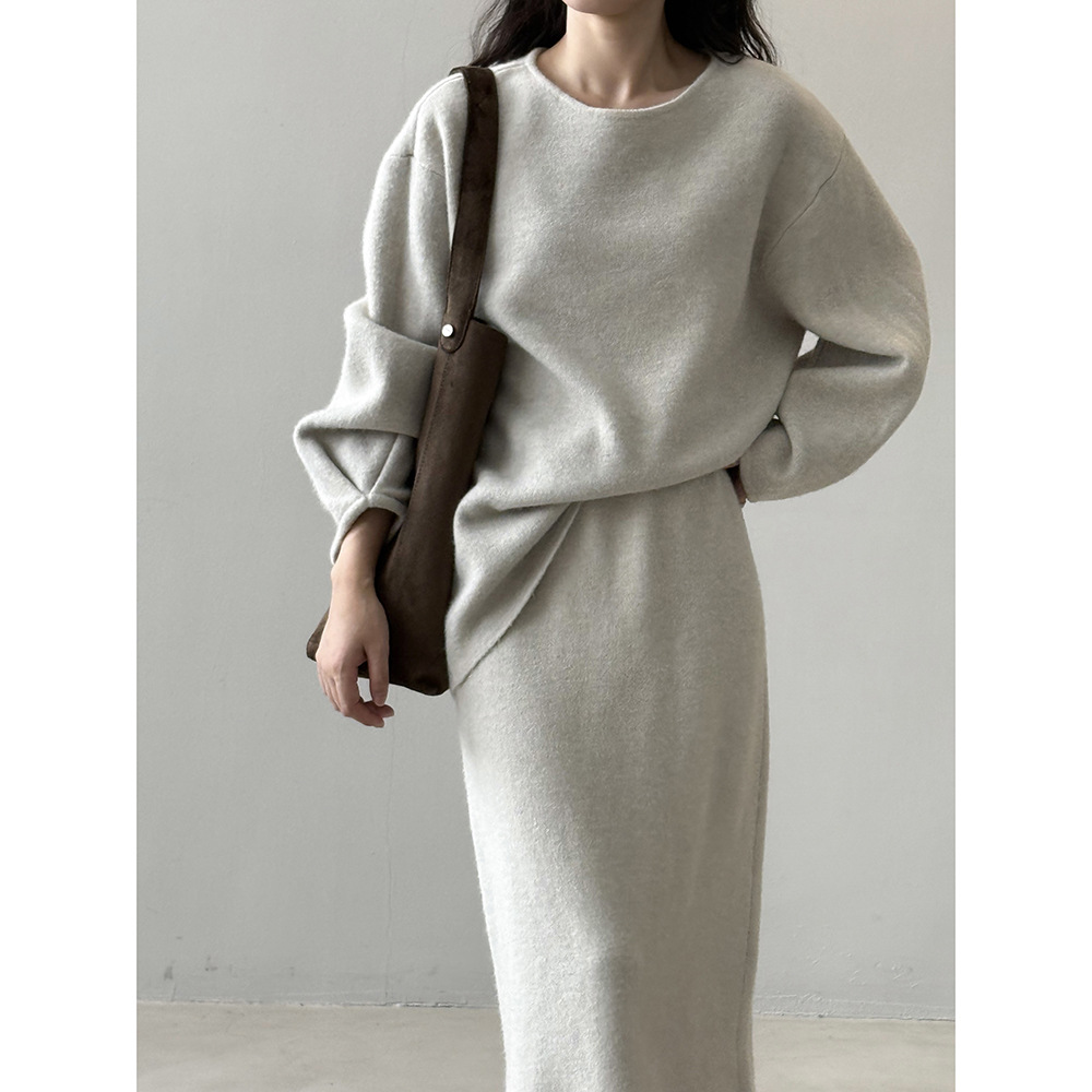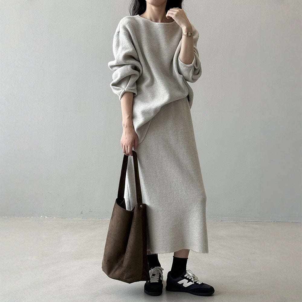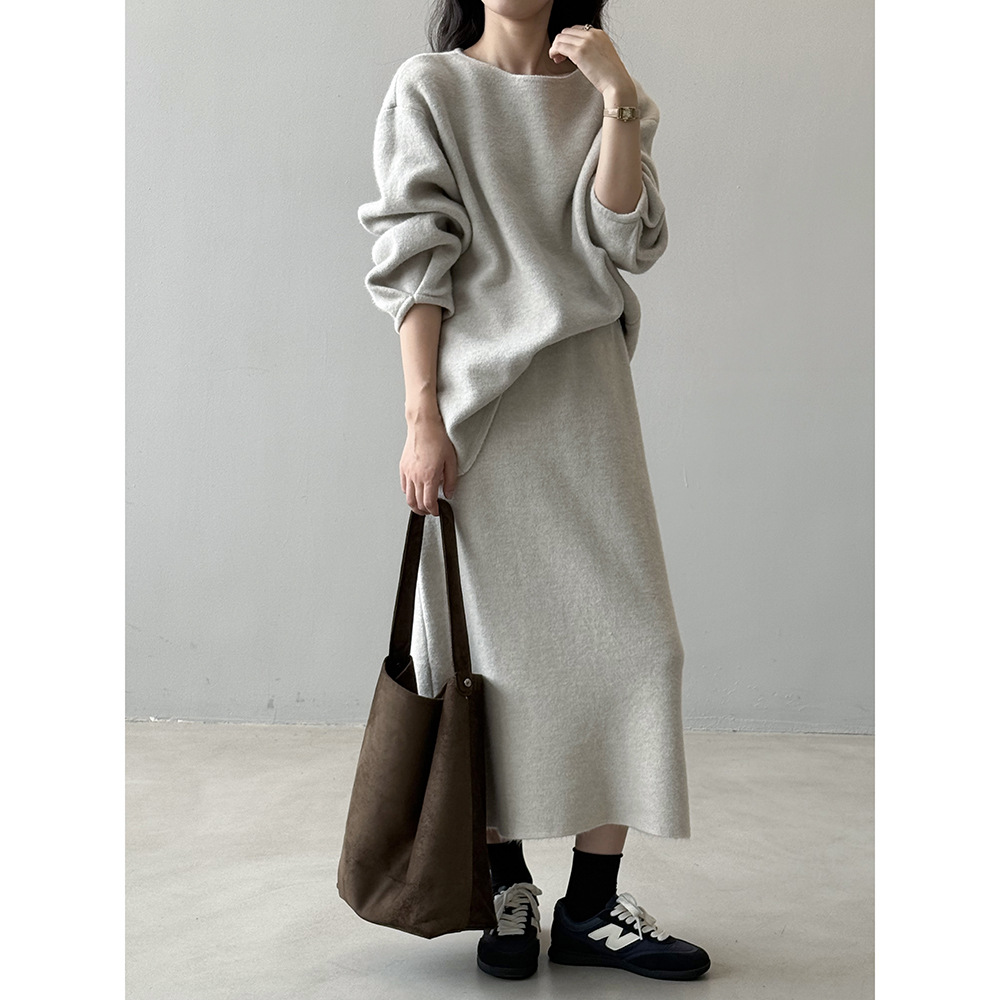 【セットアップ】春 秋 冬 ラウンドネック セーター + 着痩せ効果 スカート 2点上下セット 【SNシリーズ】
