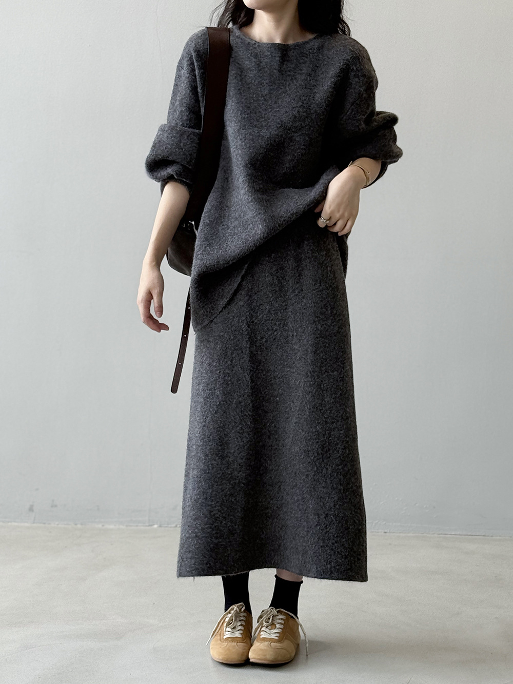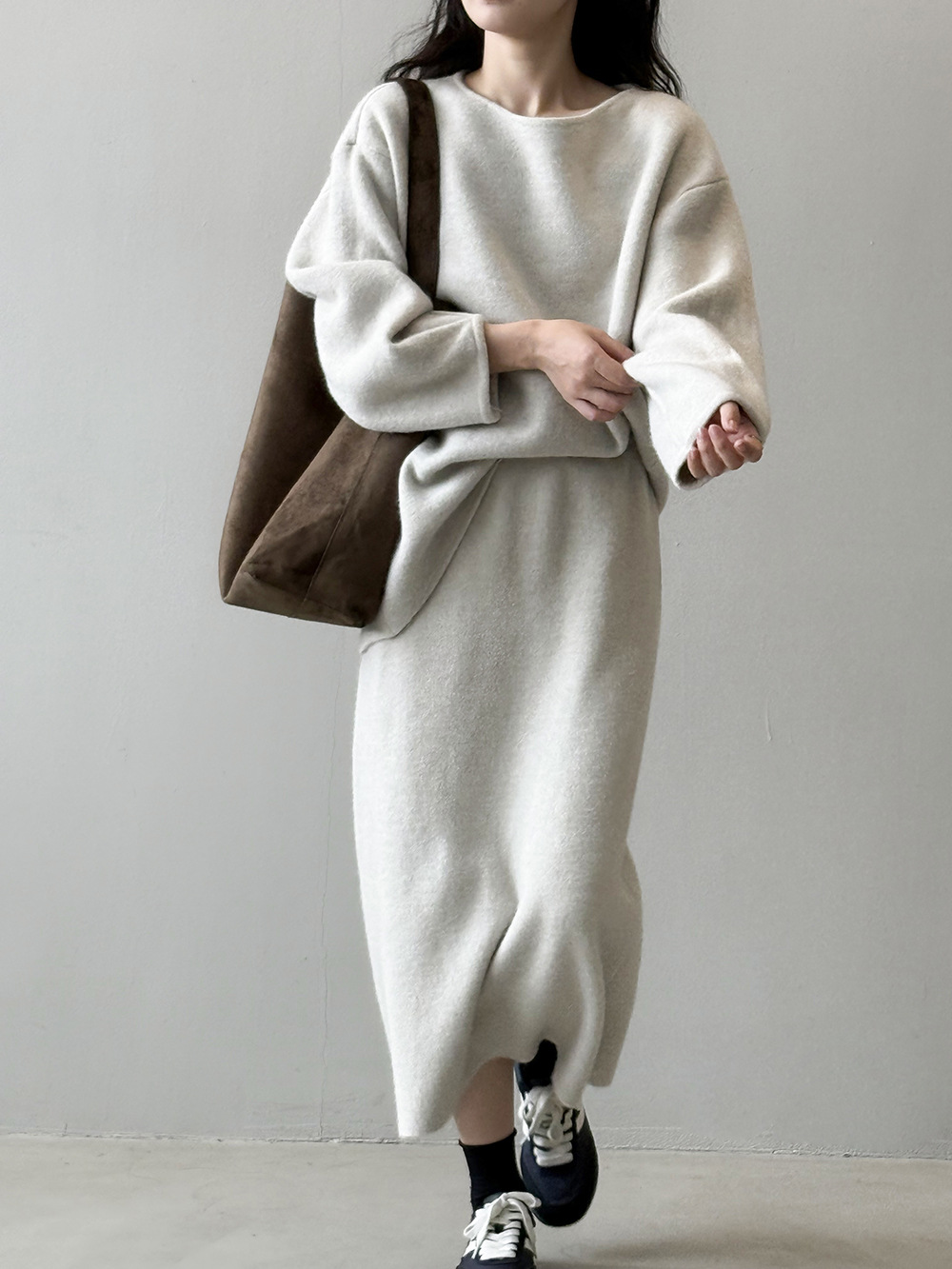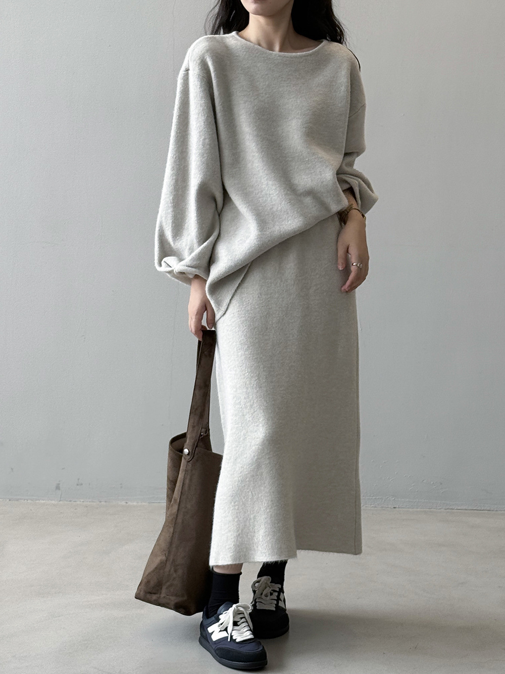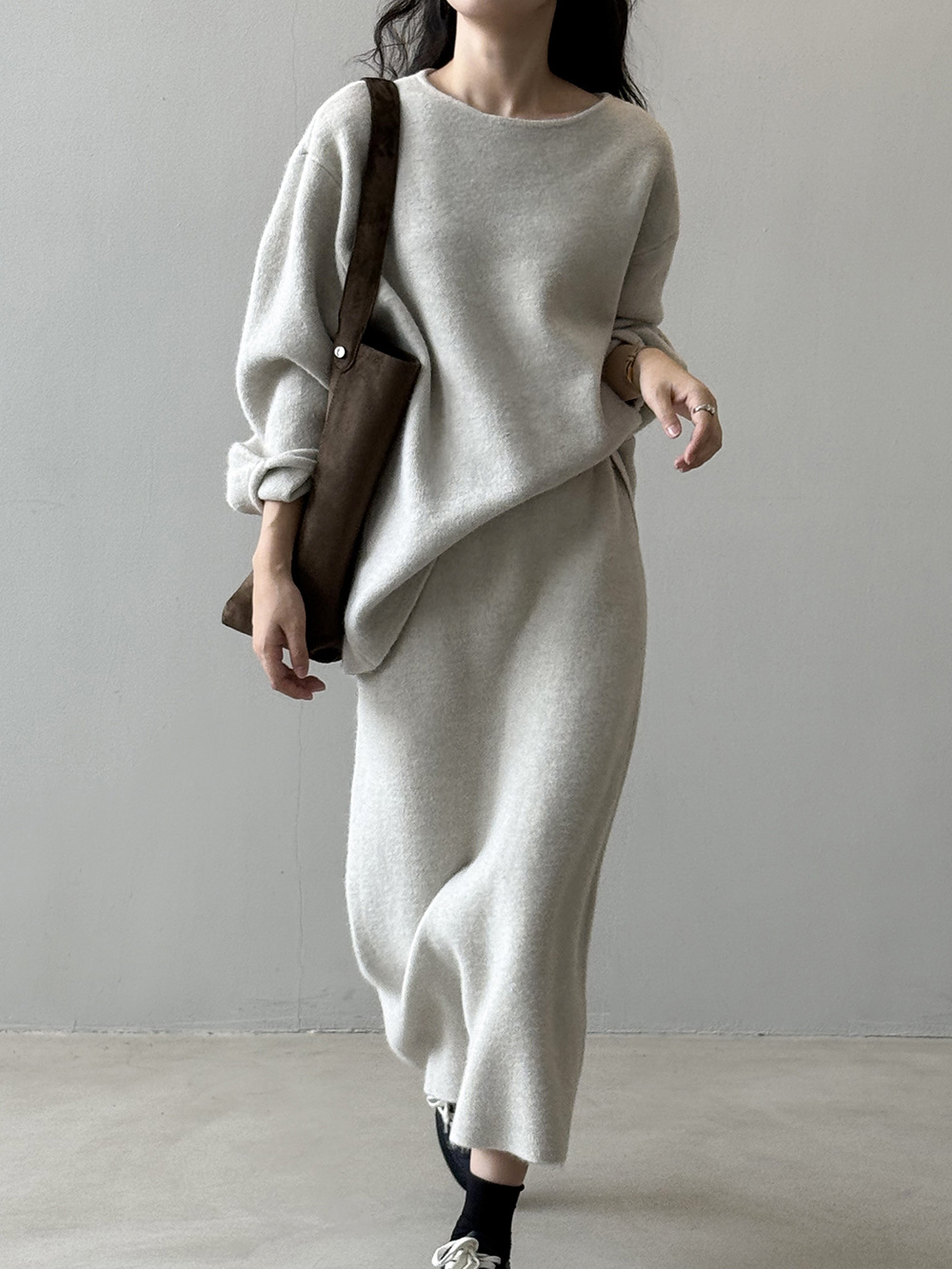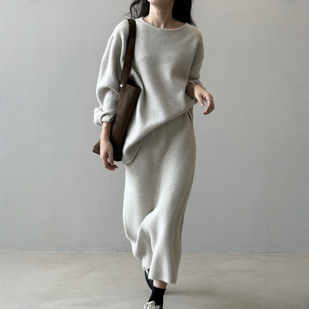 【セットアップ】春 秋 冬 ラウンドネック セーター + 着痩せ効果 スカート 2点上下セット 【SNシリーズ】