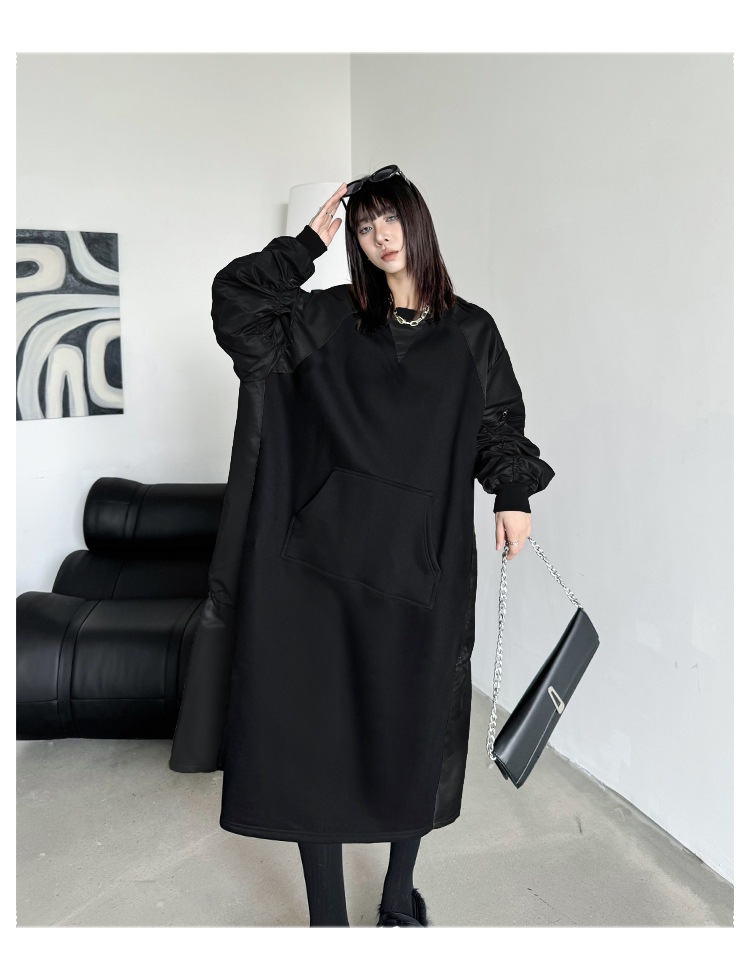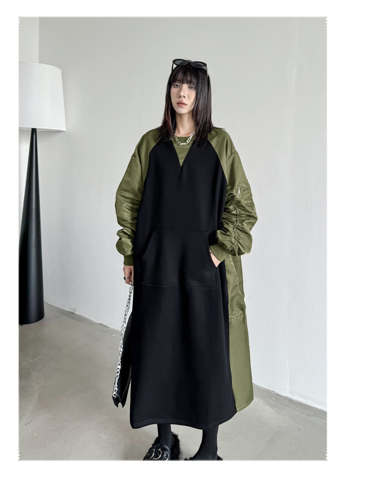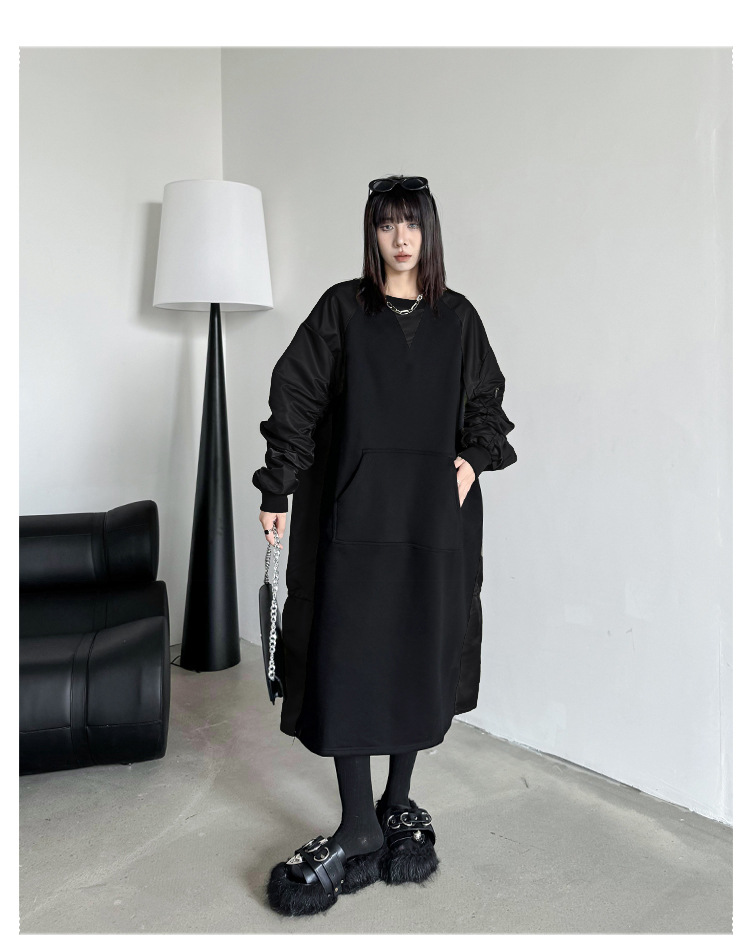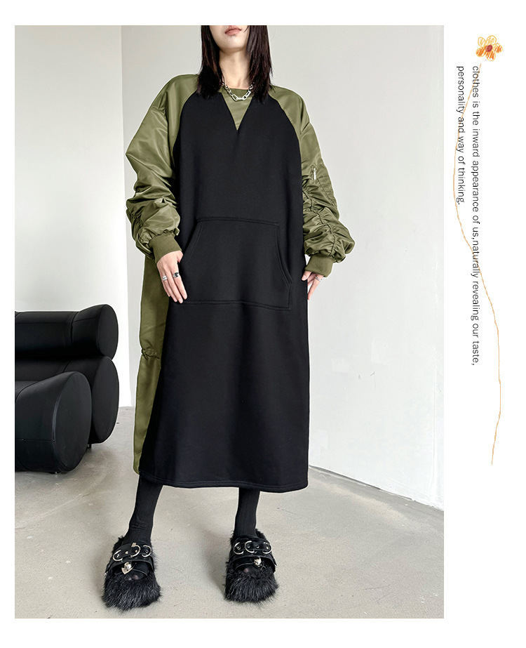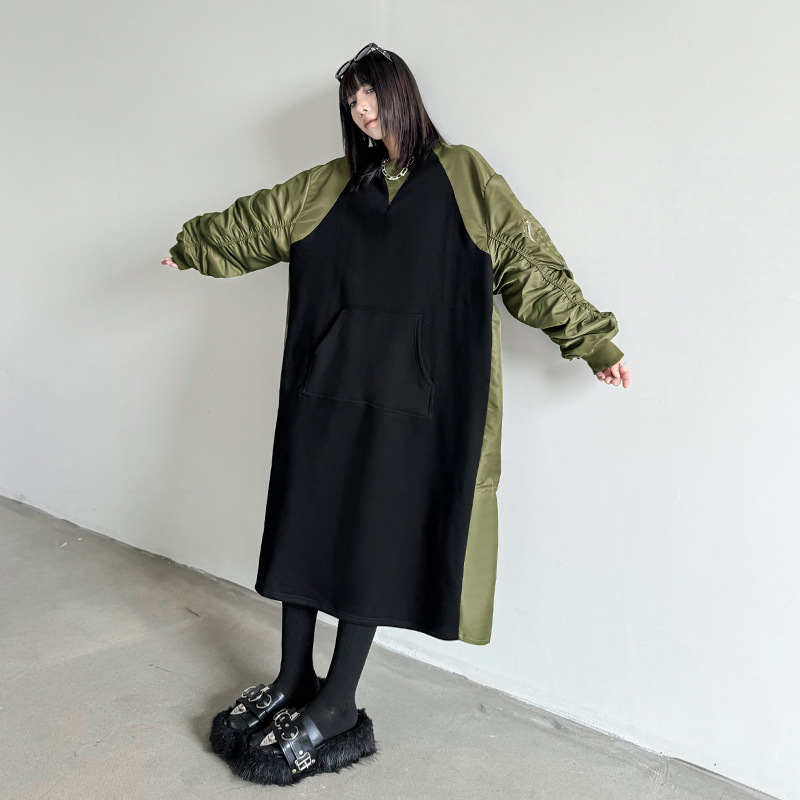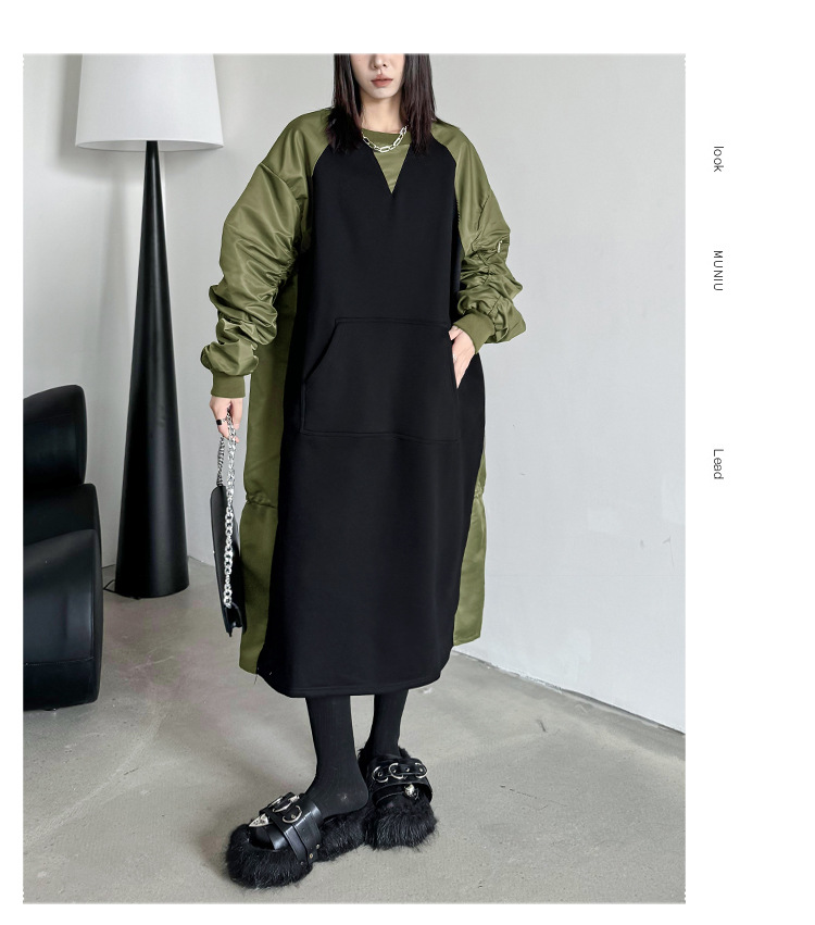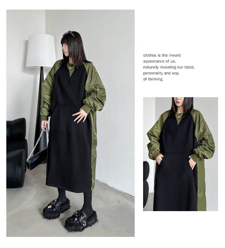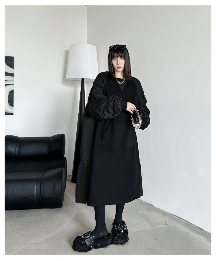 【商品名】【ワンピース】春 秋 冬 クルーネック プリーツ配色切替 長袖 ワンピース 【AHシリーズ】