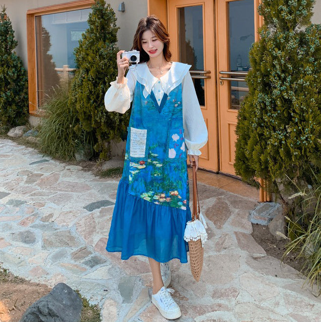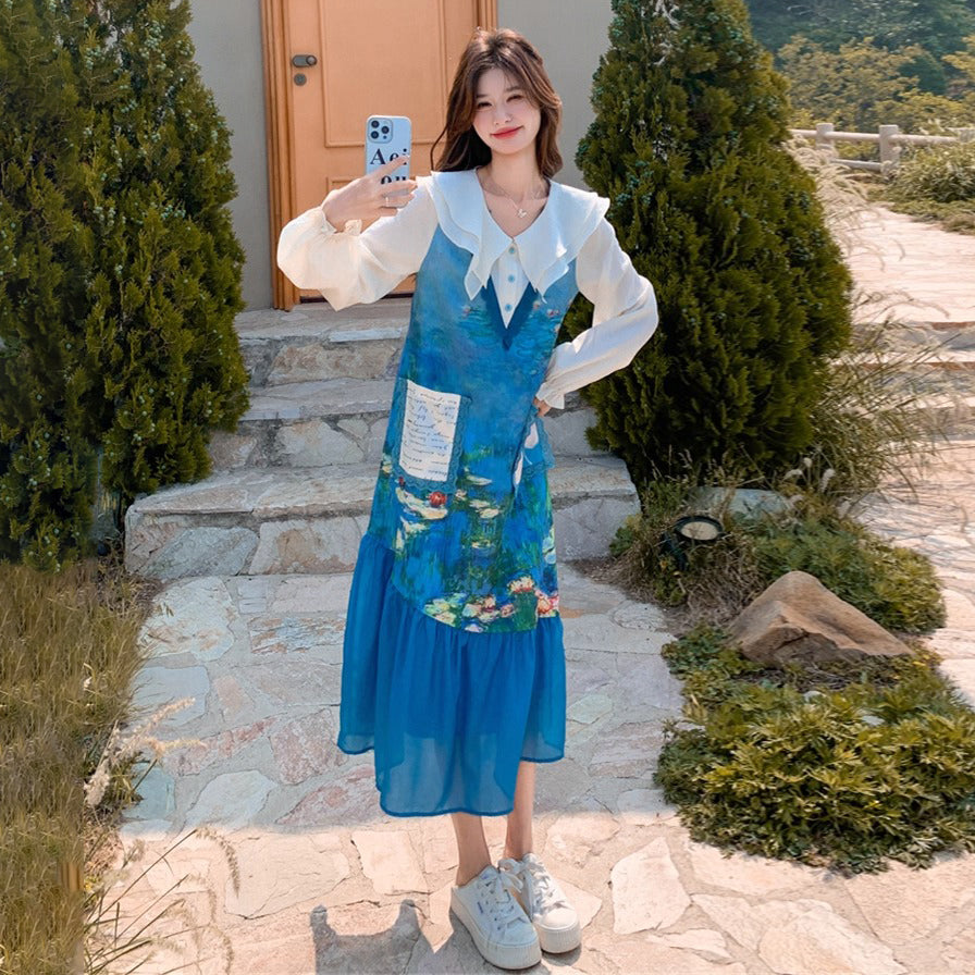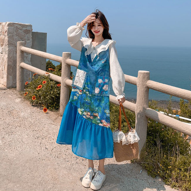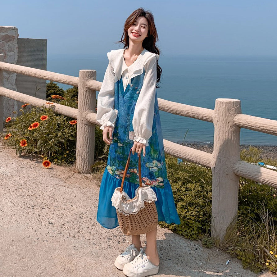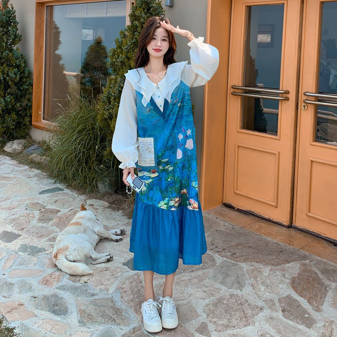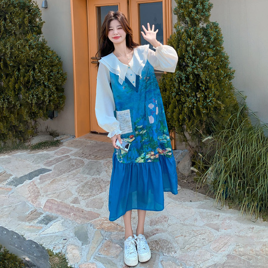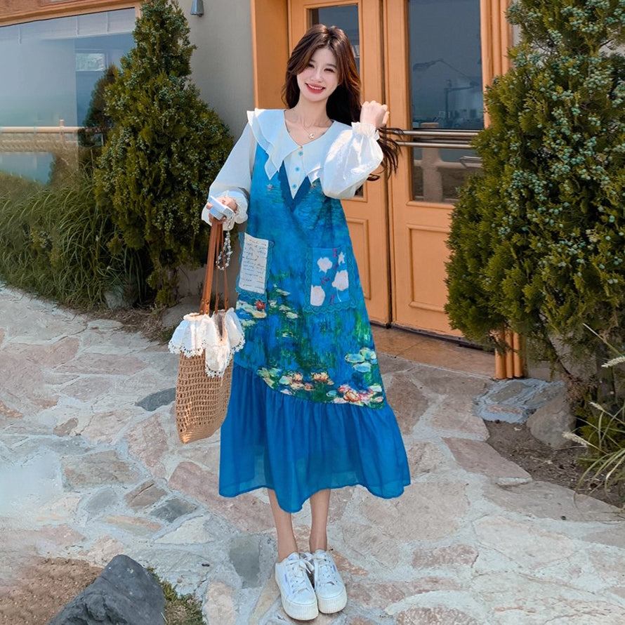 【ワンピース】フレンチレトロ 切替デザイン 大ポケット 長袖 ワンピース 秋新作 ゆったり 【JZシリーズ】