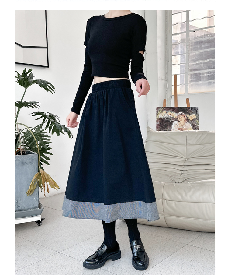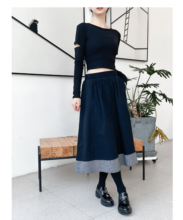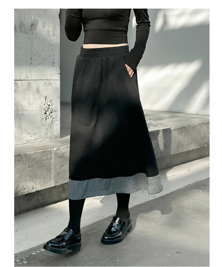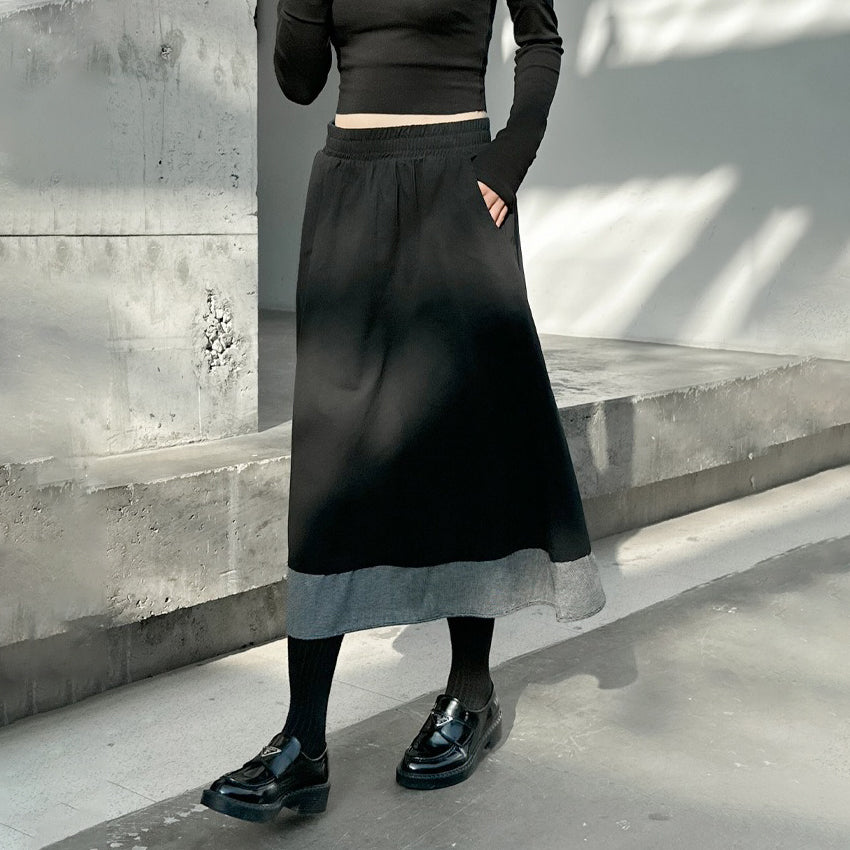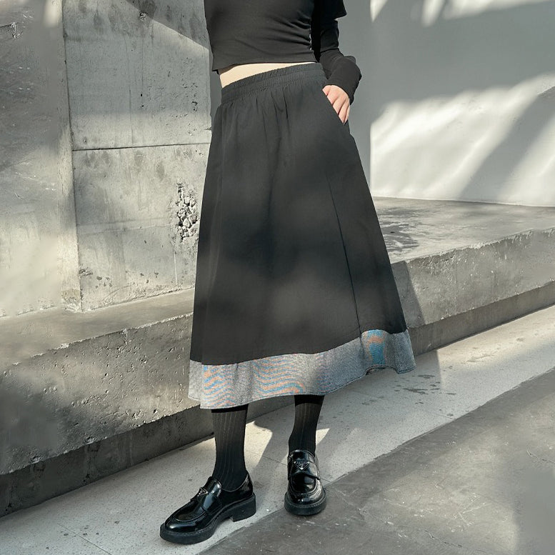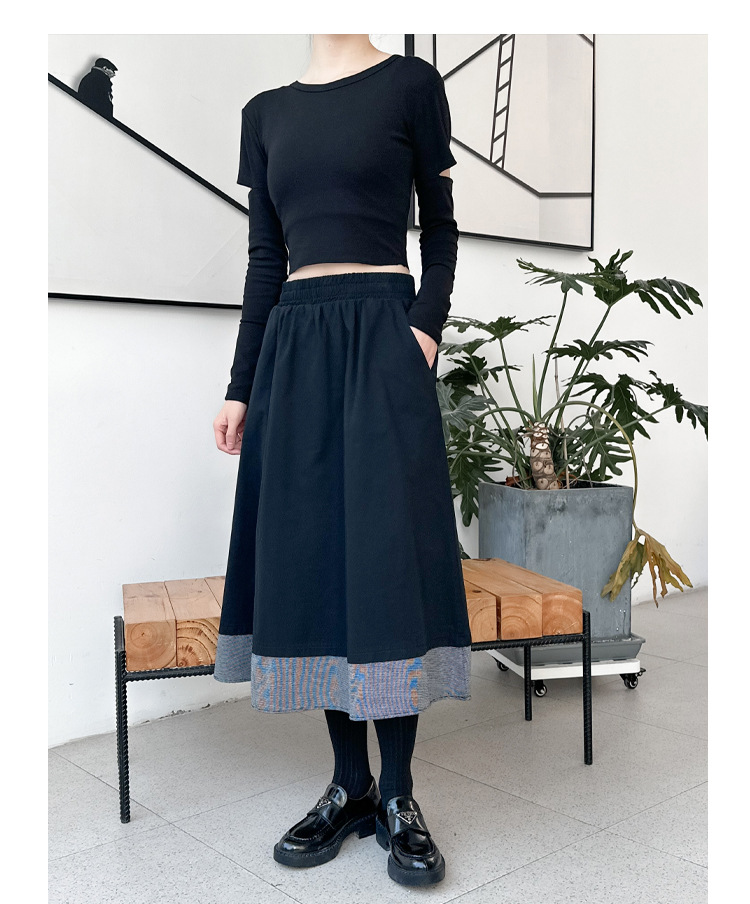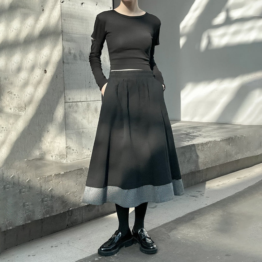 【ボトムス】秋冬 フレンチスタイル チェック柄 切り替え 配色 ブラック ミディ丈 Aライン フレアスカート ウエストゴム すっきり見え【JZシリーズ】