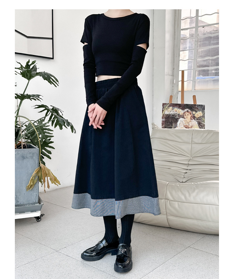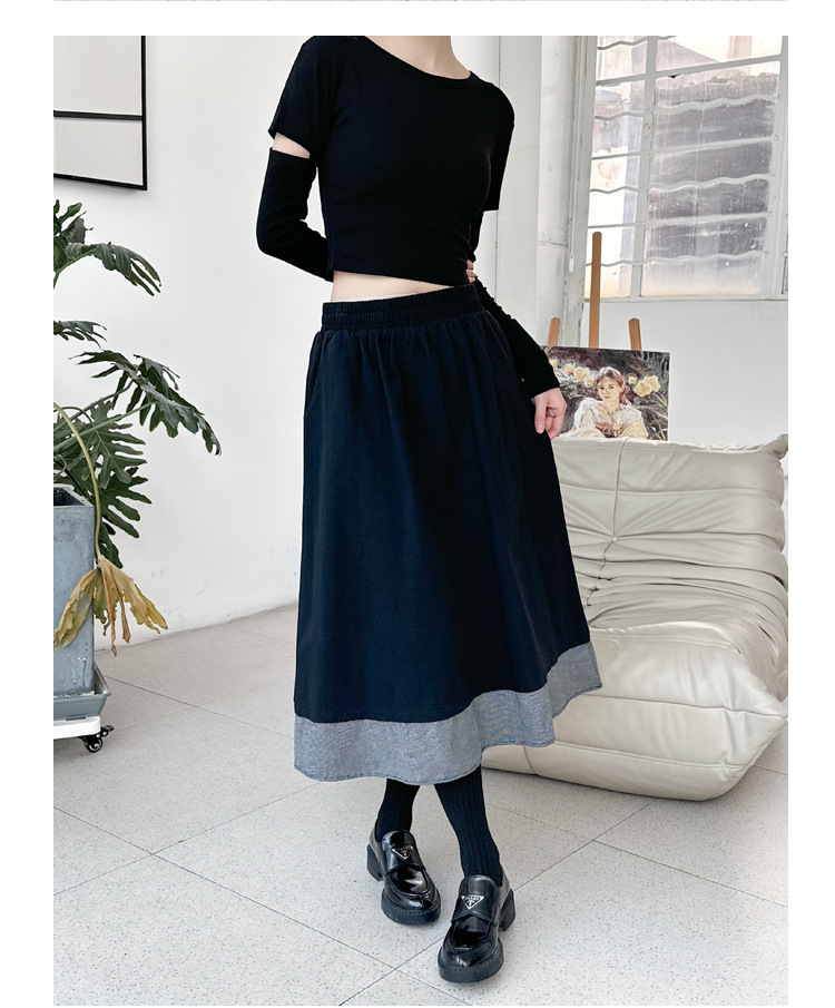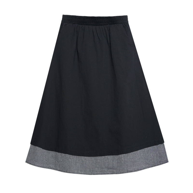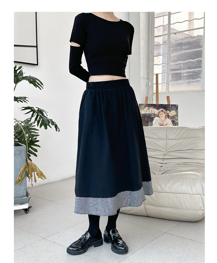 【商品名】【ボトムス】秋冬 フレンチスタイル チェック柄 切り替え 配色 ブラック ミディ丈 Aライン フレアスカート ウエストゴム すっきり見え【JZシリーズ】
