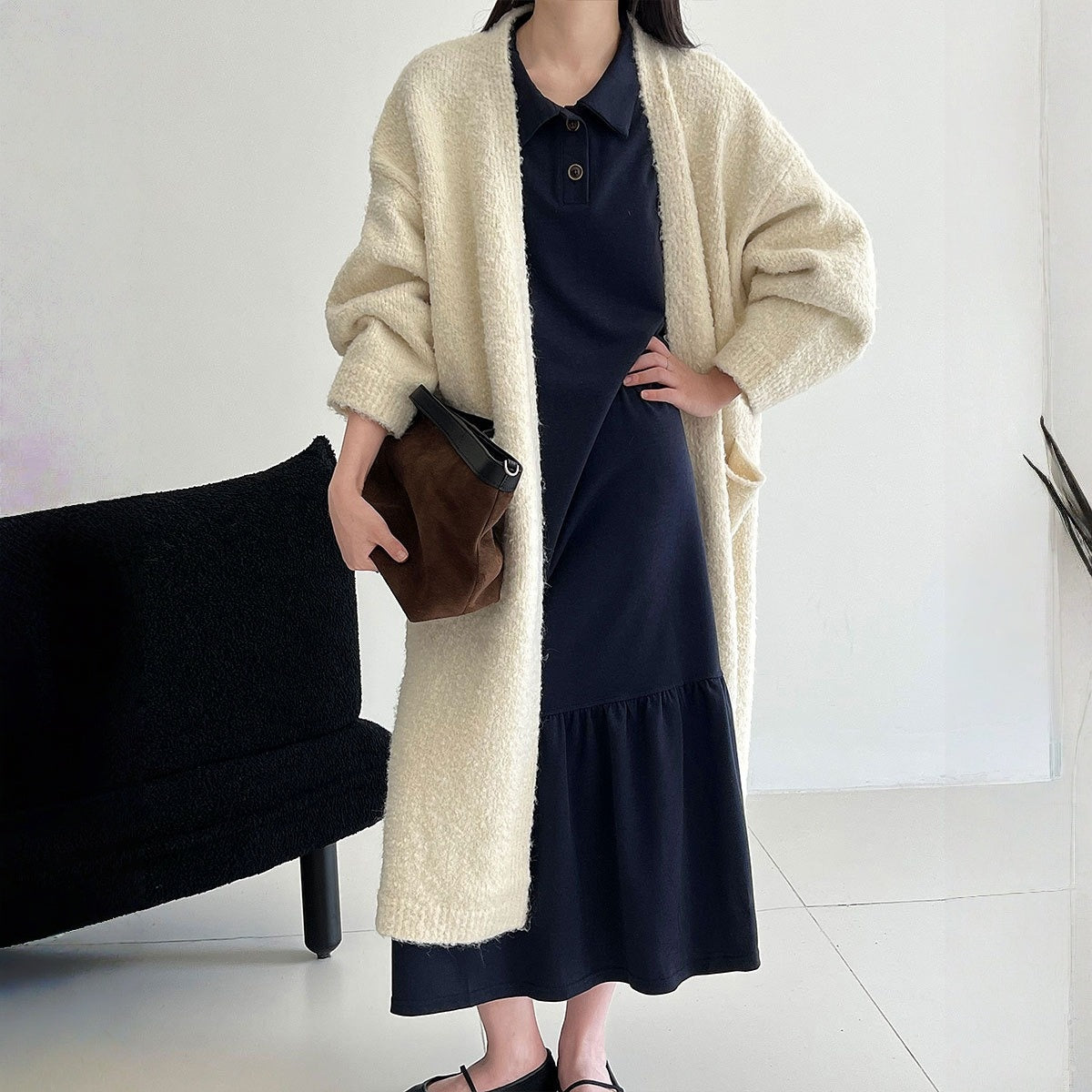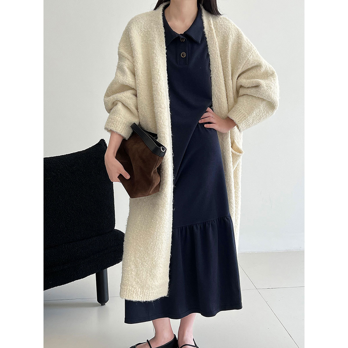 【ワンピース】細見え 日系 Vネック 無地 長袖ワンピース 切替デザイン ゆったり 気質ロング【JZシリーズ】【AHシリーズ】