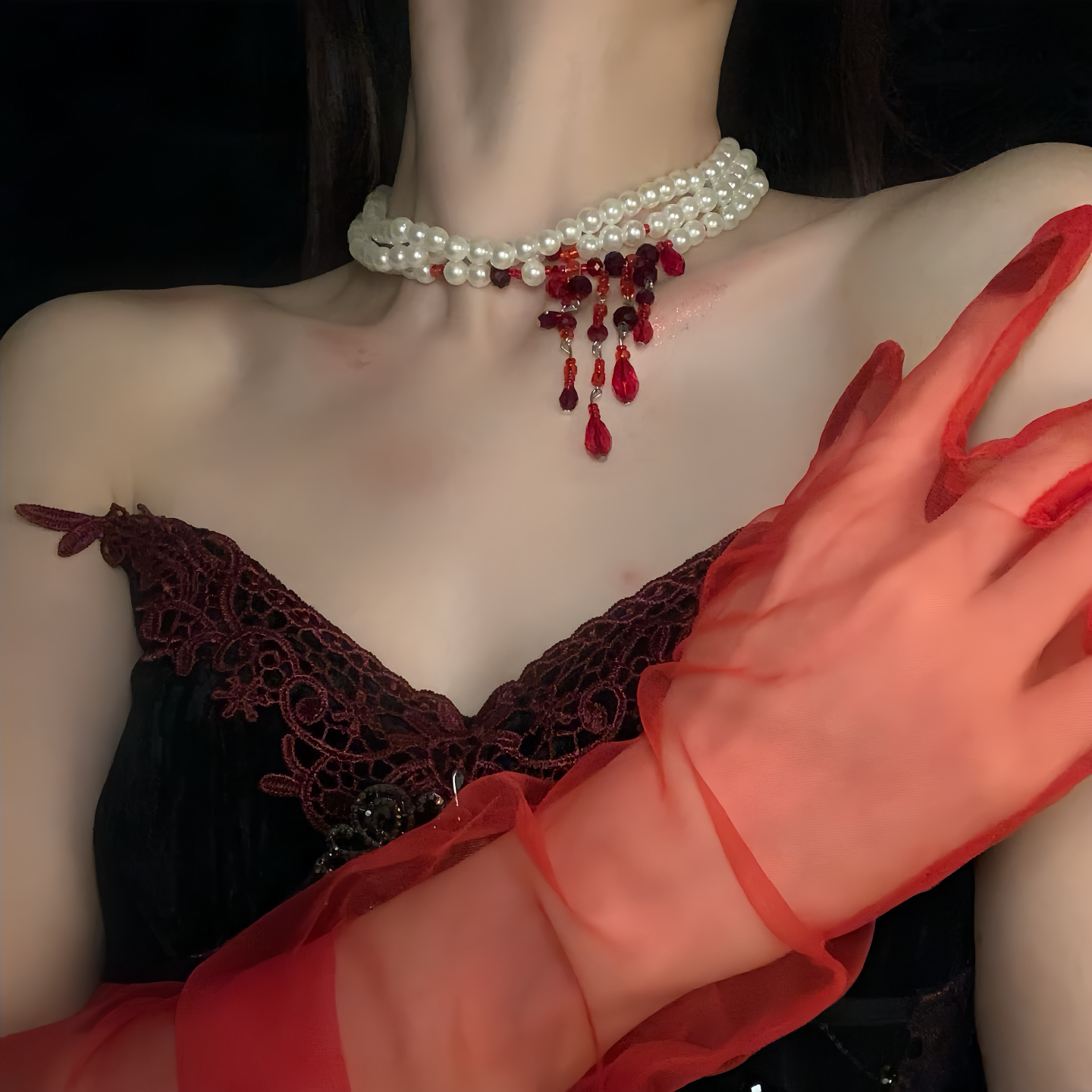【ハロウィン】ゴシック風 血糊パール フリンジチョーカー ダークアクセサリー ネックレス