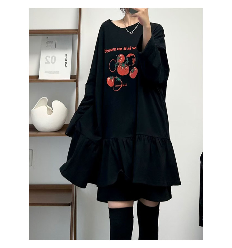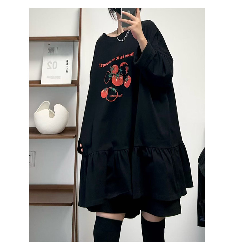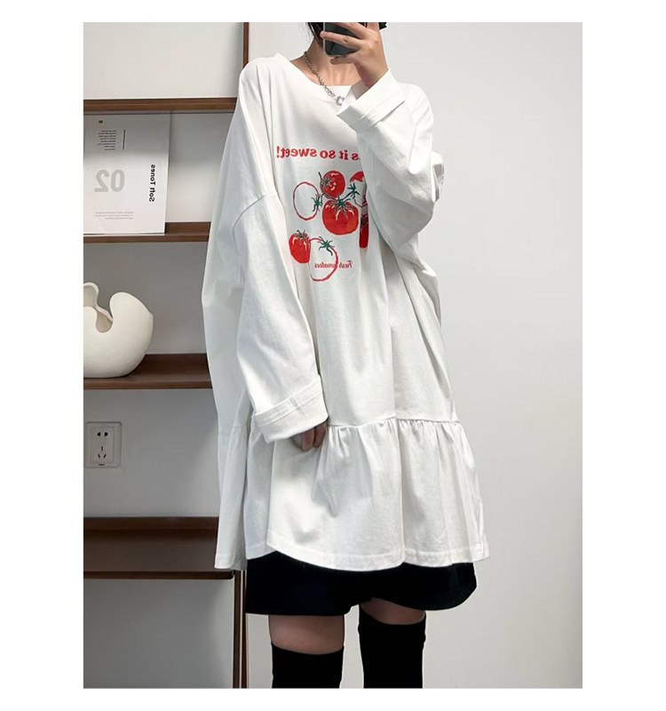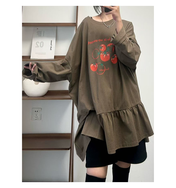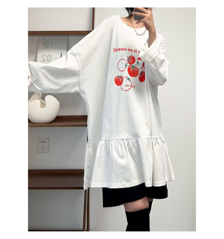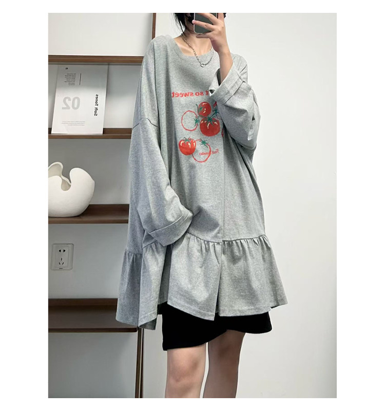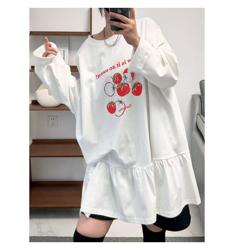 【商品名】【トップス】ゆったり 丸首 長袖 Tシャツ コットン トマトプリント 切替【JZシリーズ】