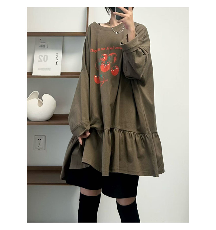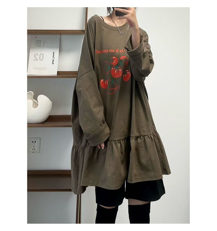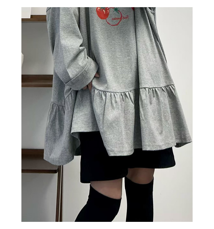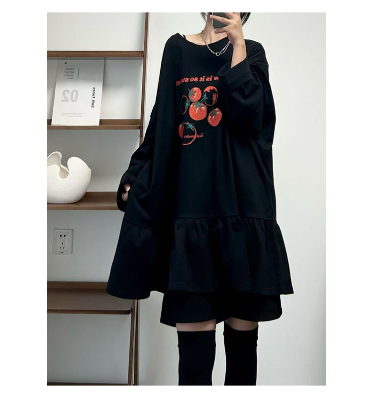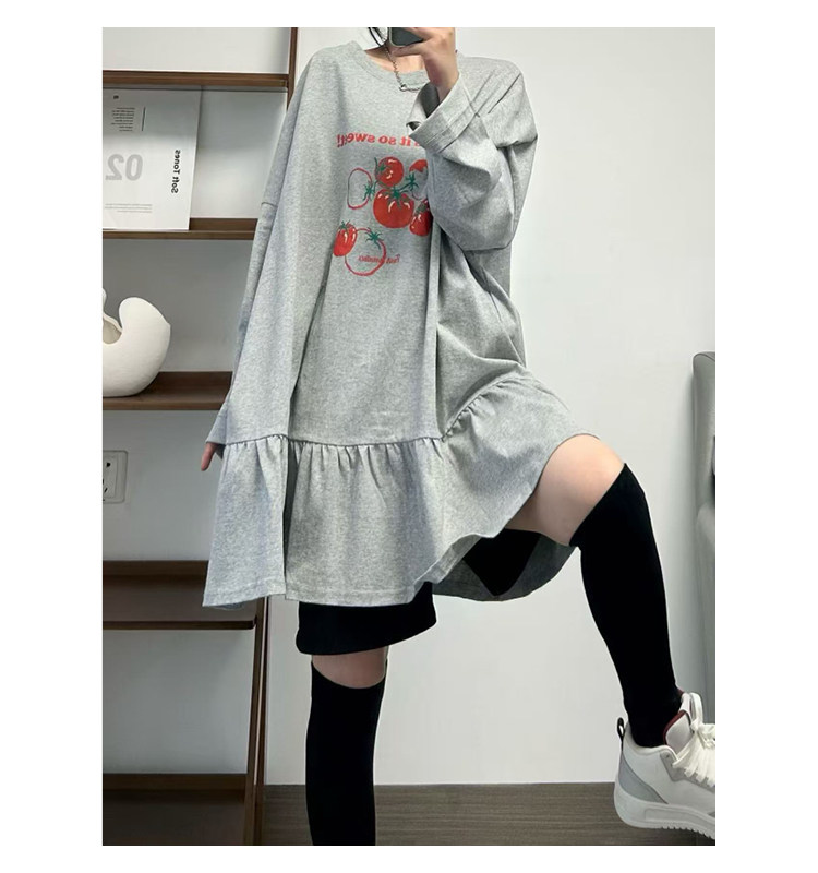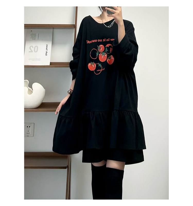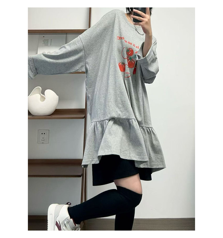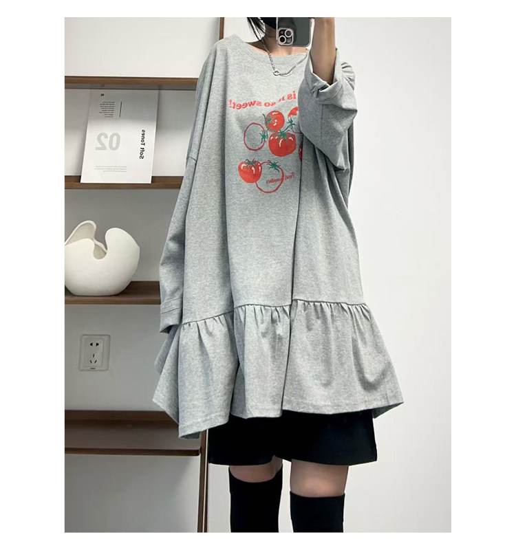 【商品名】【トップス】ゆったり 丸首 長袖 Tシャツ コットン トマトプリント 切替【JZシリーズ】