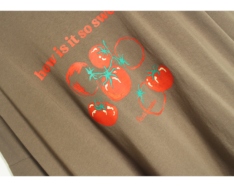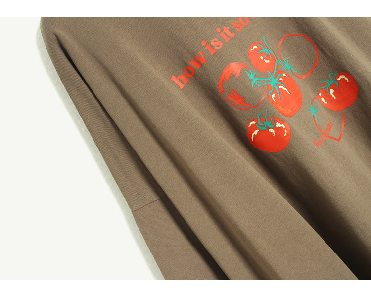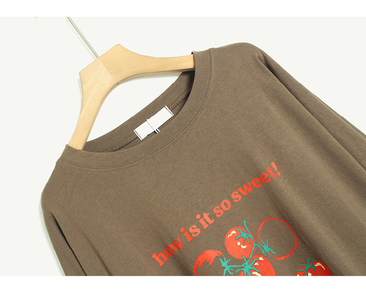 【トップス】ゆったり 丸首 長袖 Tシャツ コットン トマトプリント 切替【JZシリーズ】