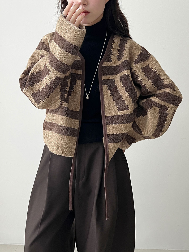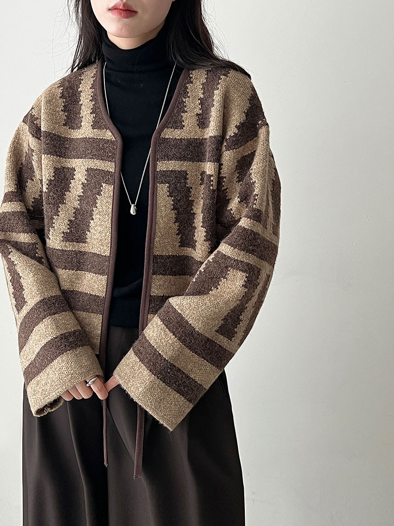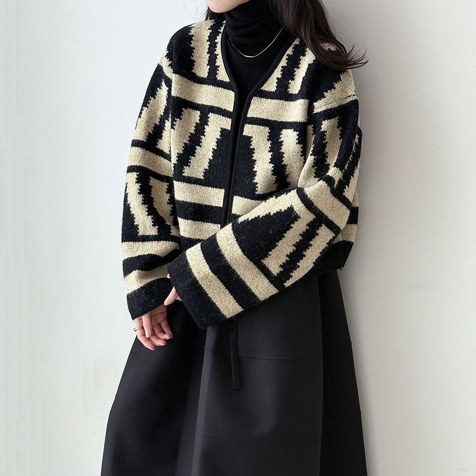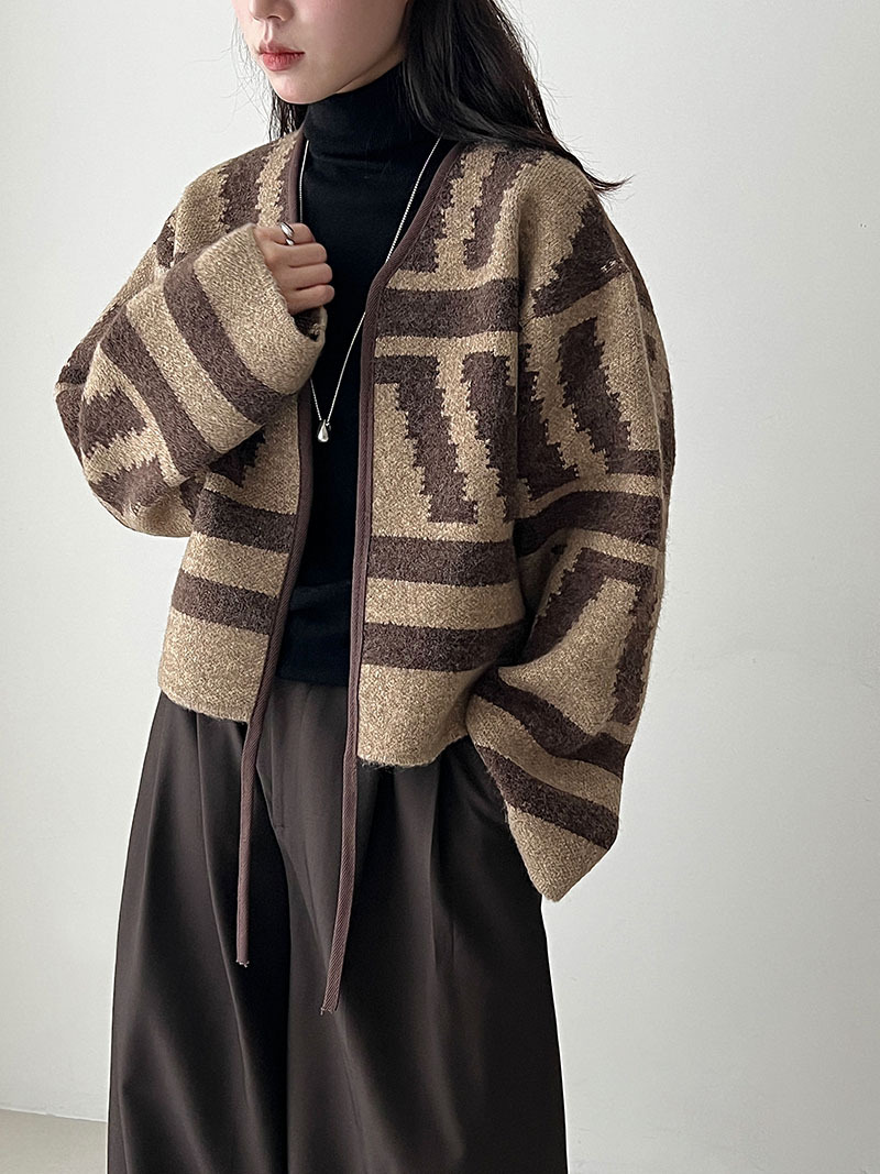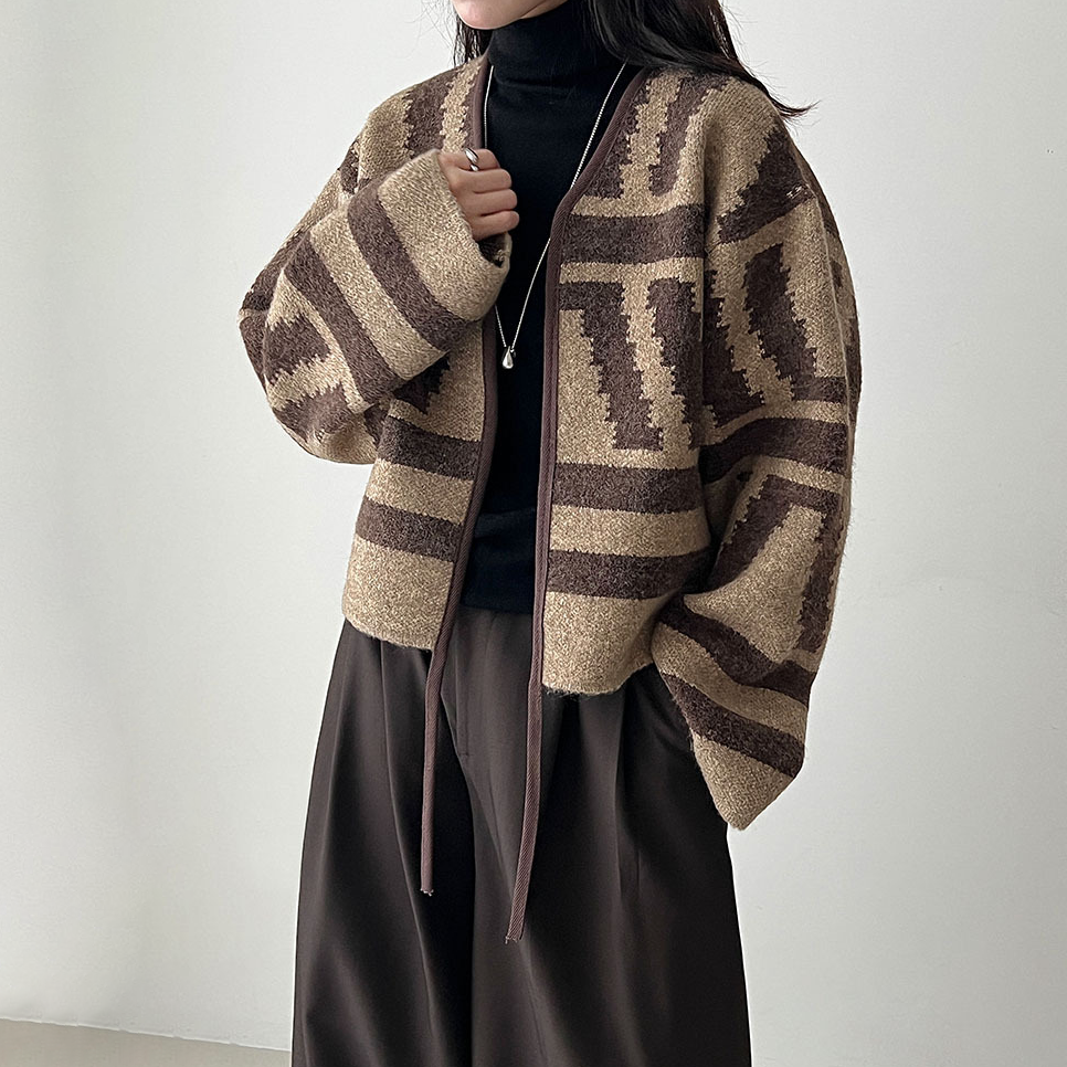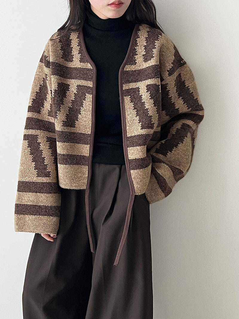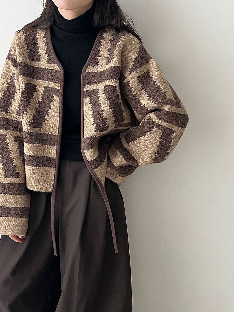 【アウター】秋新作 幾何柄 ニットカーディガン レディース レトロ ゆったり ショート丈【JZシリーズ】