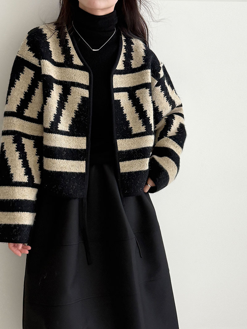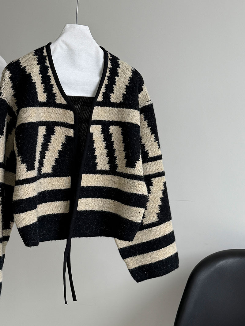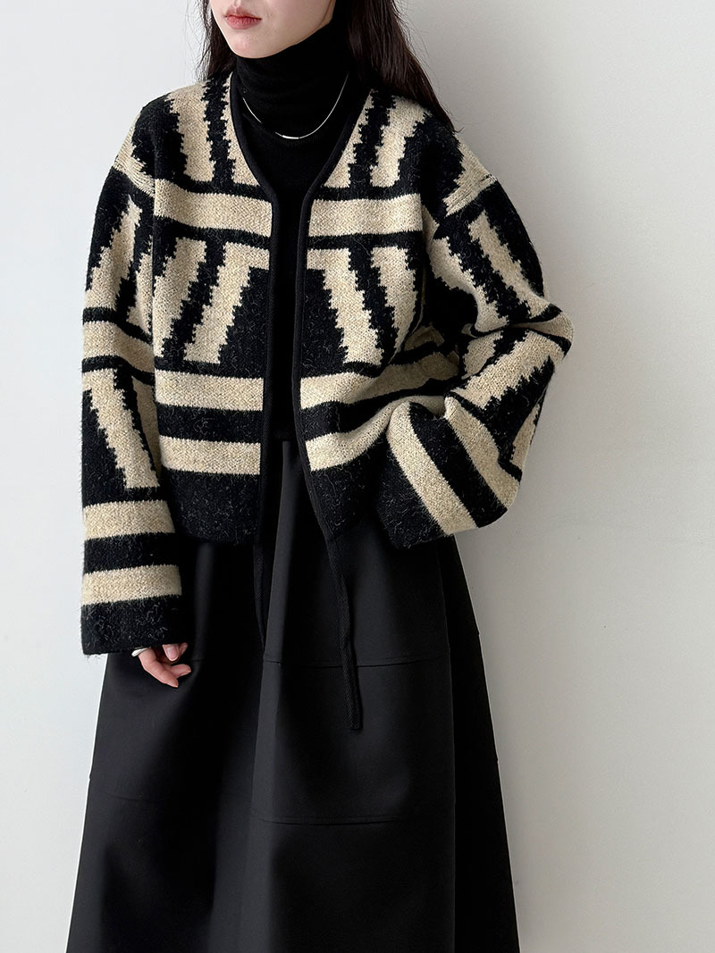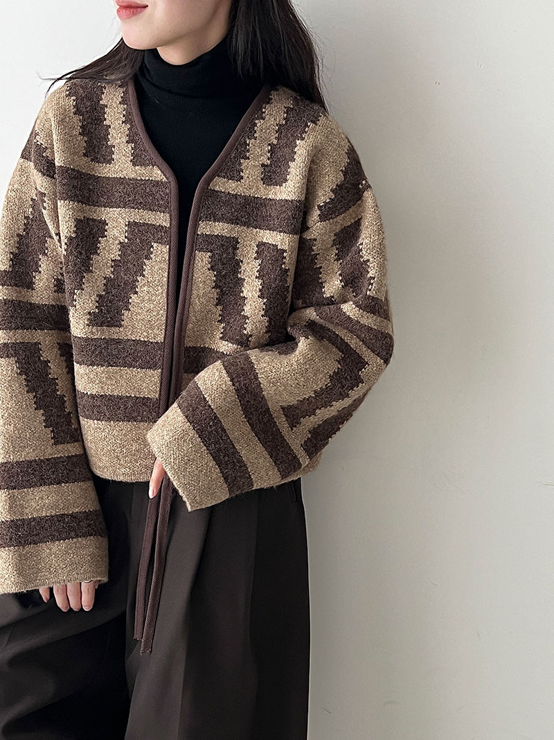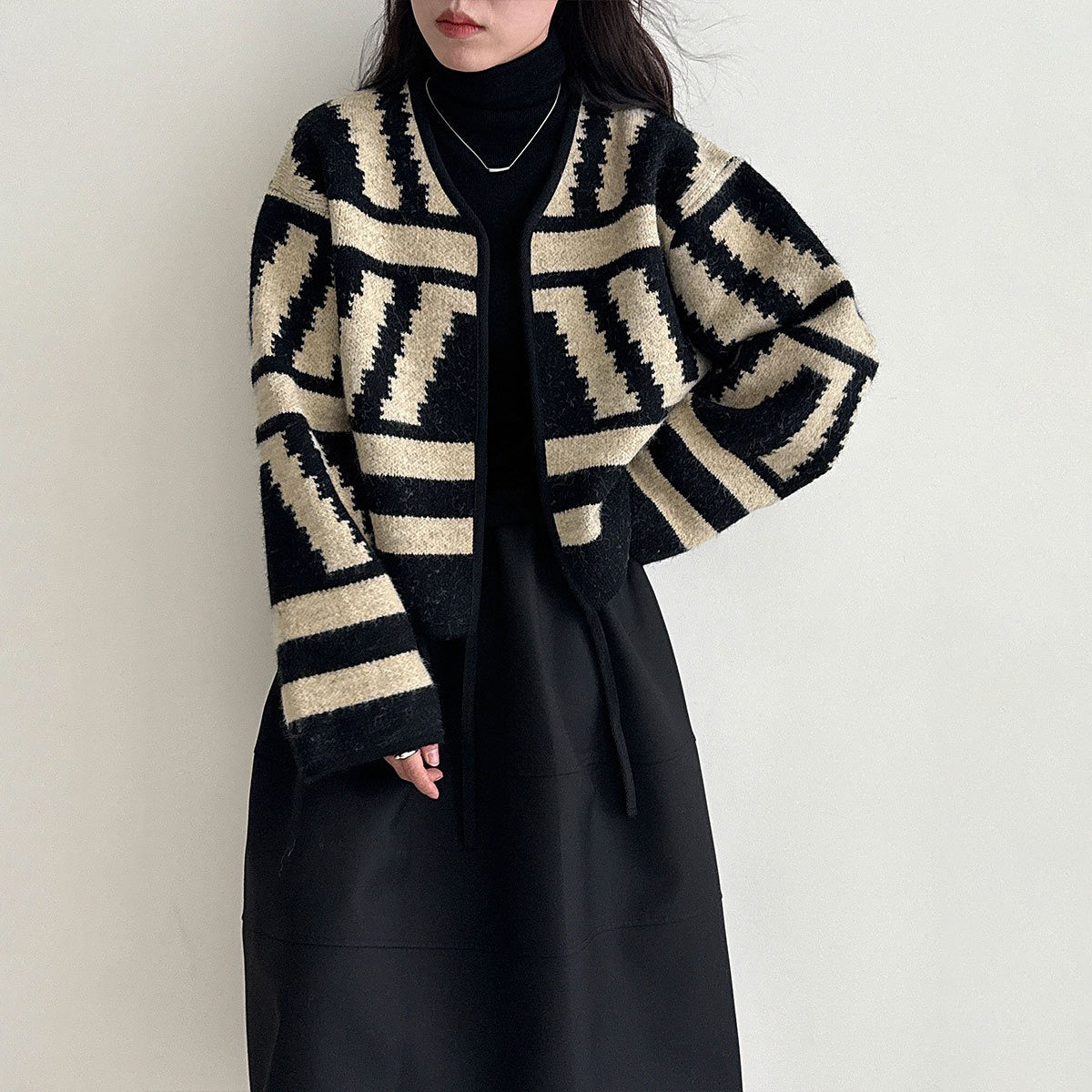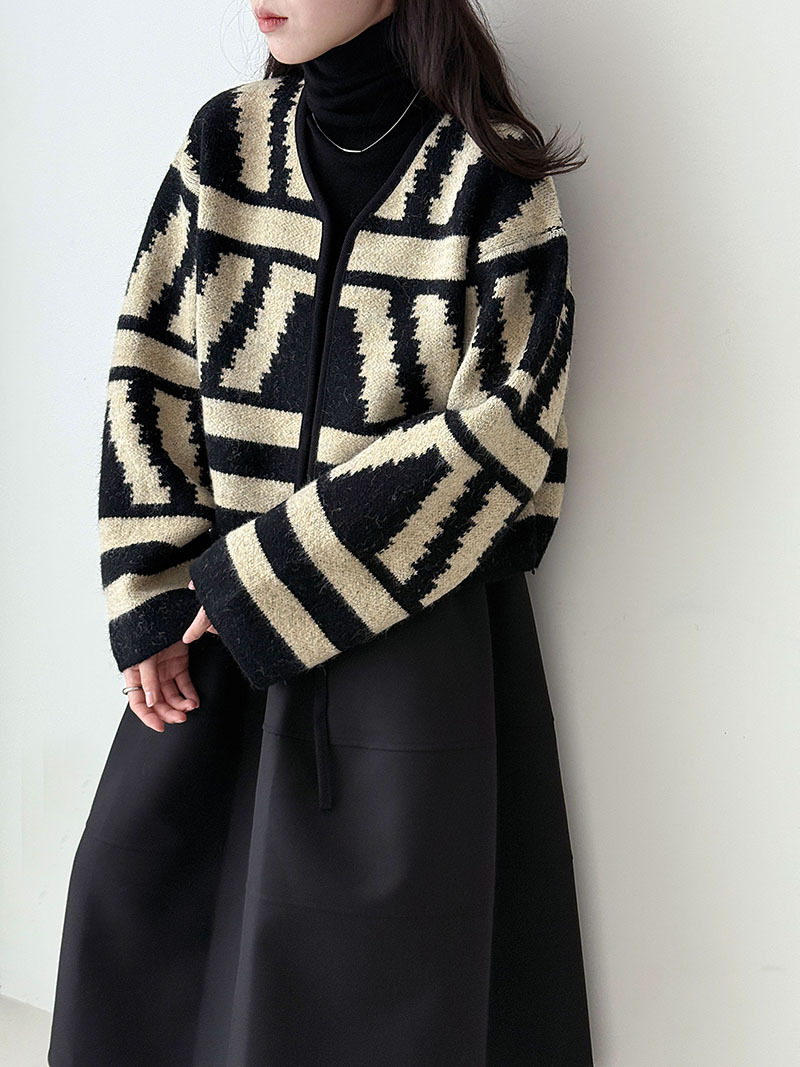 【アウター】秋新作 幾何柄 ニットカーディガン レディース レトロ ゆったり ショート丈【JZシリーズ】