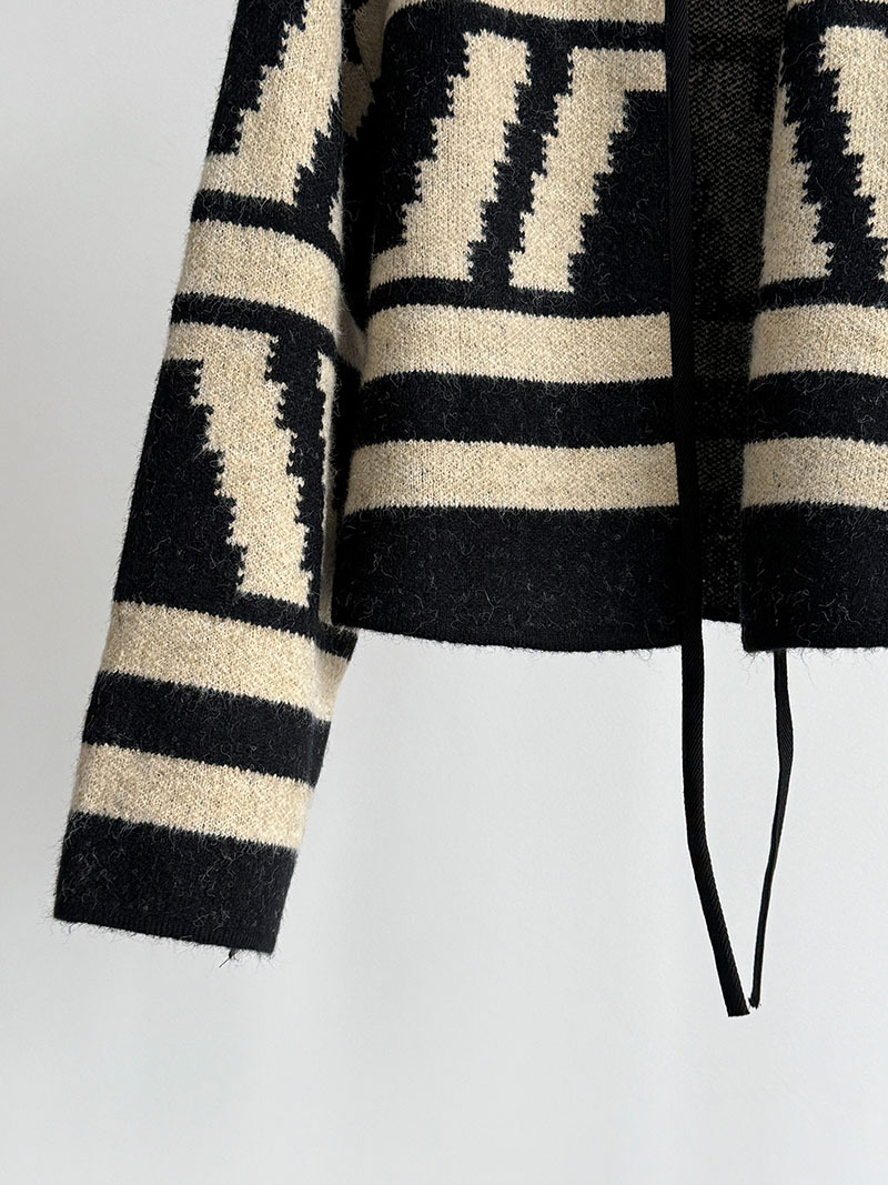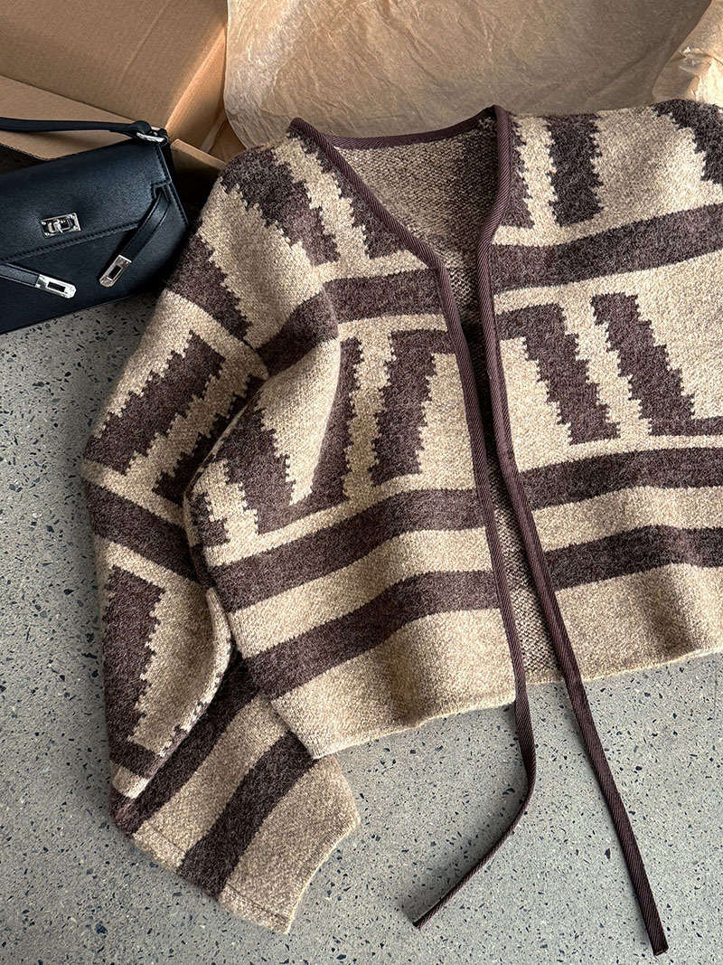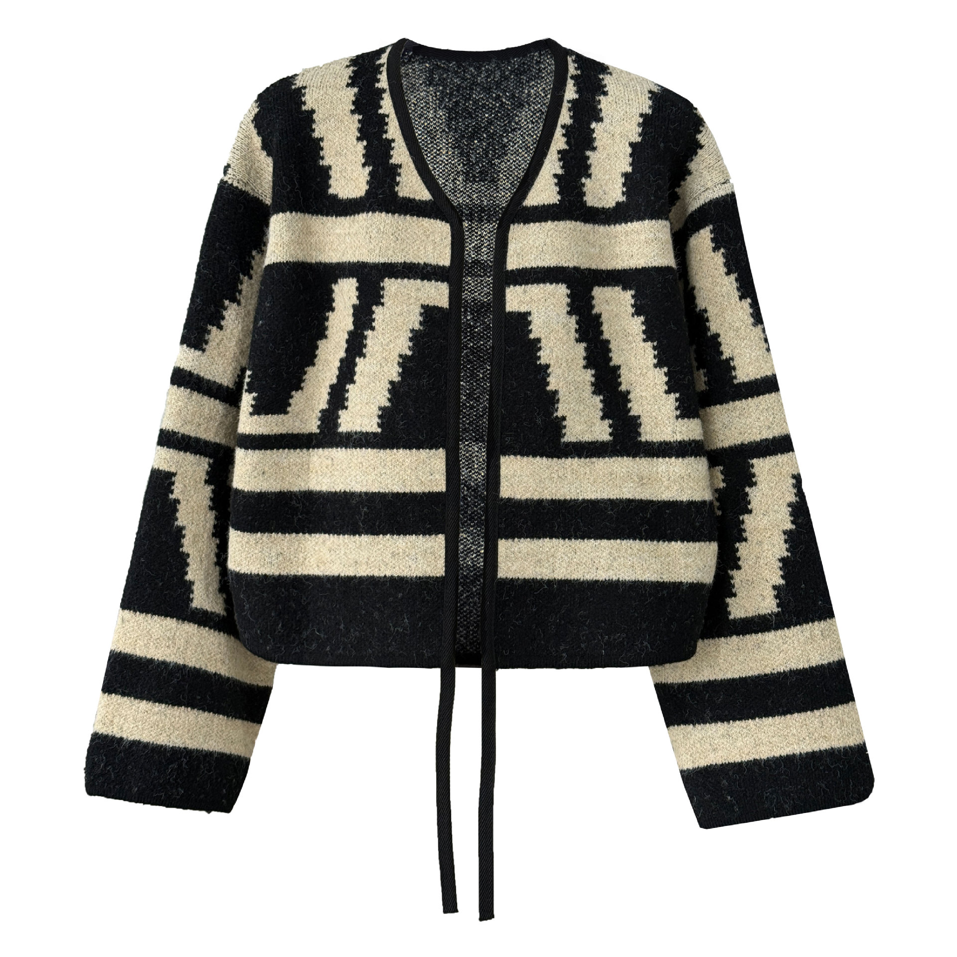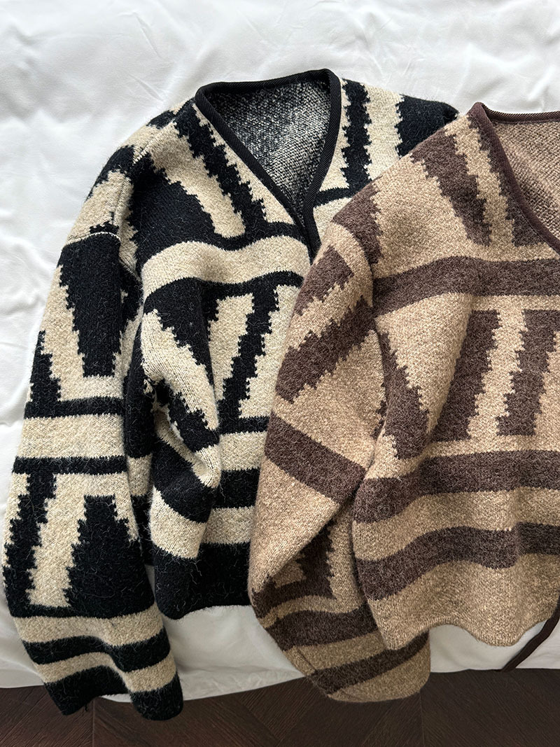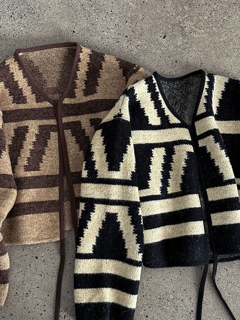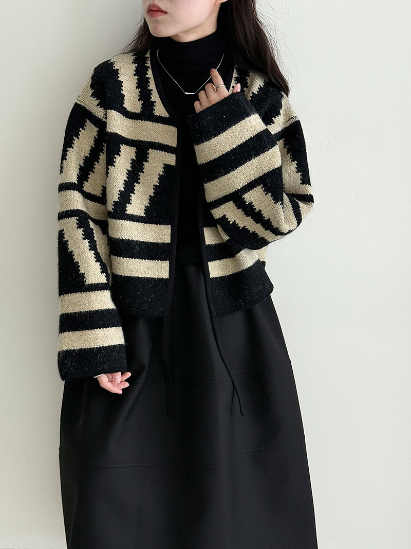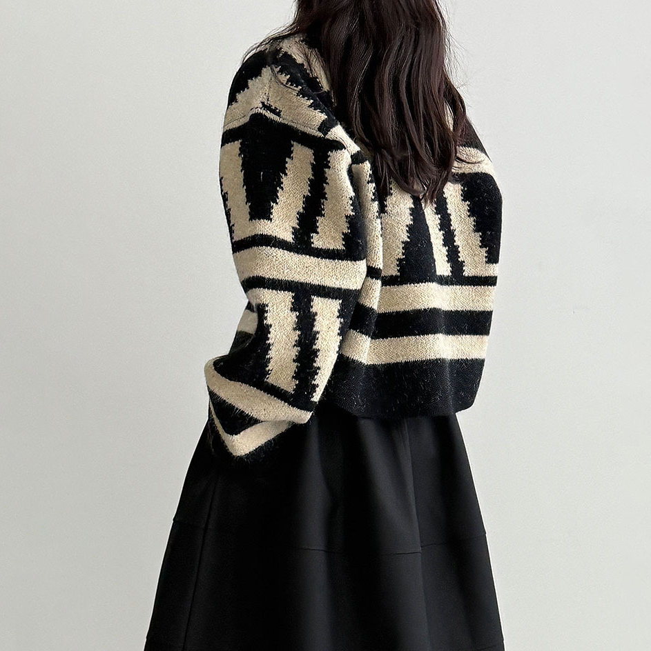【アウター】秋新作 幾何柄 ニットカーディガン レディース レトロ ゆったり ショート丈【JZシリーズ】