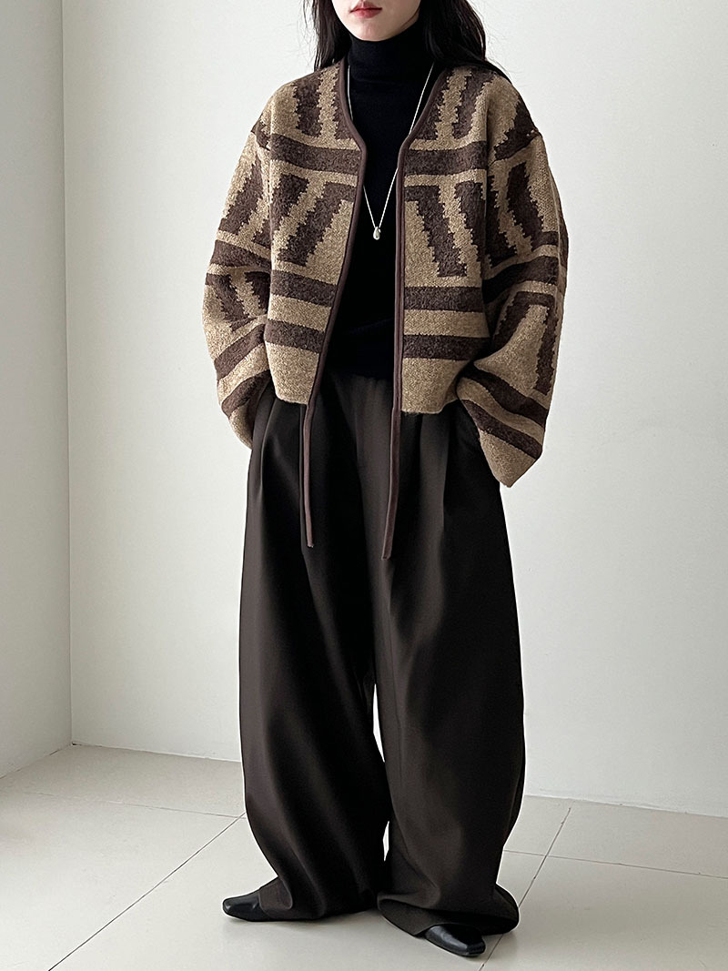 【商品名】【アウター】秋新作 幾何柄 ニットカーディガン レディース レトロ ゆったり ショート丈【JZシリーズ】
