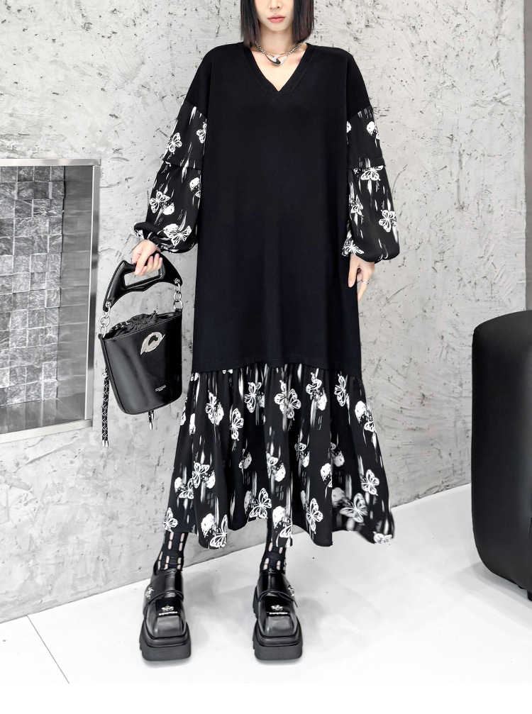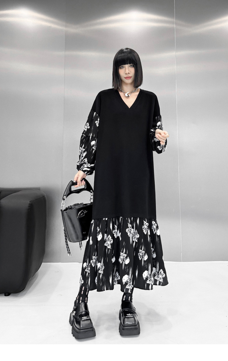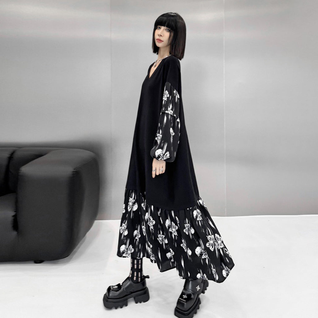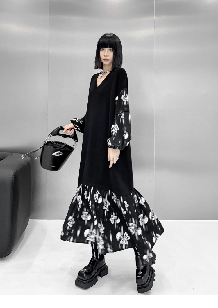 【ワンピース】細見え 日系 Vネック 無地 長袖ワンピース 切替デザイン ゆったり 気質ロング【JZシリーズ】【AHシリーズ】