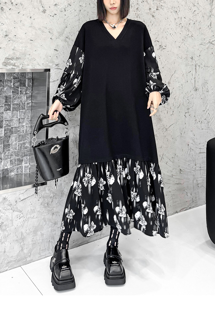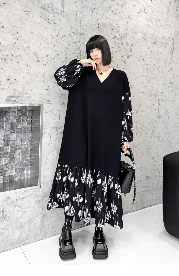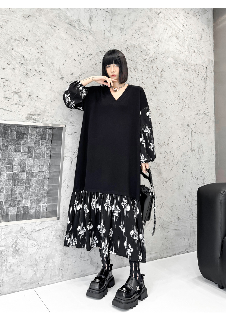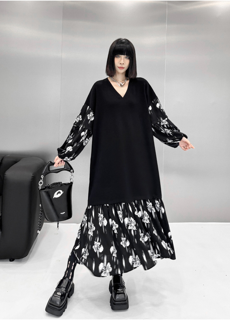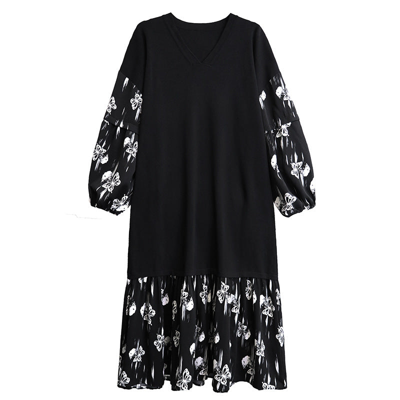 【ワンピース】細見え 日系 Vネック 無地 長袖ワンピース 切替デザイン ゆったり 気質ロング【JZシリーズ】【AHシリーズ】