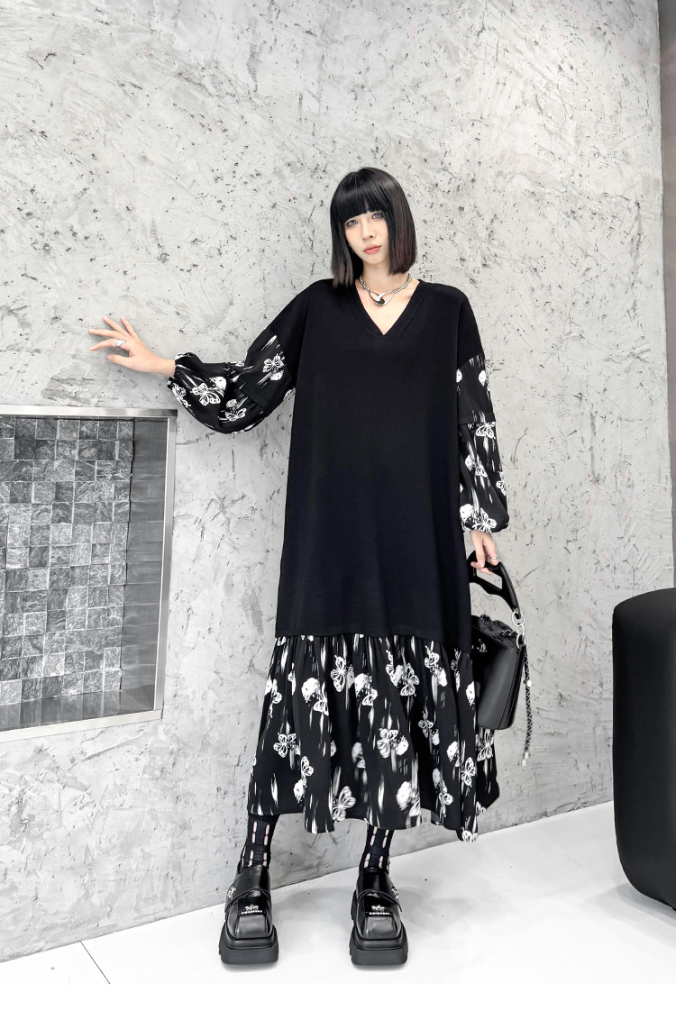 【ワンピース】おしゃれ フェイクレイヤード 切り替えVネックニット 長袖ワンピース ゆったりデザイン Aライン【AHシリーズ】