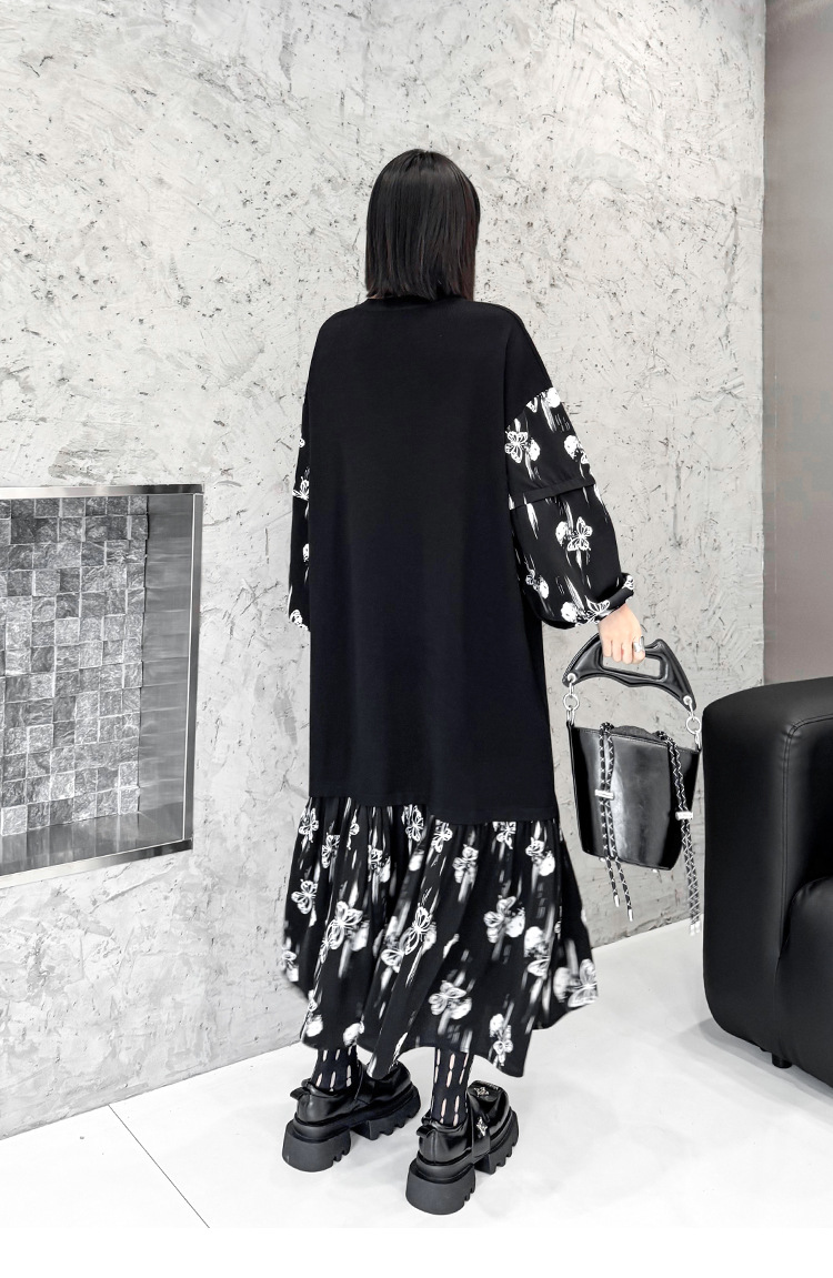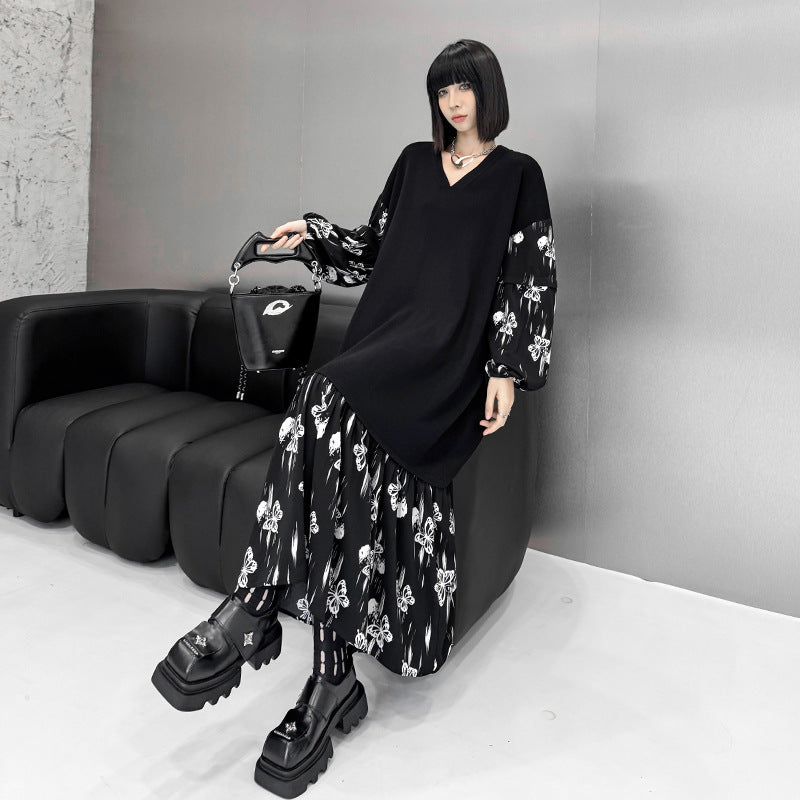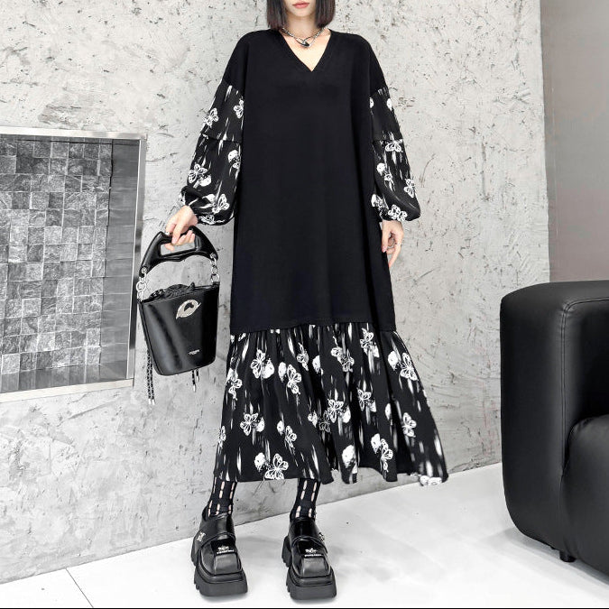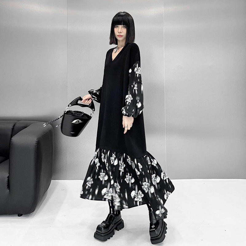 【商品名】【ワンピース】おしゃれ フェイクレイヤード 切り替えVネックニット 長袖ワンピース ゆったりデザイン Aライン【AHシリーズ】