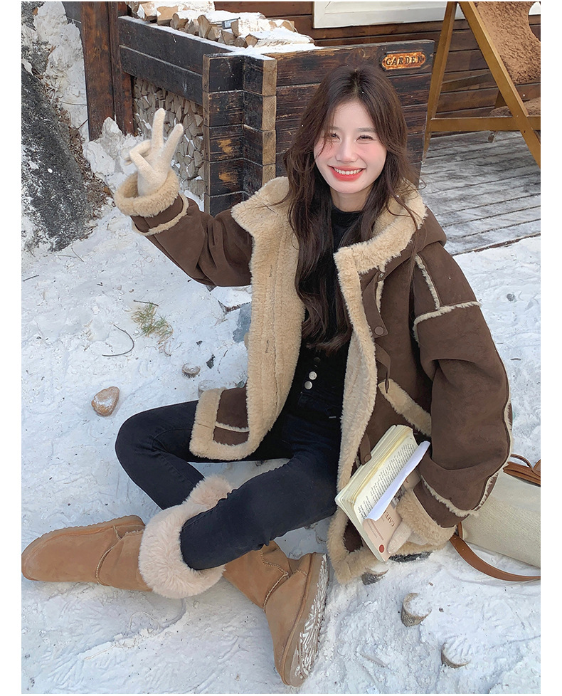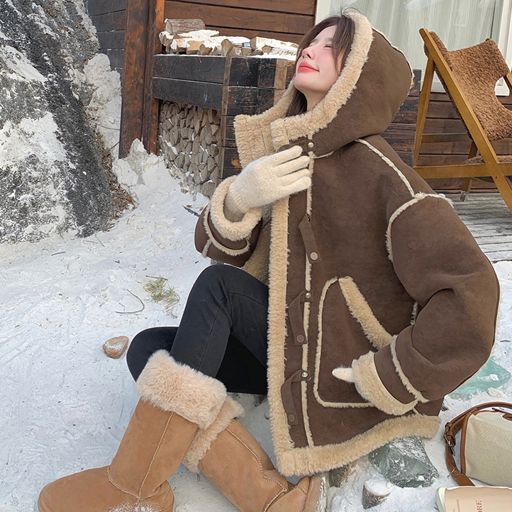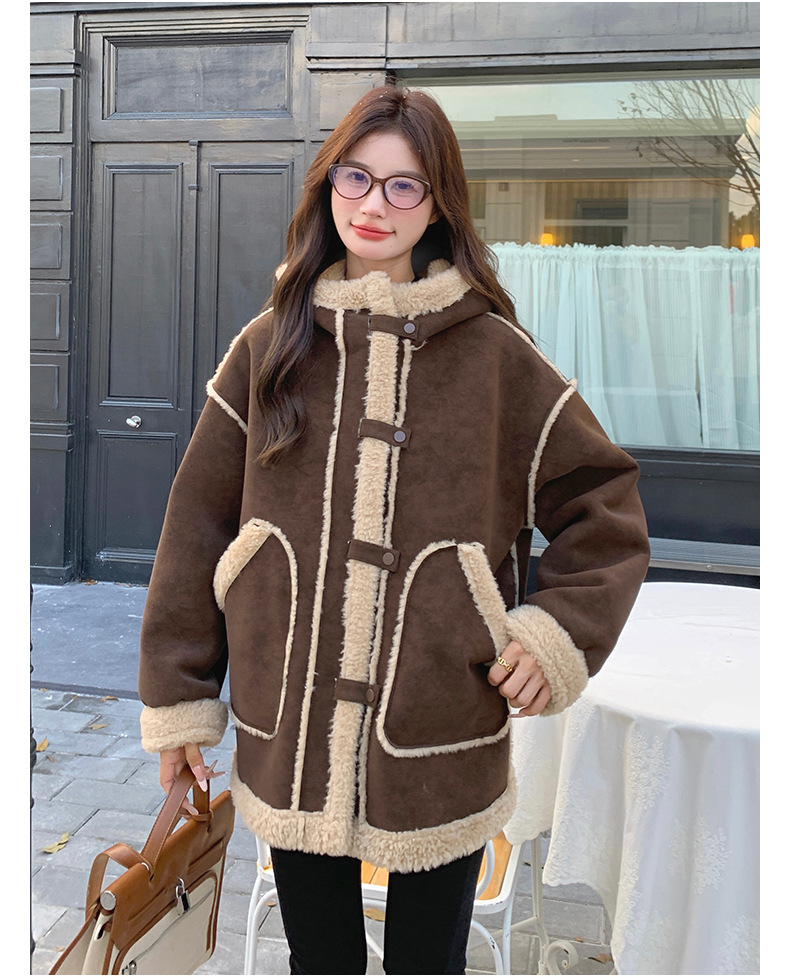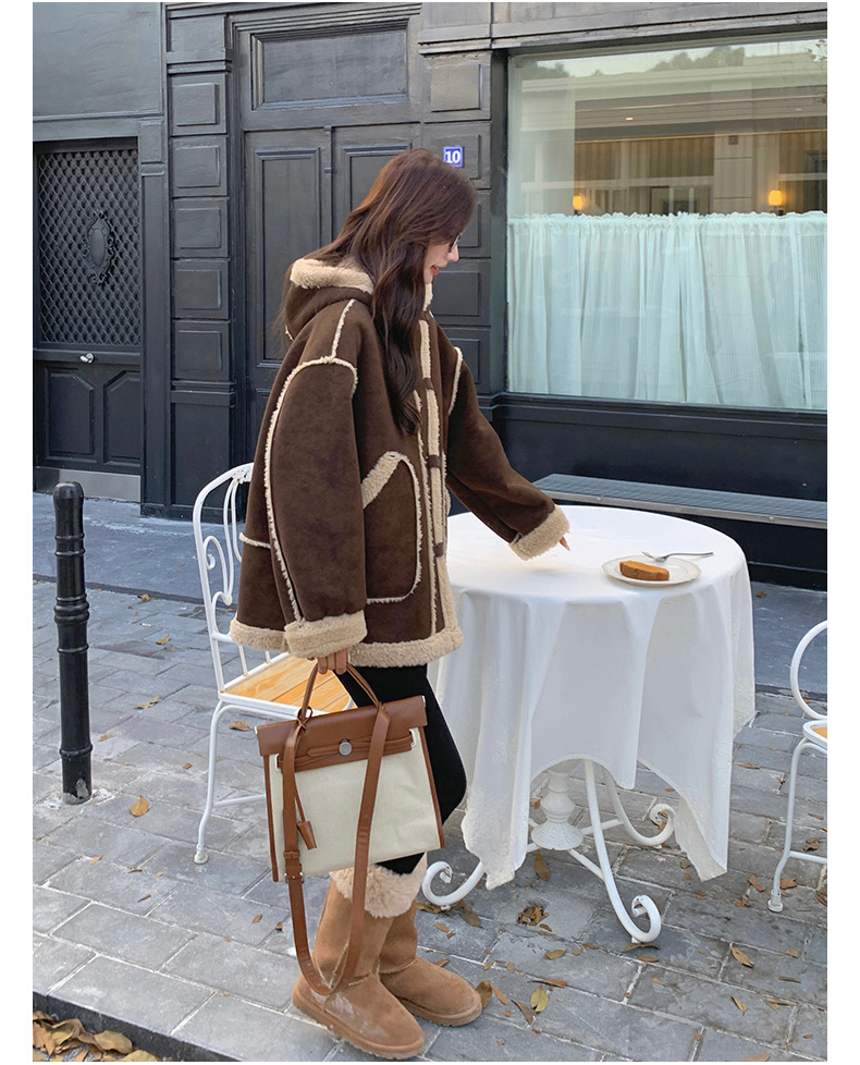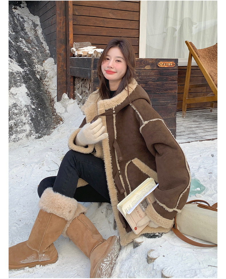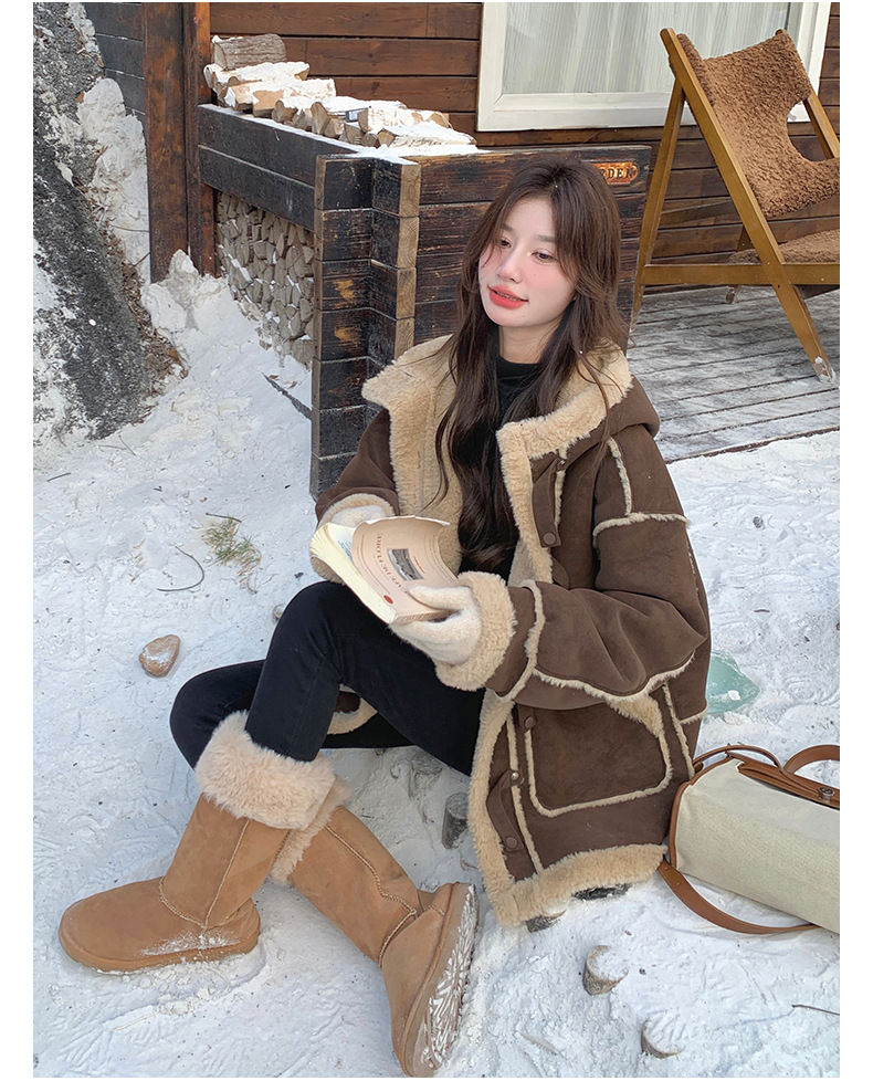 【アウター】キャメルスエード調フード付きフェイクムートンコート 冬 カラー切替 ボア裏地 保温 中綿ジャケット レディース【JZシリーズ】