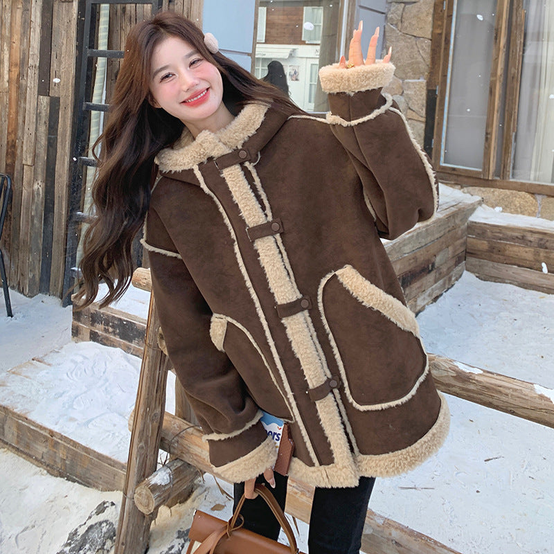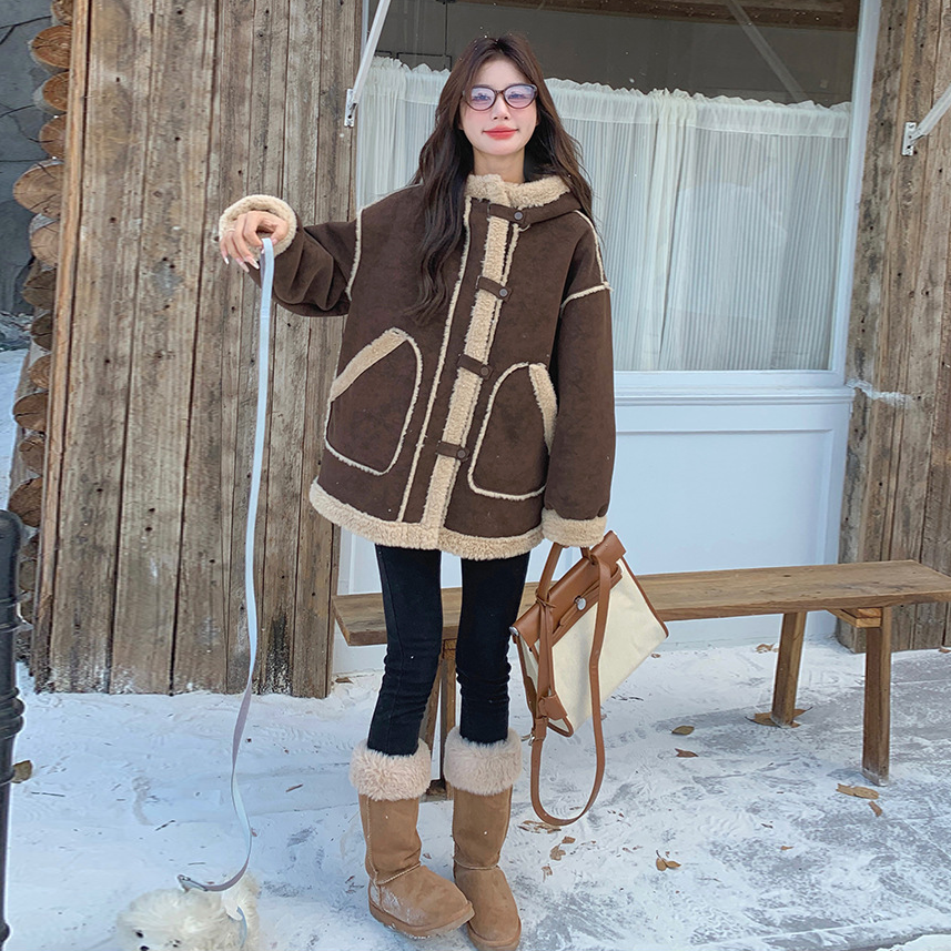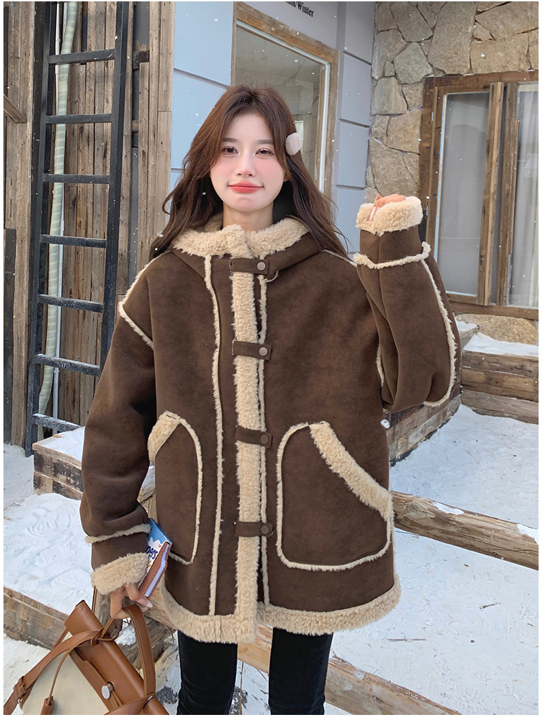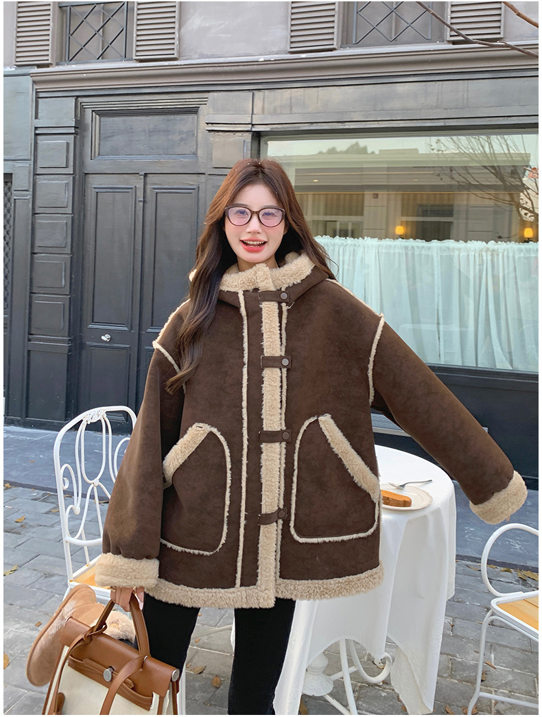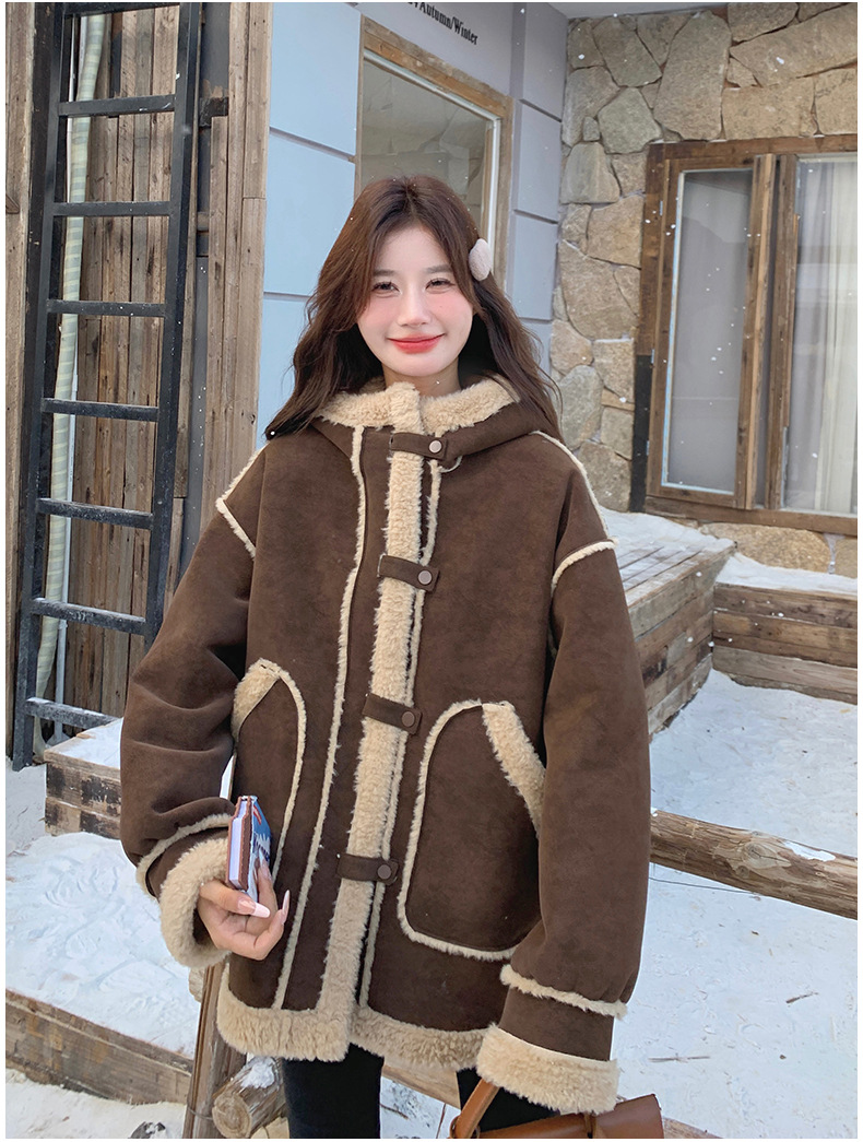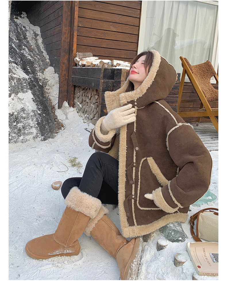 【アウター】キャメルスエード調フード付きフェイクムートンコート 冬 カラー切替 ボア裏地 保温 中綿ジャケット レディース【JZシリーズ】