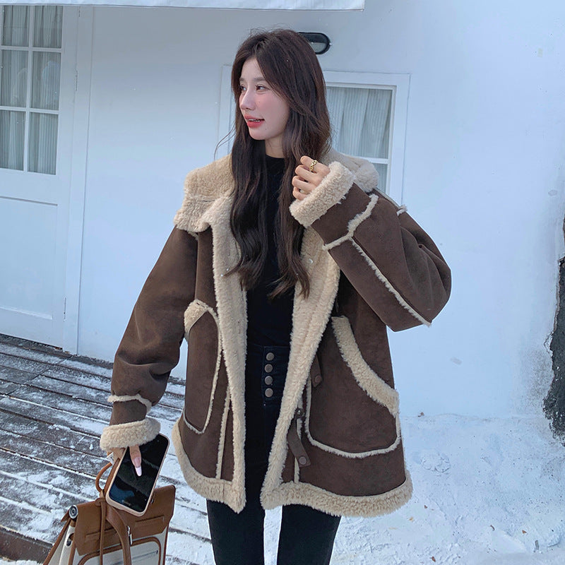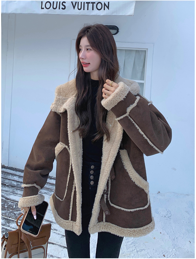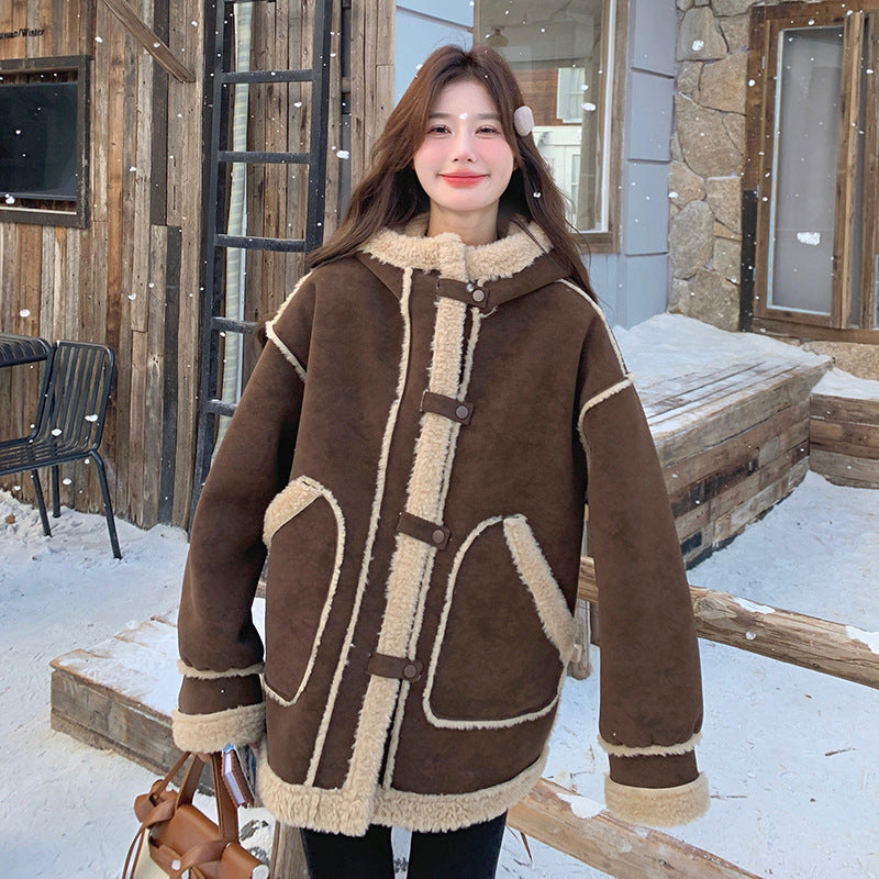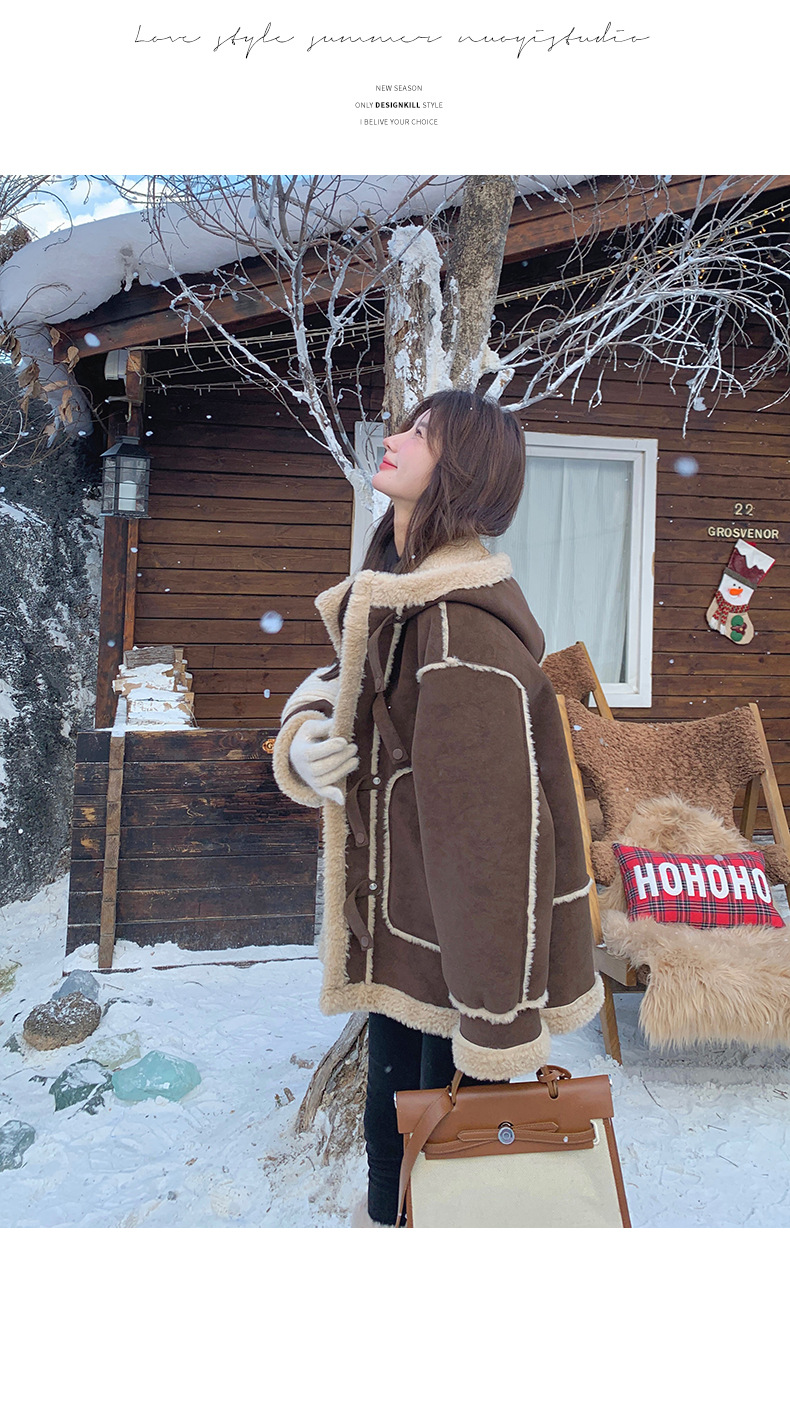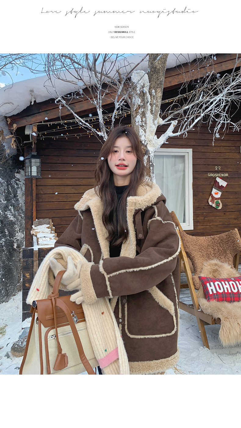 【アウター】キャメルスエード調フード付きフェイクムートンコート 冬 カラー切替 ボア裏地 保温 中綿ジャケット レディース【JZシリーズ】