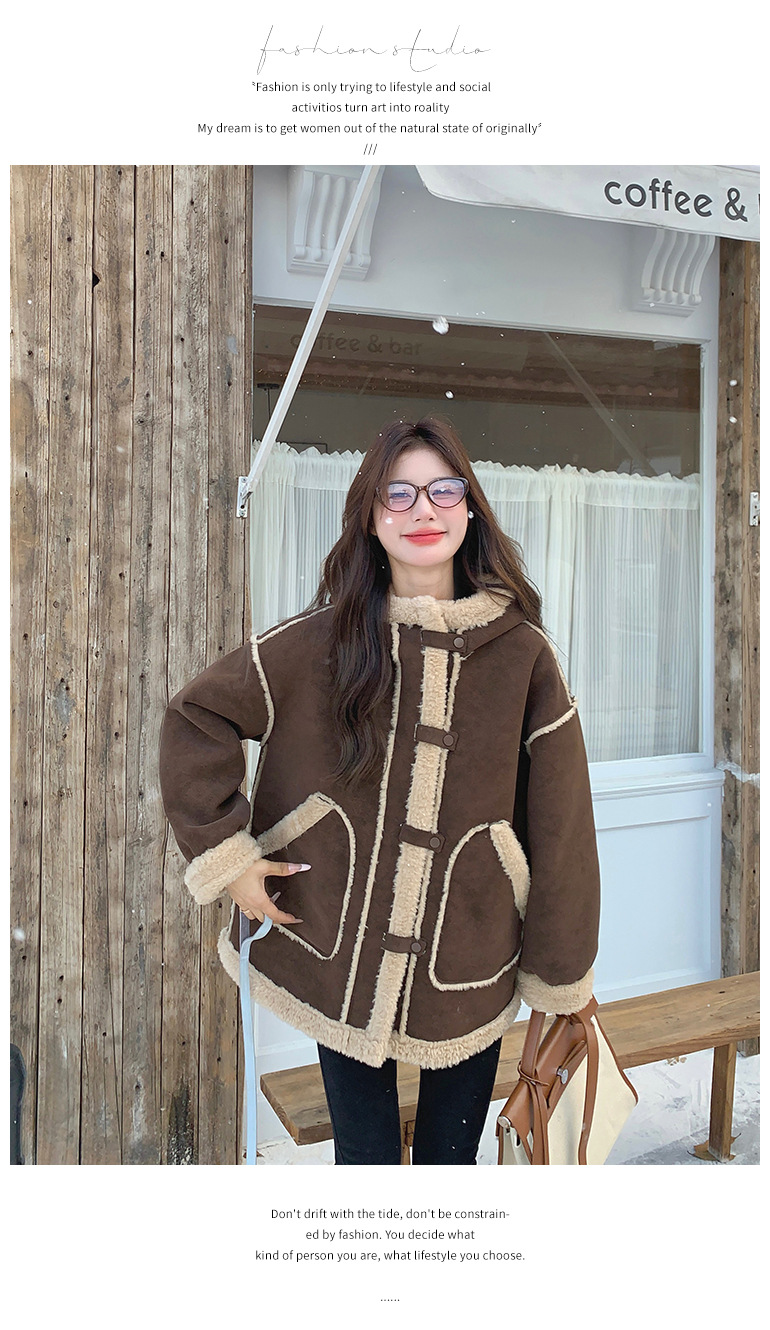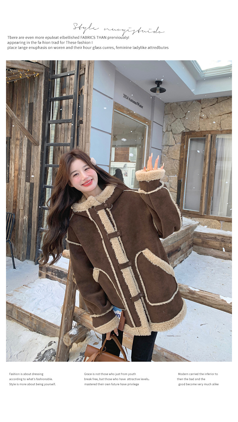 【商品名】【アウター】キャメルスエード調フード付きフェイクムートンコート 冬 カラー切替 ボア裏地 保温 中綿ジャケット レディース【JZシリーズ】