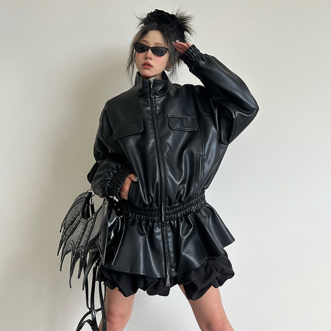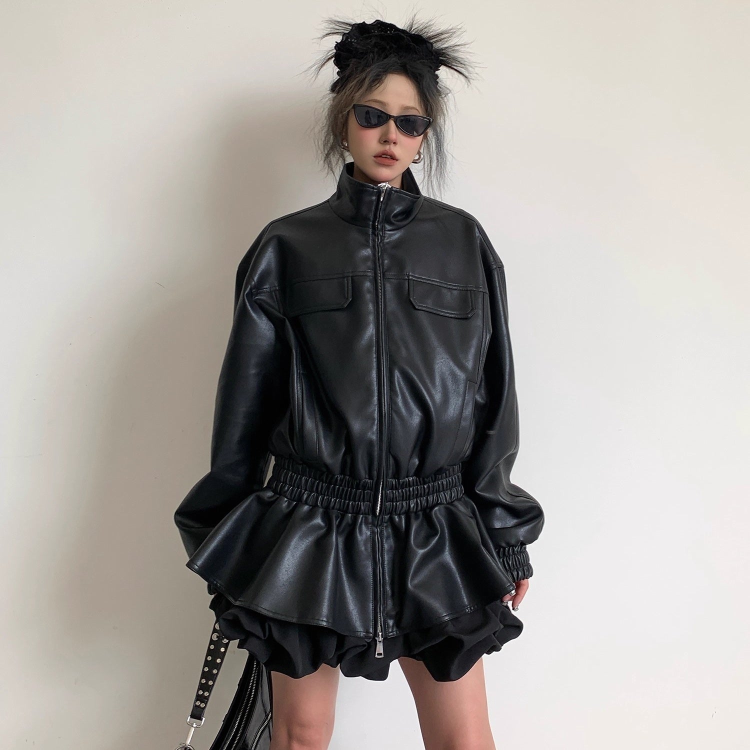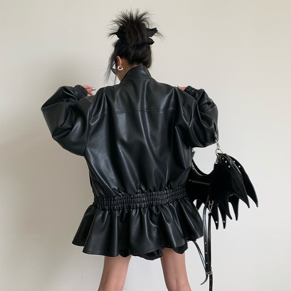 【アウター】春 秋 冬 ファッション ブラック フリル PU ジャケット【FCシリーズ】