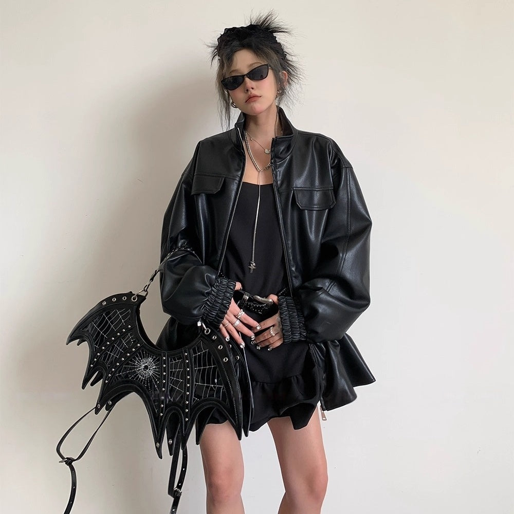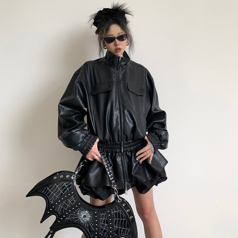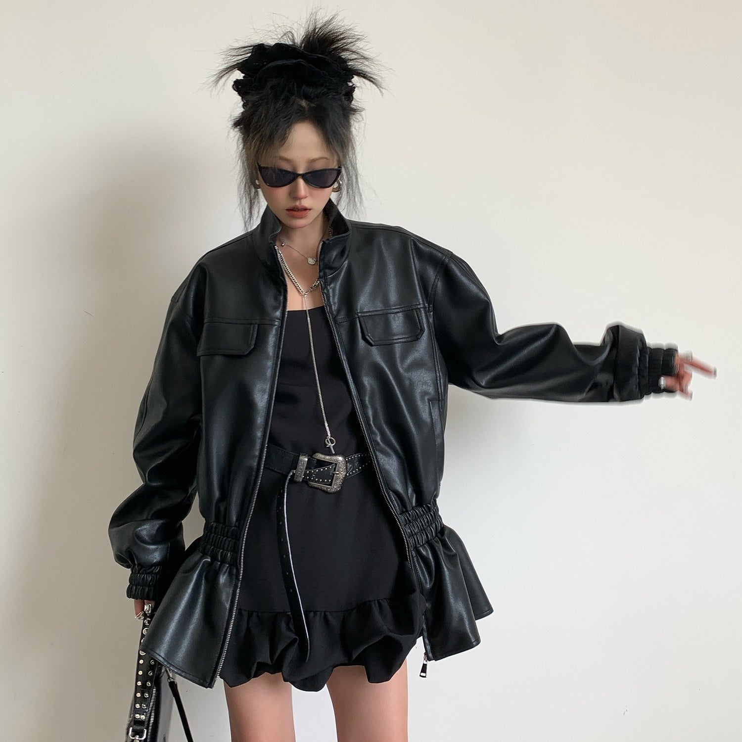 【アウター】春 秋 冬 ファッション ブラック フリル PU ジャケット【FCシリーズ】