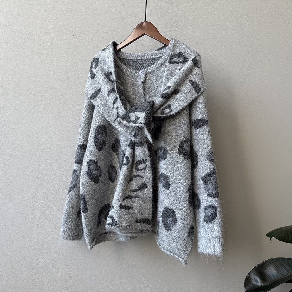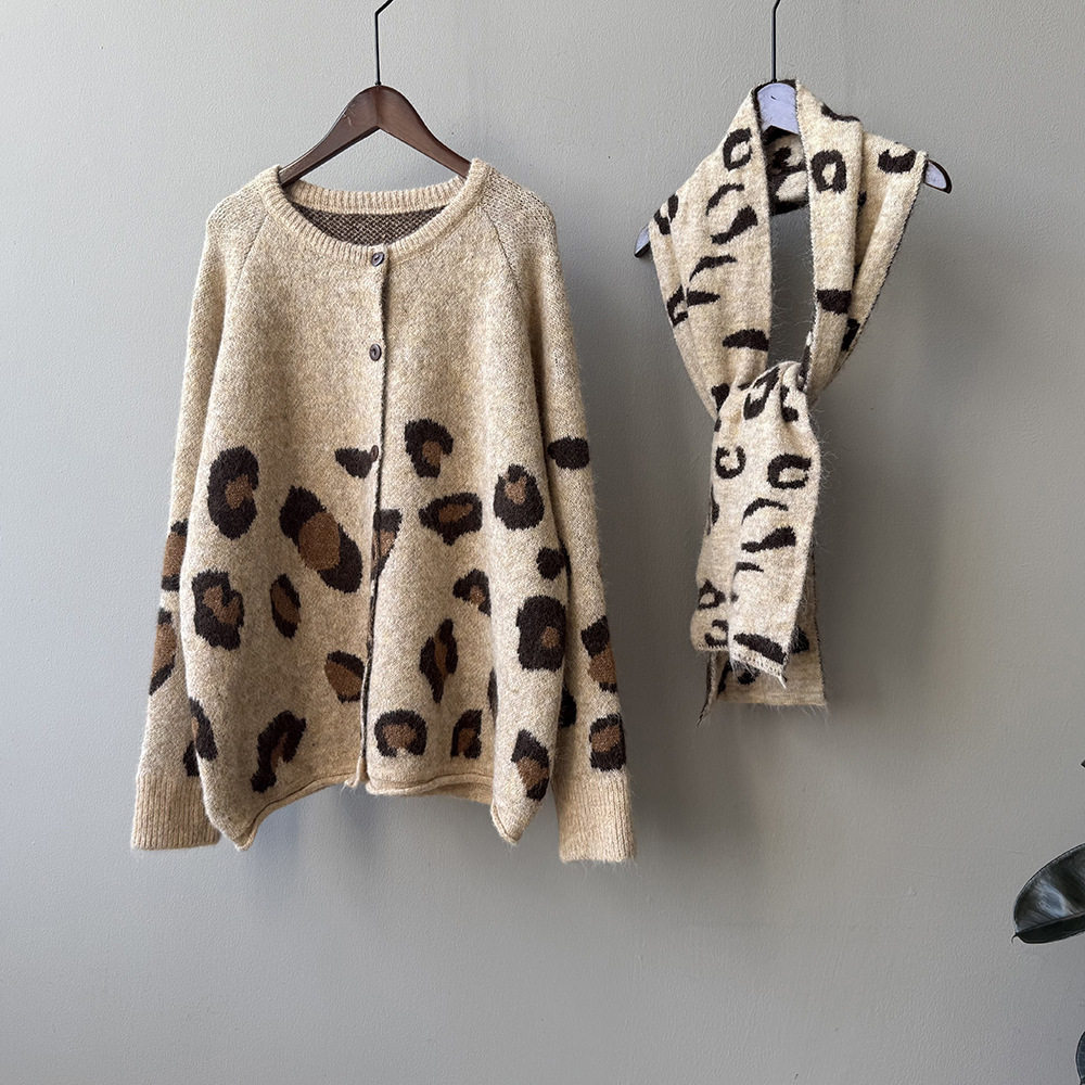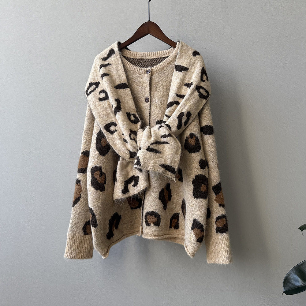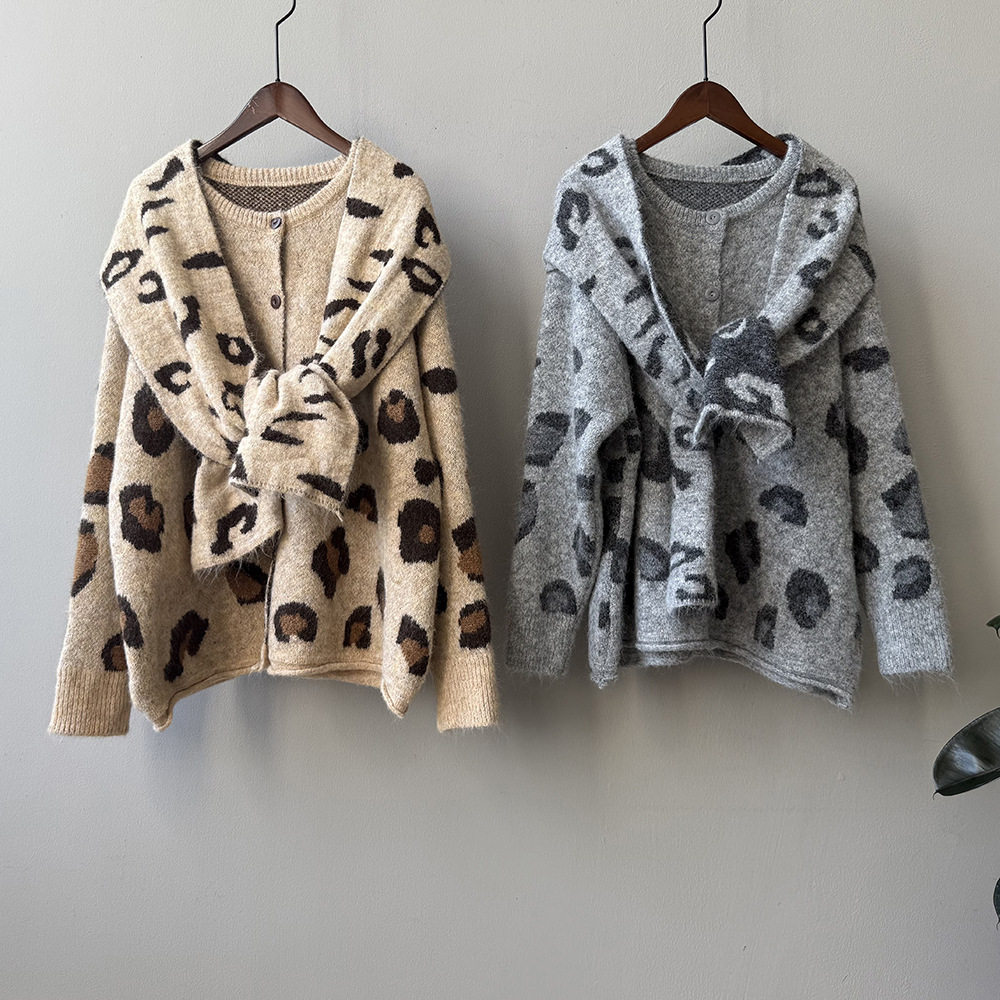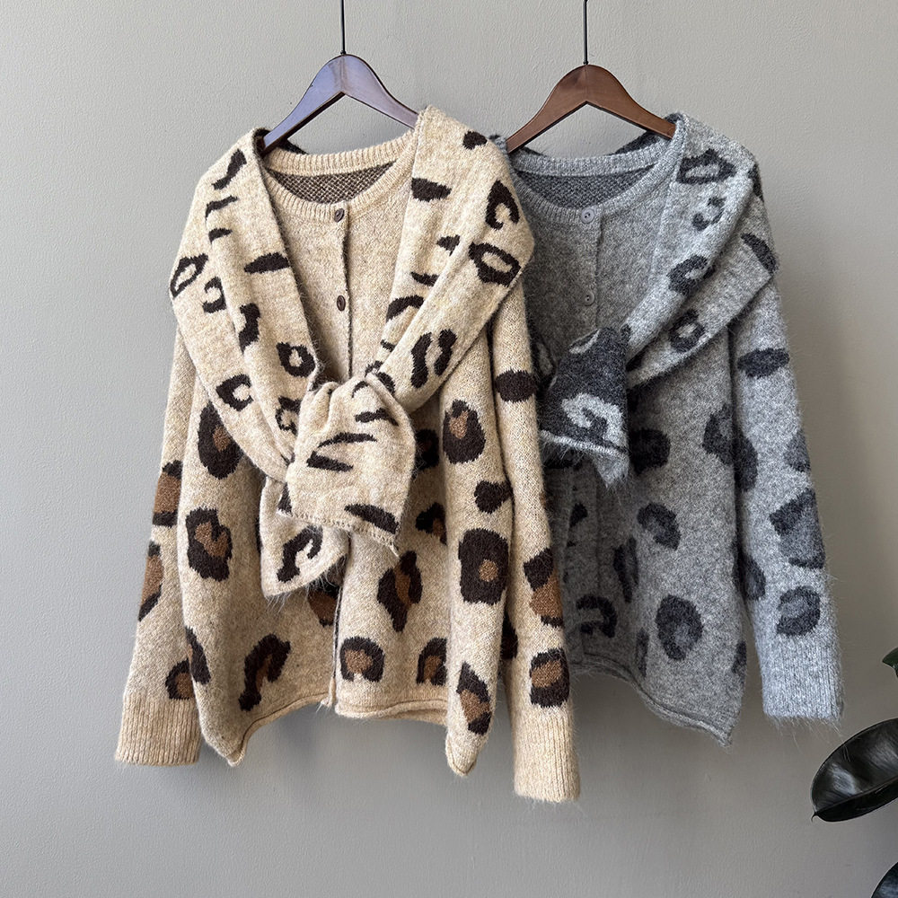 【トップス】ゆるニット レオパード柄カーディガン マフラー付き 秋冬 暖かい おしゃれ レディース【JZシリーズ】