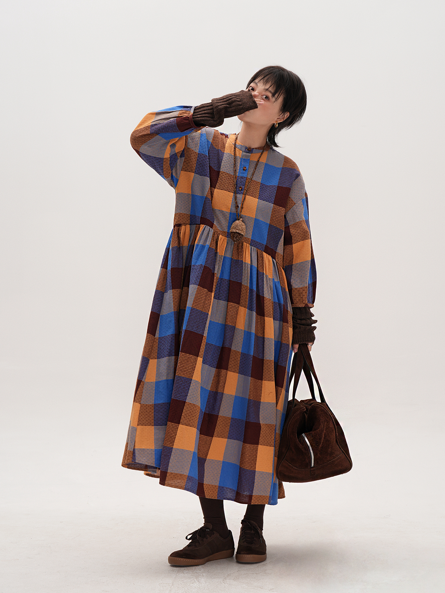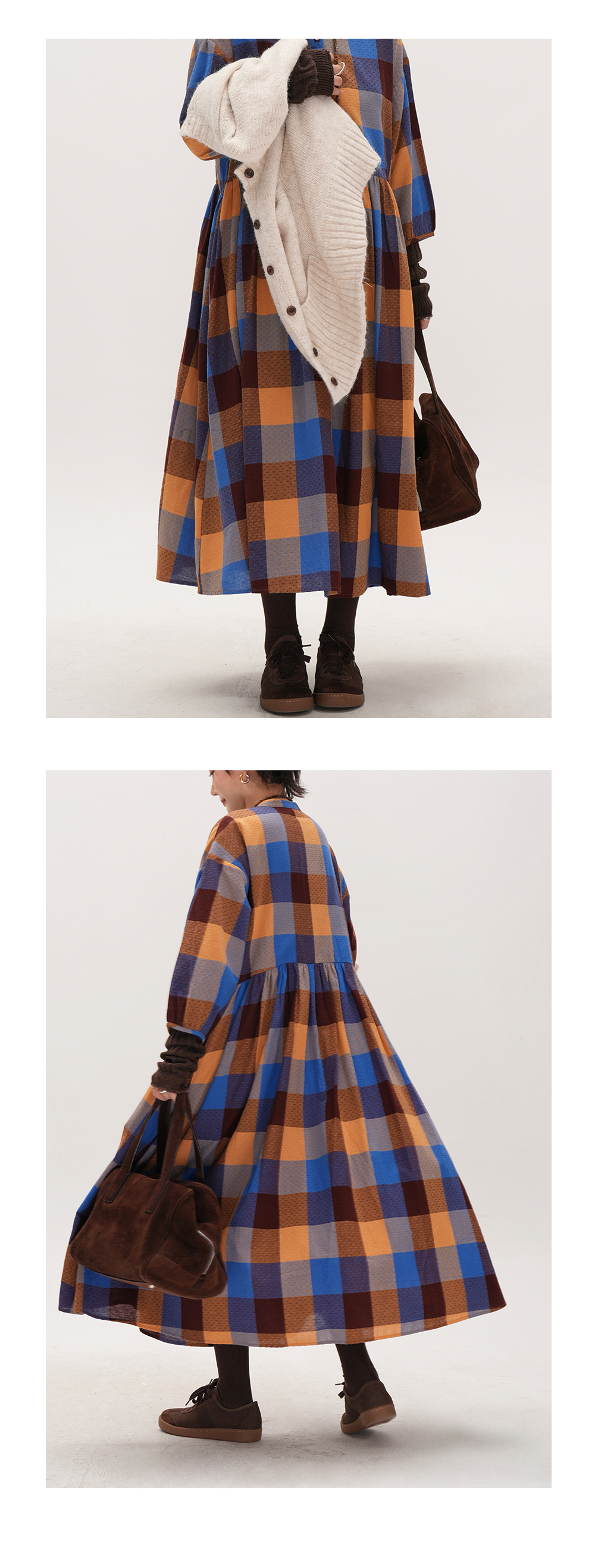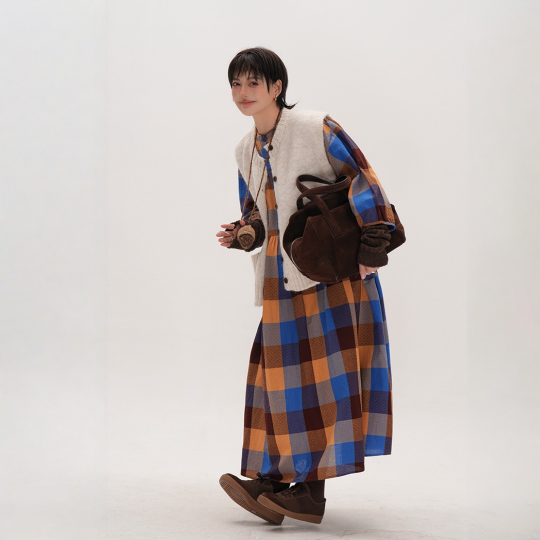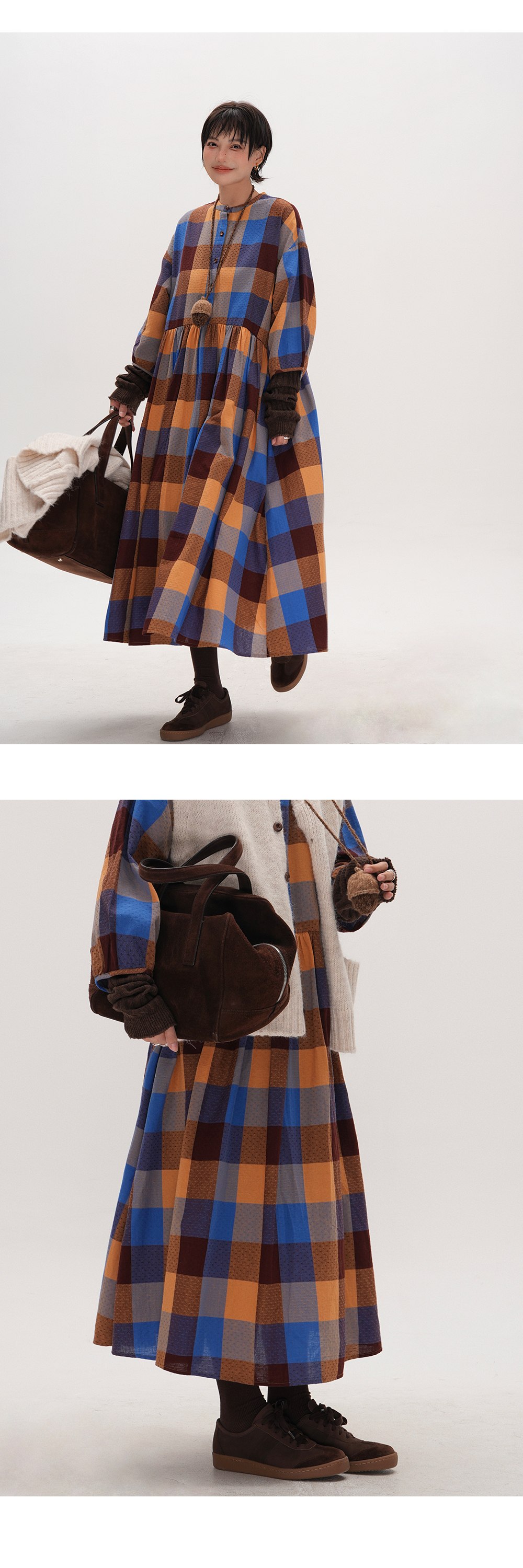【商品名】【ワンピース】春 秋 冬 レトロ風 ゆったりチェック柄 ロング ワンピース ワンピース 【JZシリーズ】