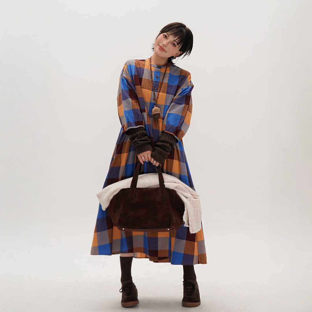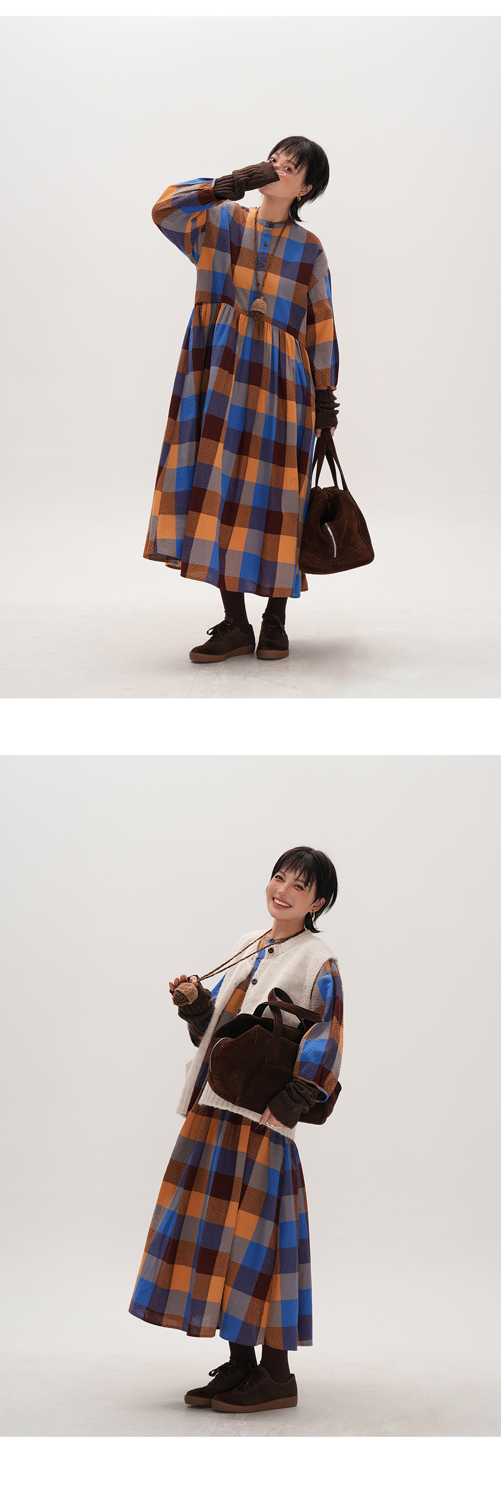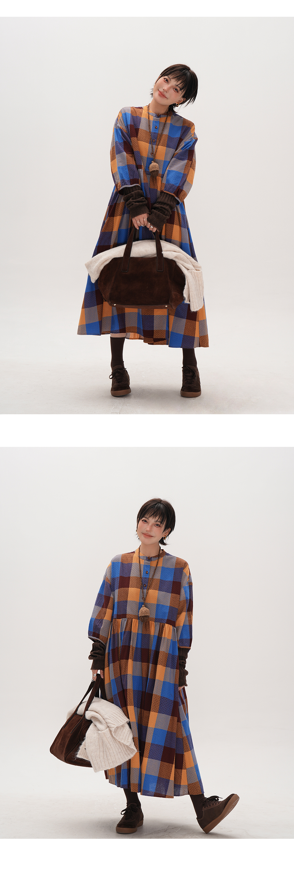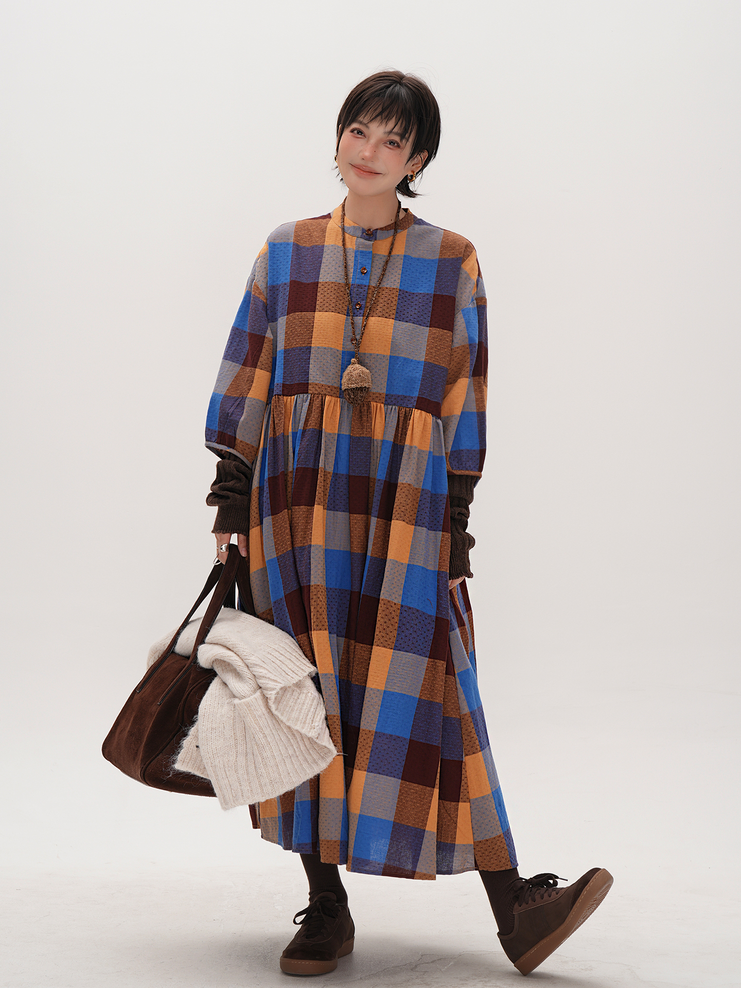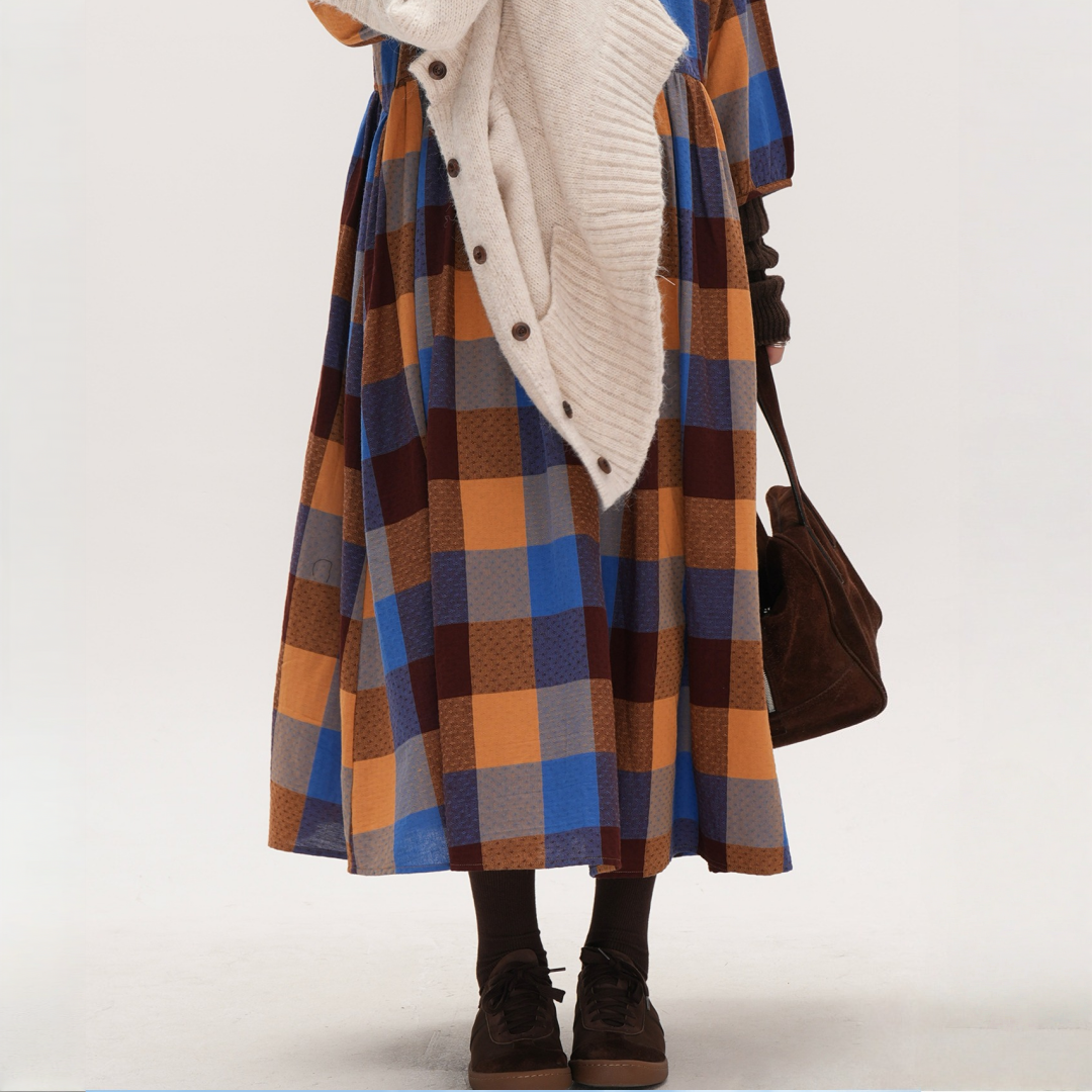 【商品名】【ワンピース】春 秋 冬 レトロ風 ゆったりチェック柄 ロング ワンピース ワンピース 【JZシリーズ】