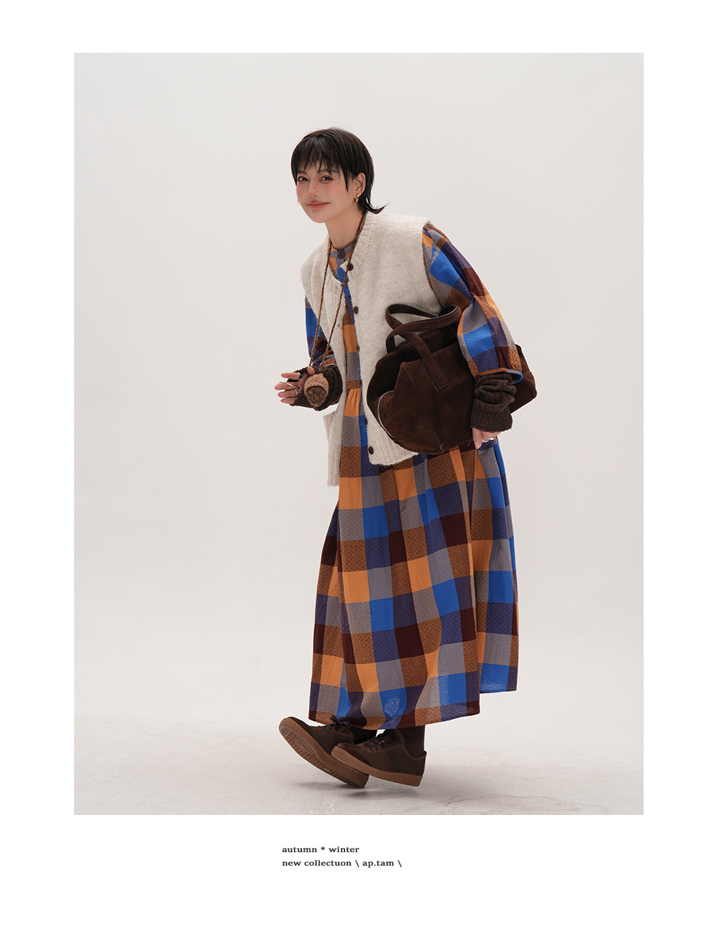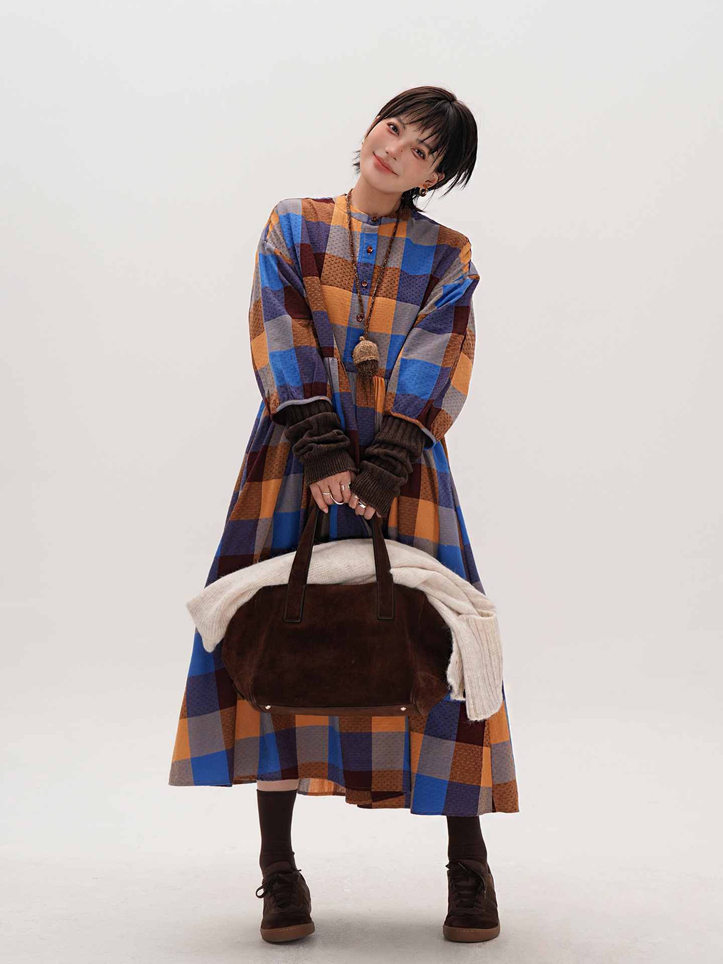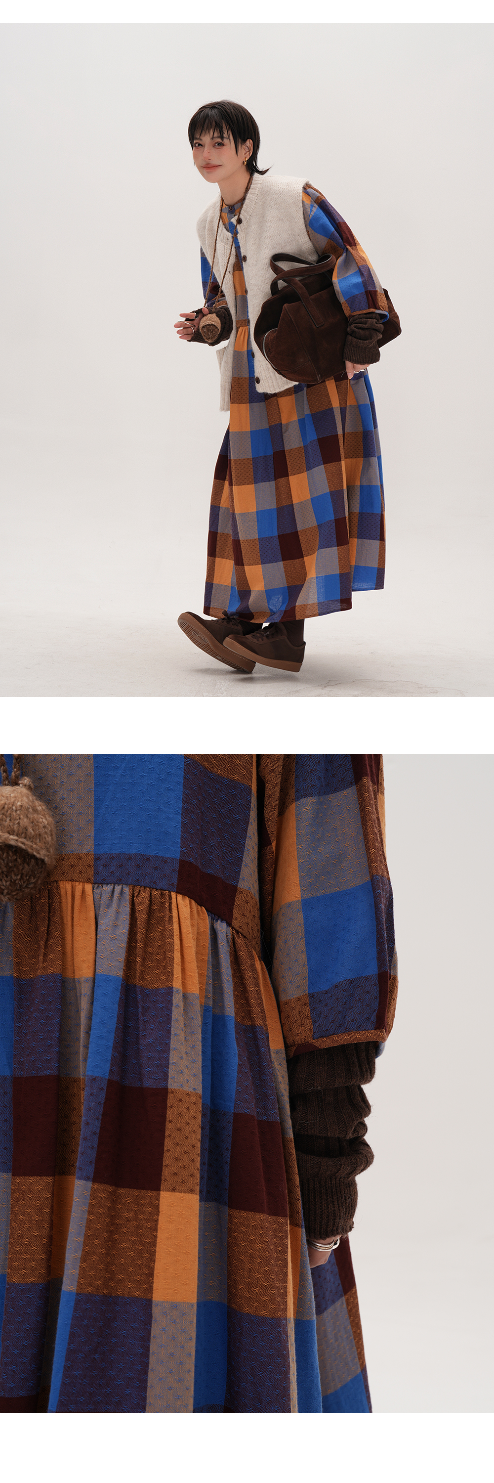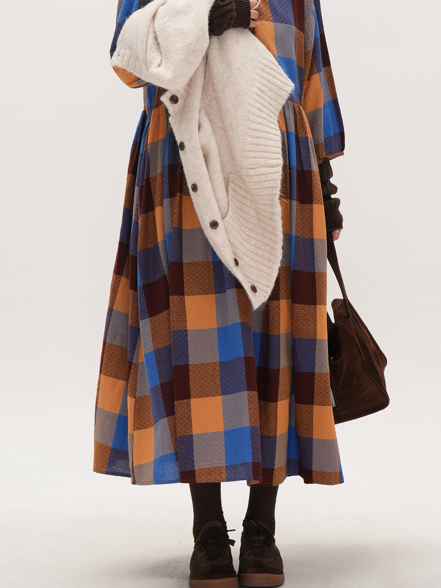 【商品名】【ワンピース】春 秋 冬 レトロ風 ゆったりチェック柄 ロング ワンピース ワンピース 【JZシリーズ】