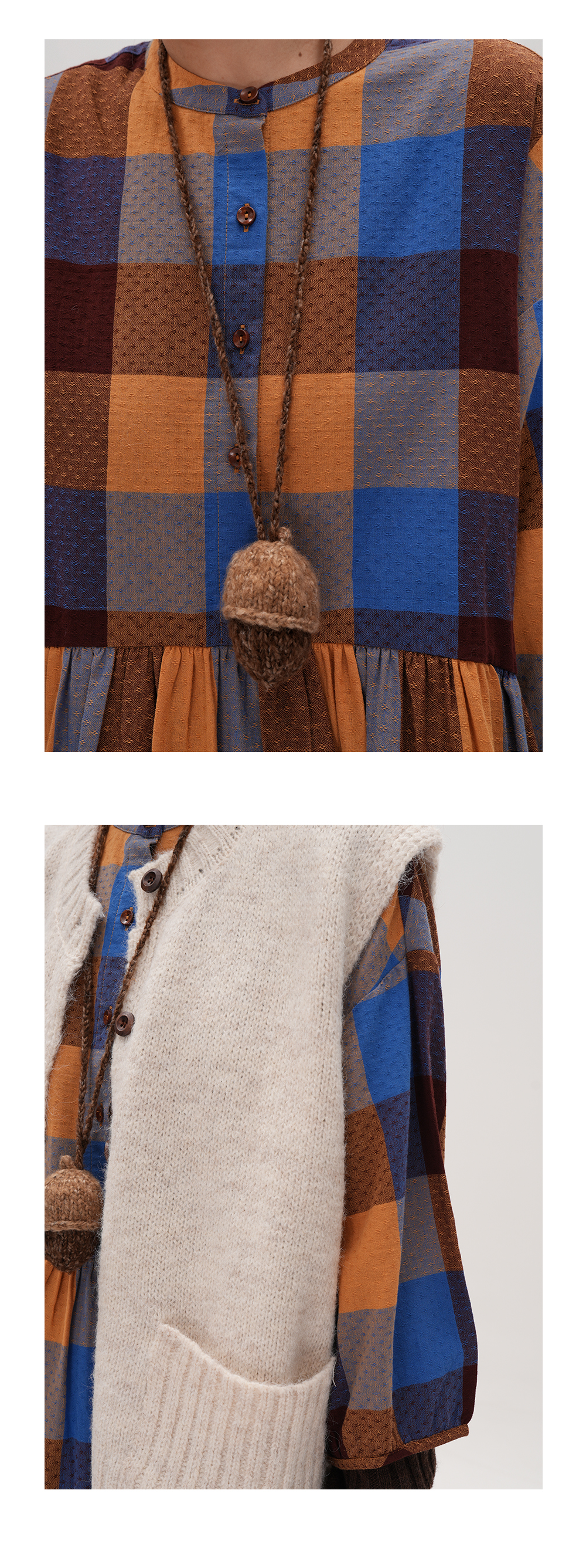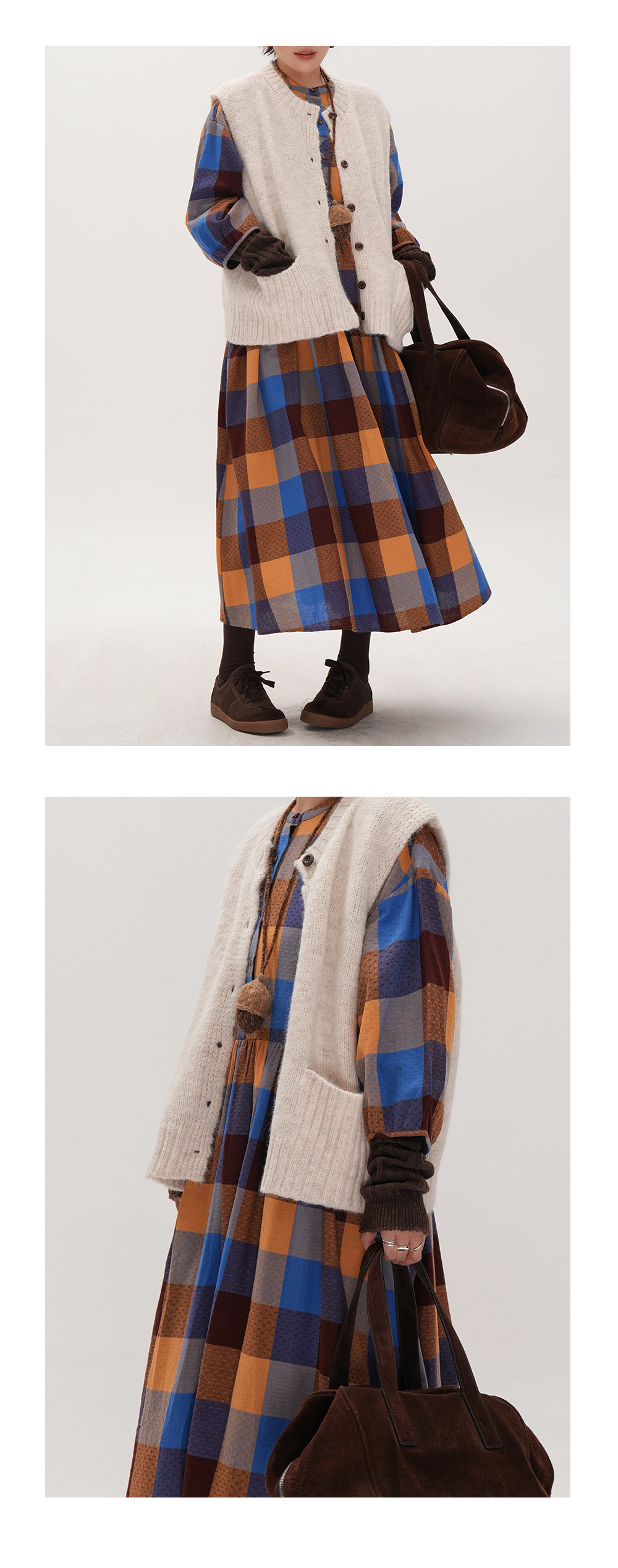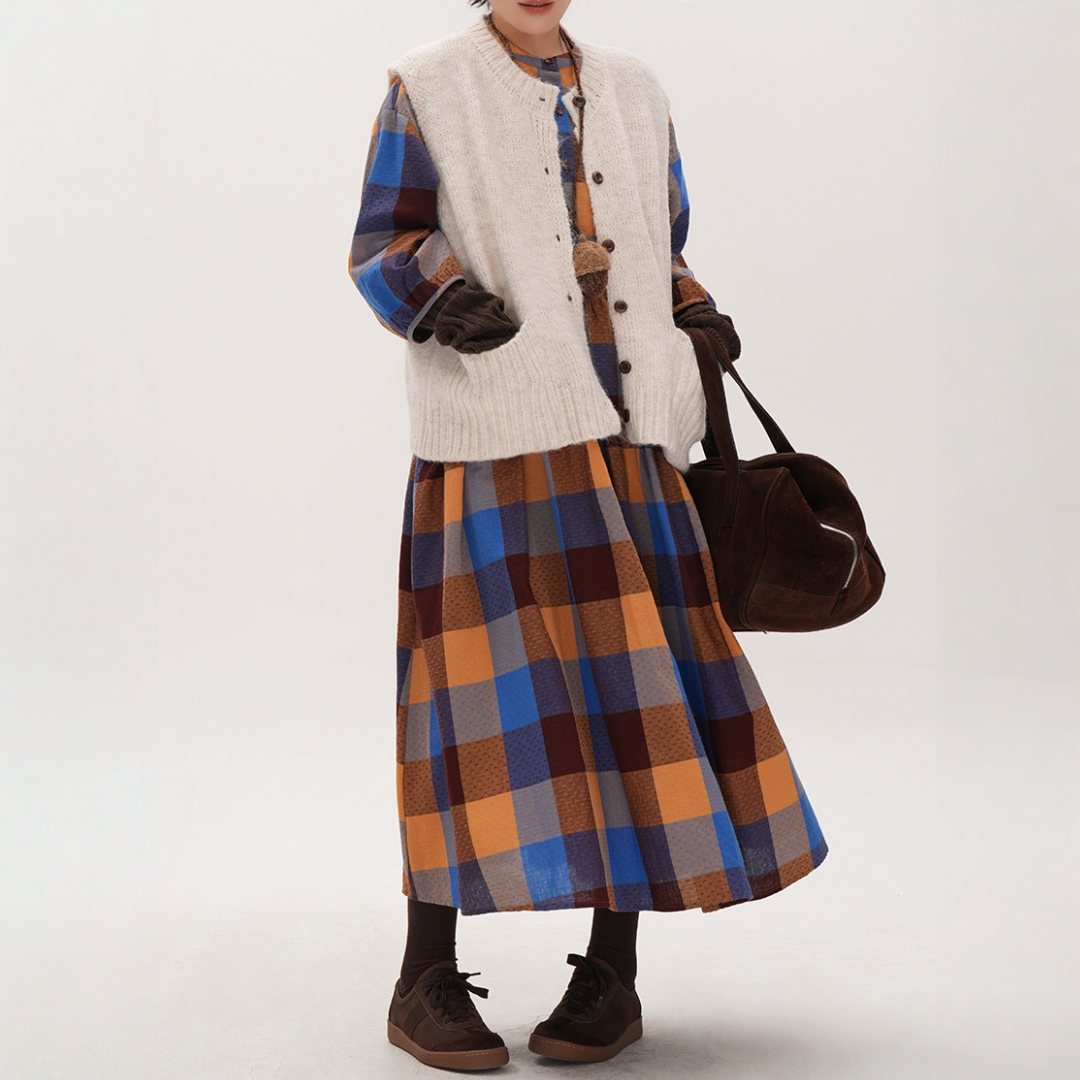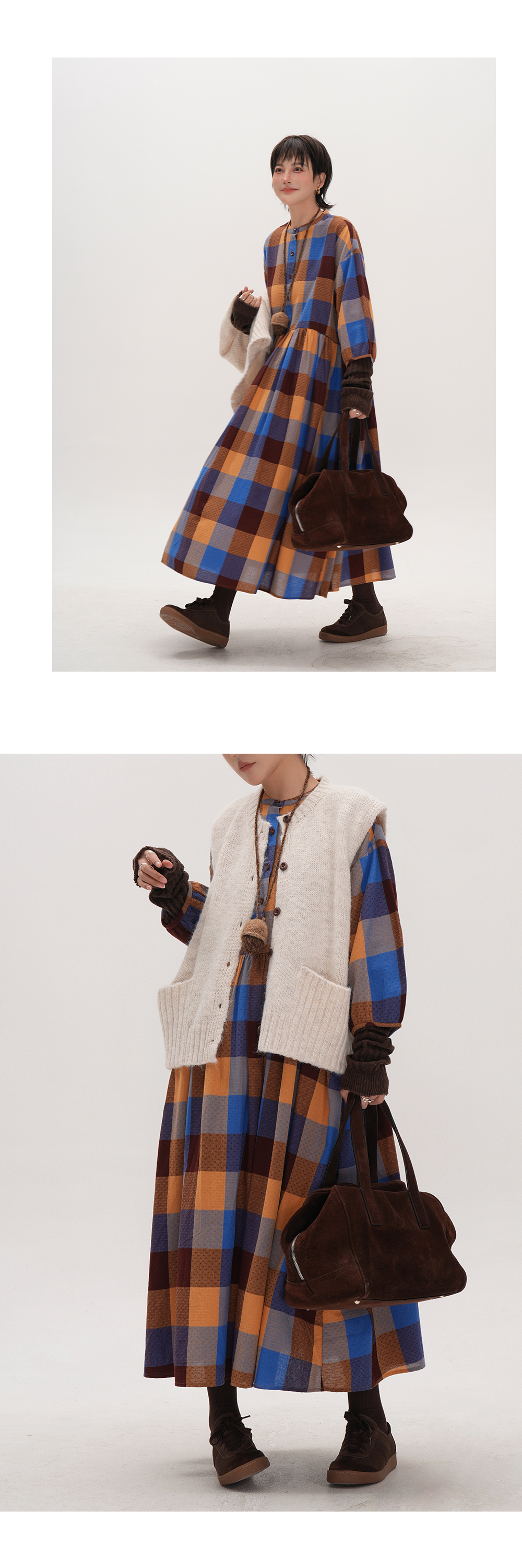 【ワンピース】起毛素材 チェック柄 レトロ クルーネック 長袖 ワンピース 【JZシリーズ】