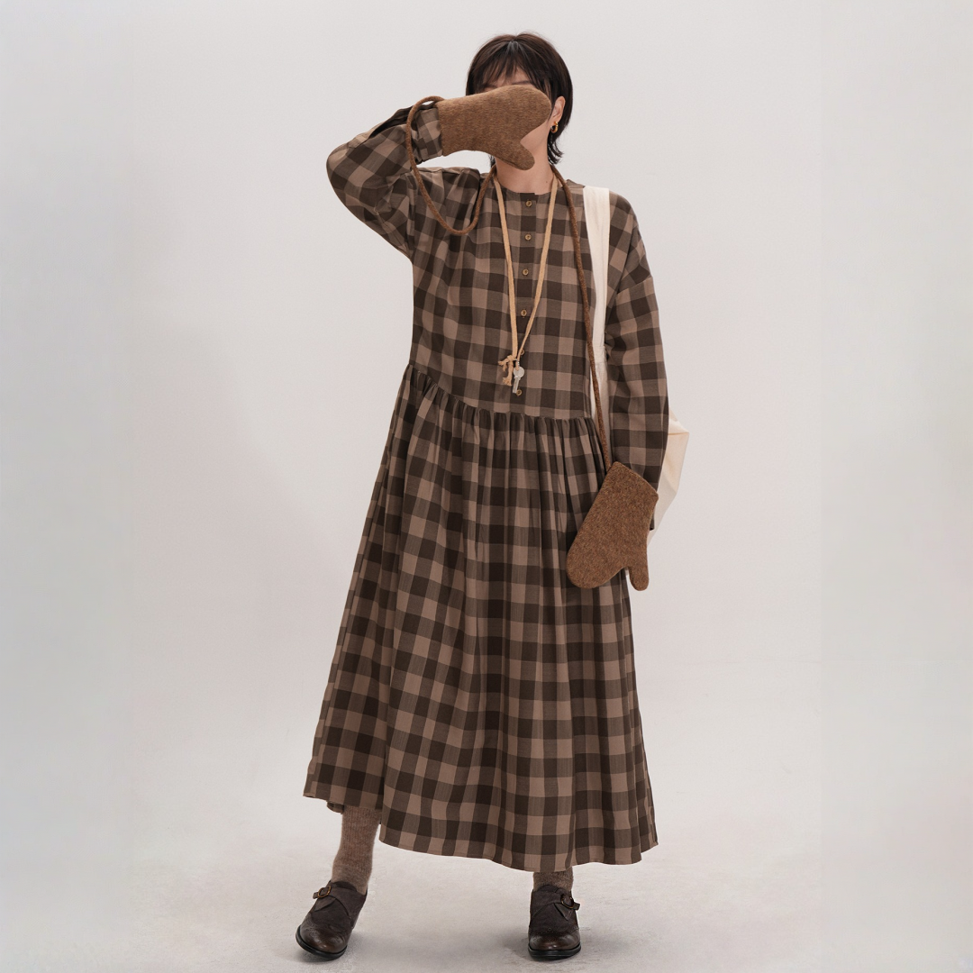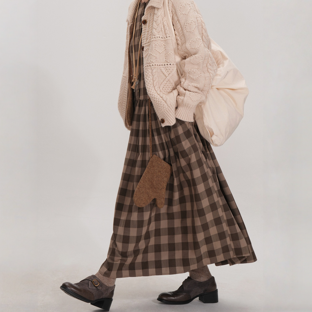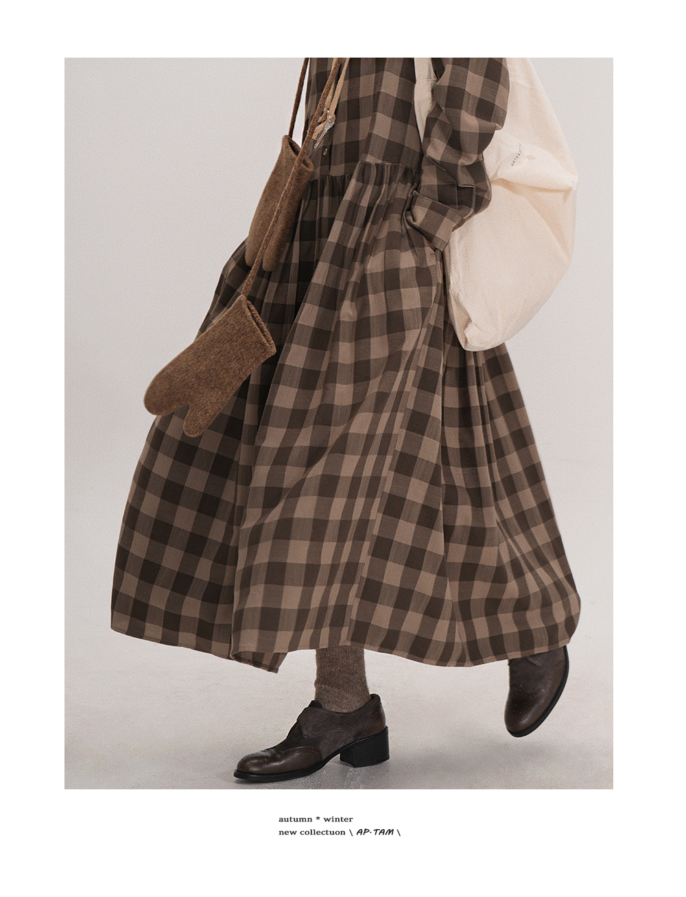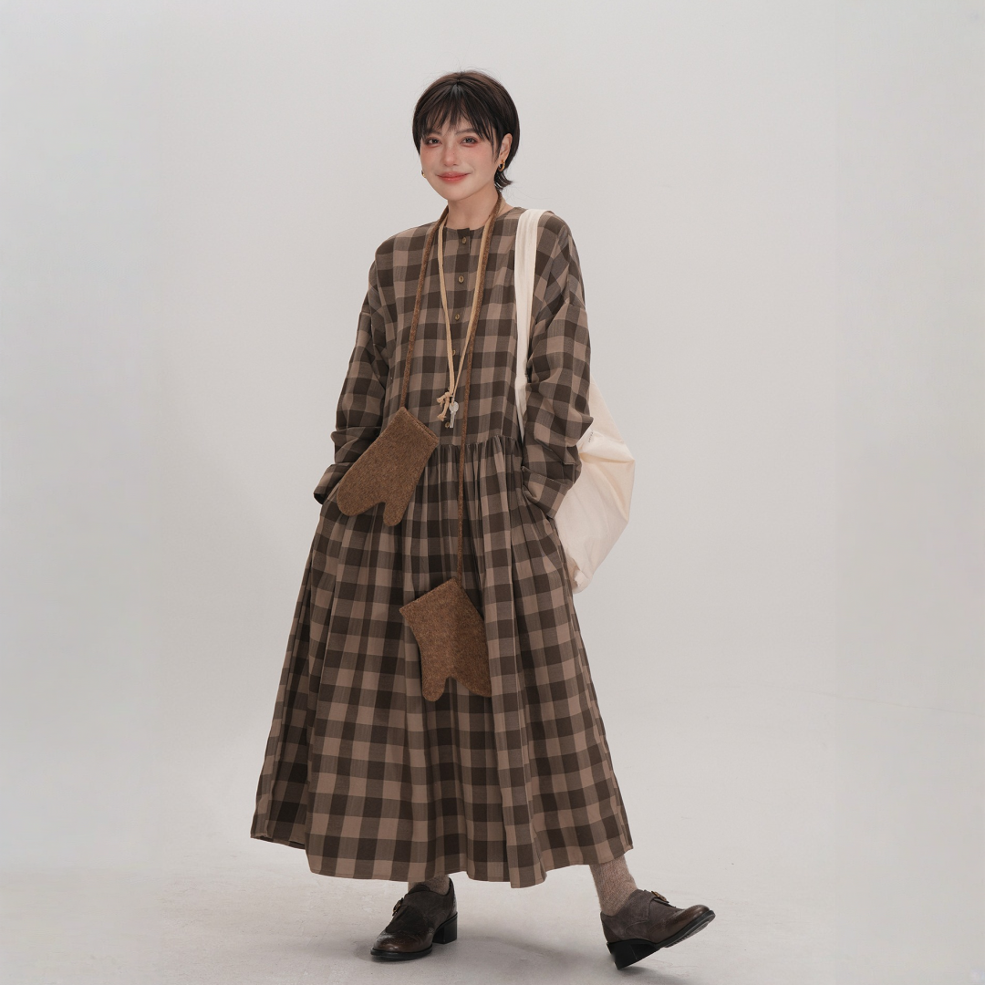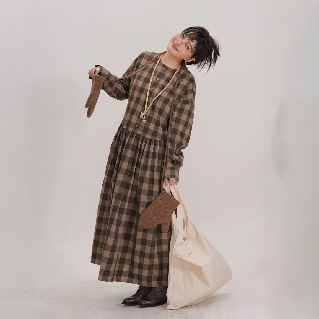 【ワンピース】起毛素材 チェック柄 レトロ クルーネック 長袖 ワンピース 【JZシリーズ】