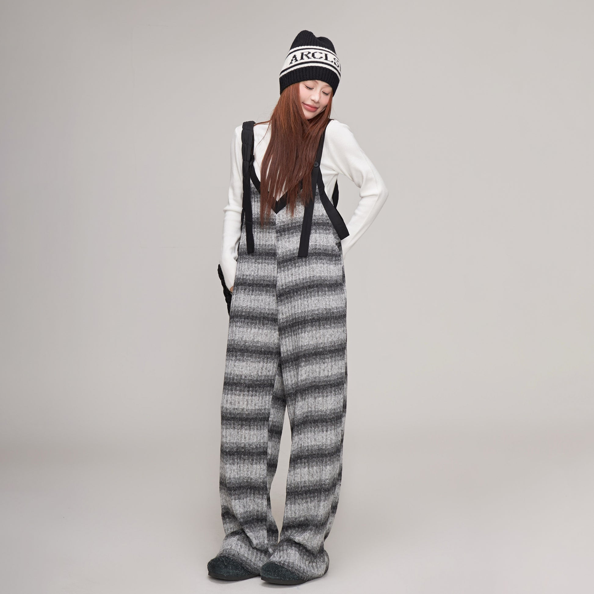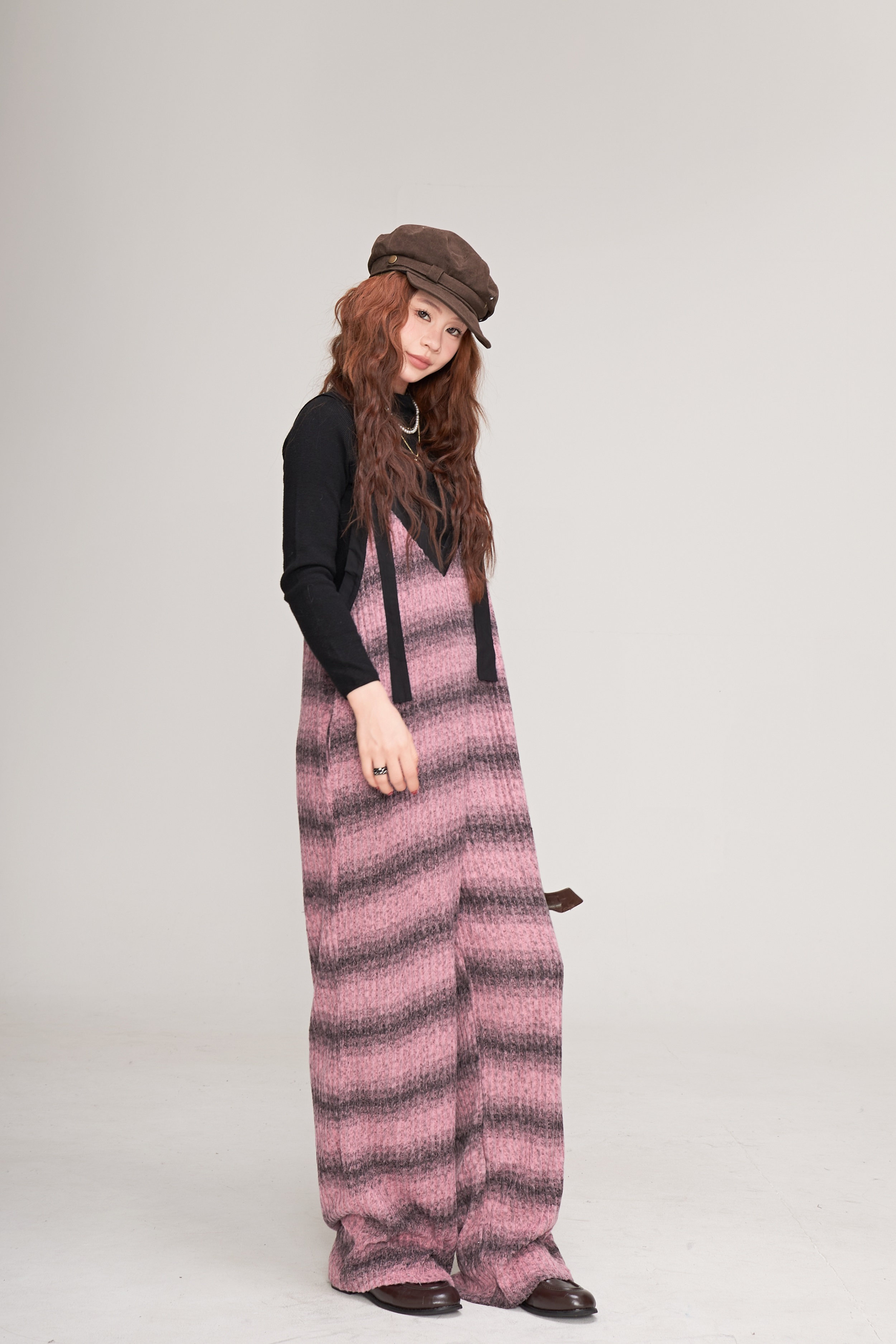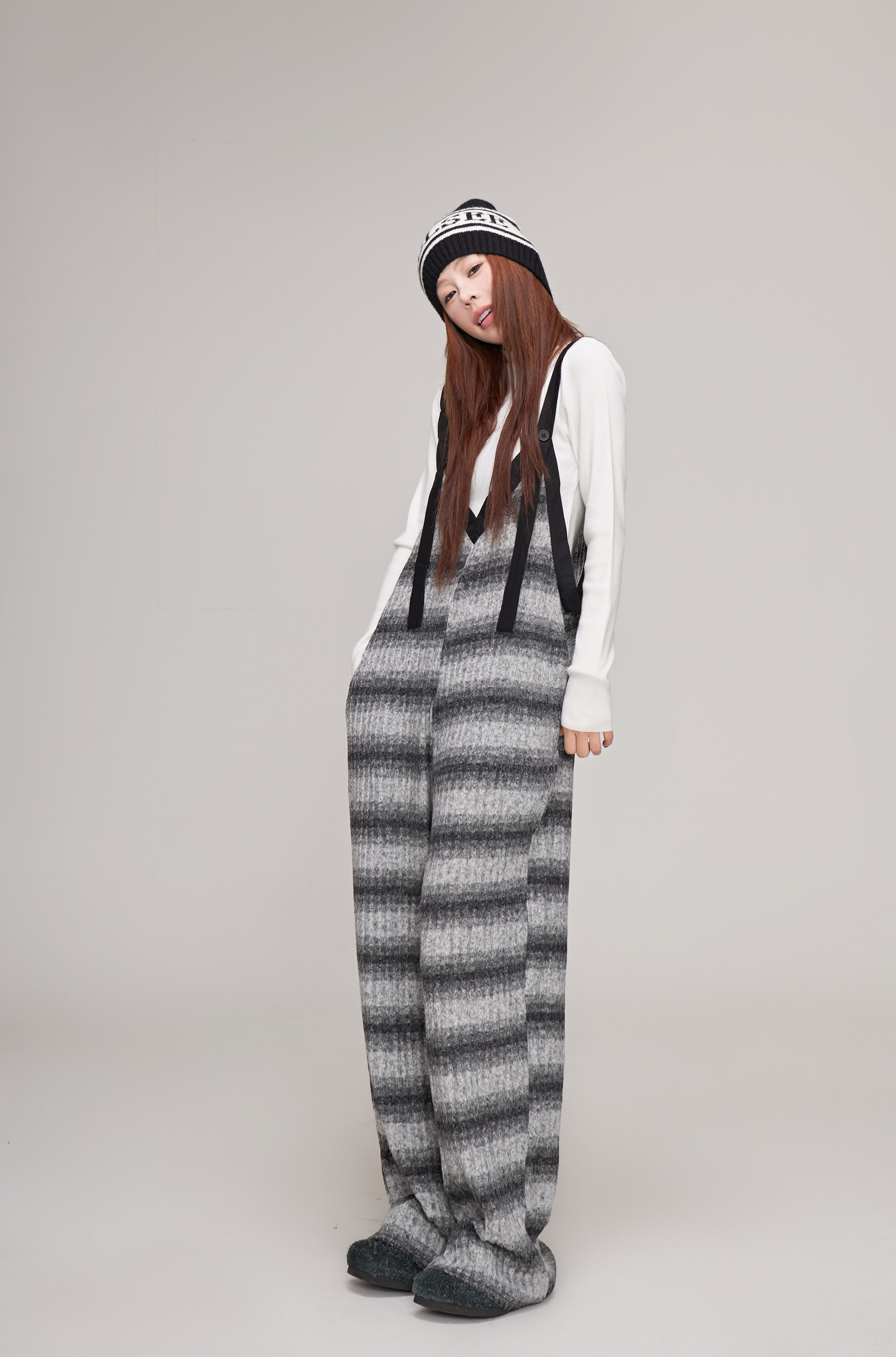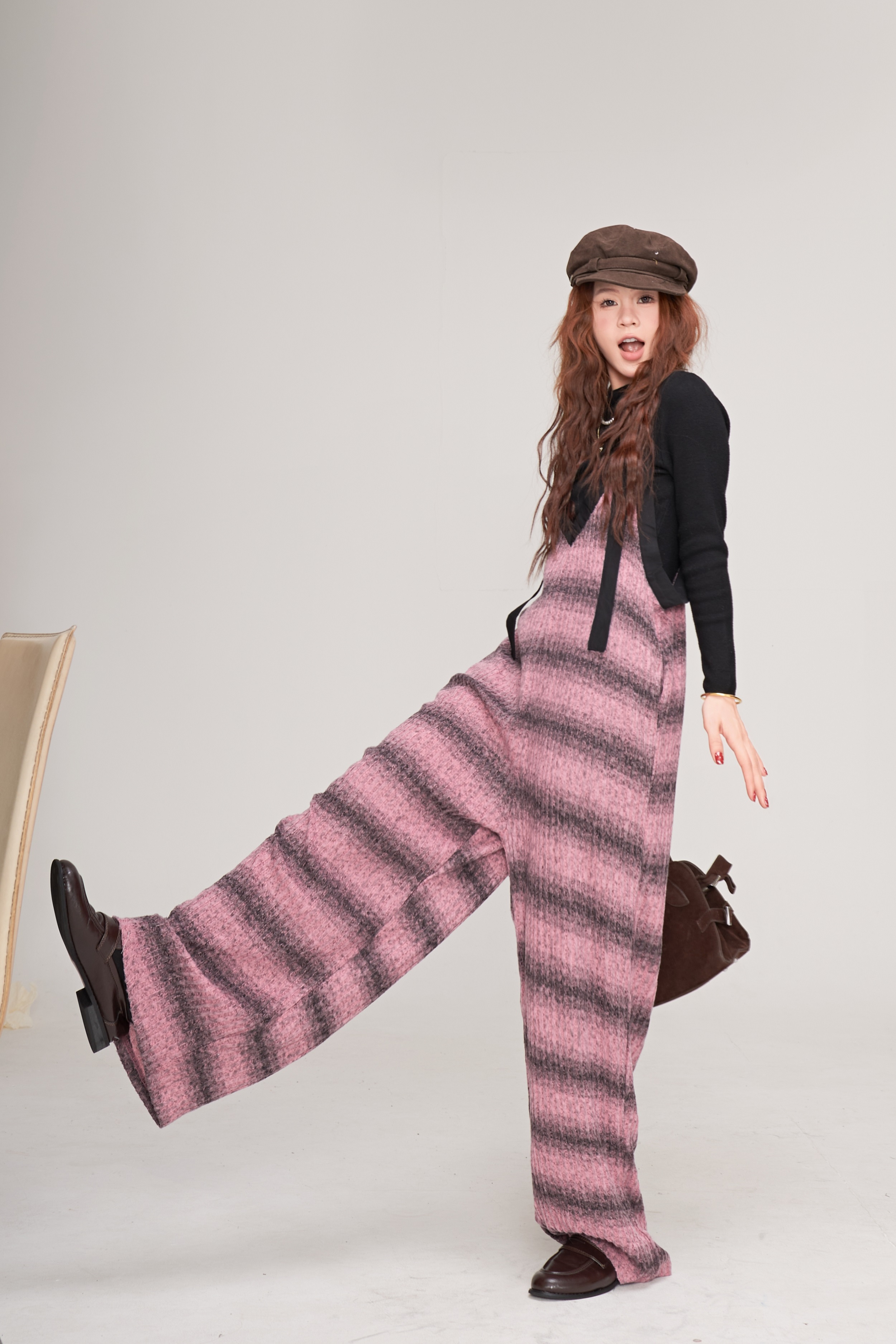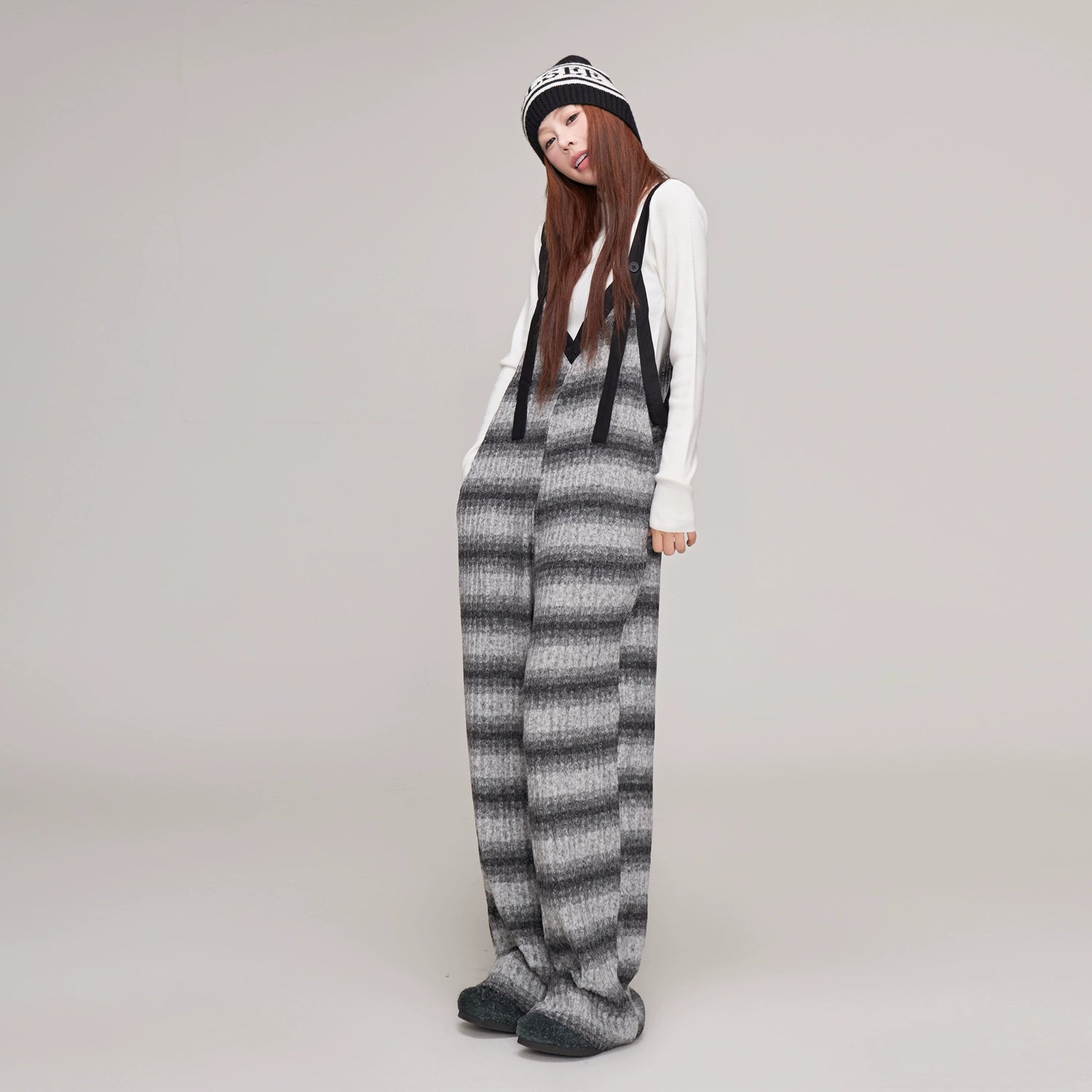【ボトムス】秋冬 ゆったりVネック ニットサロペット グラデーション ワイドパンツ レディース オールインワン【SHシリーズ】