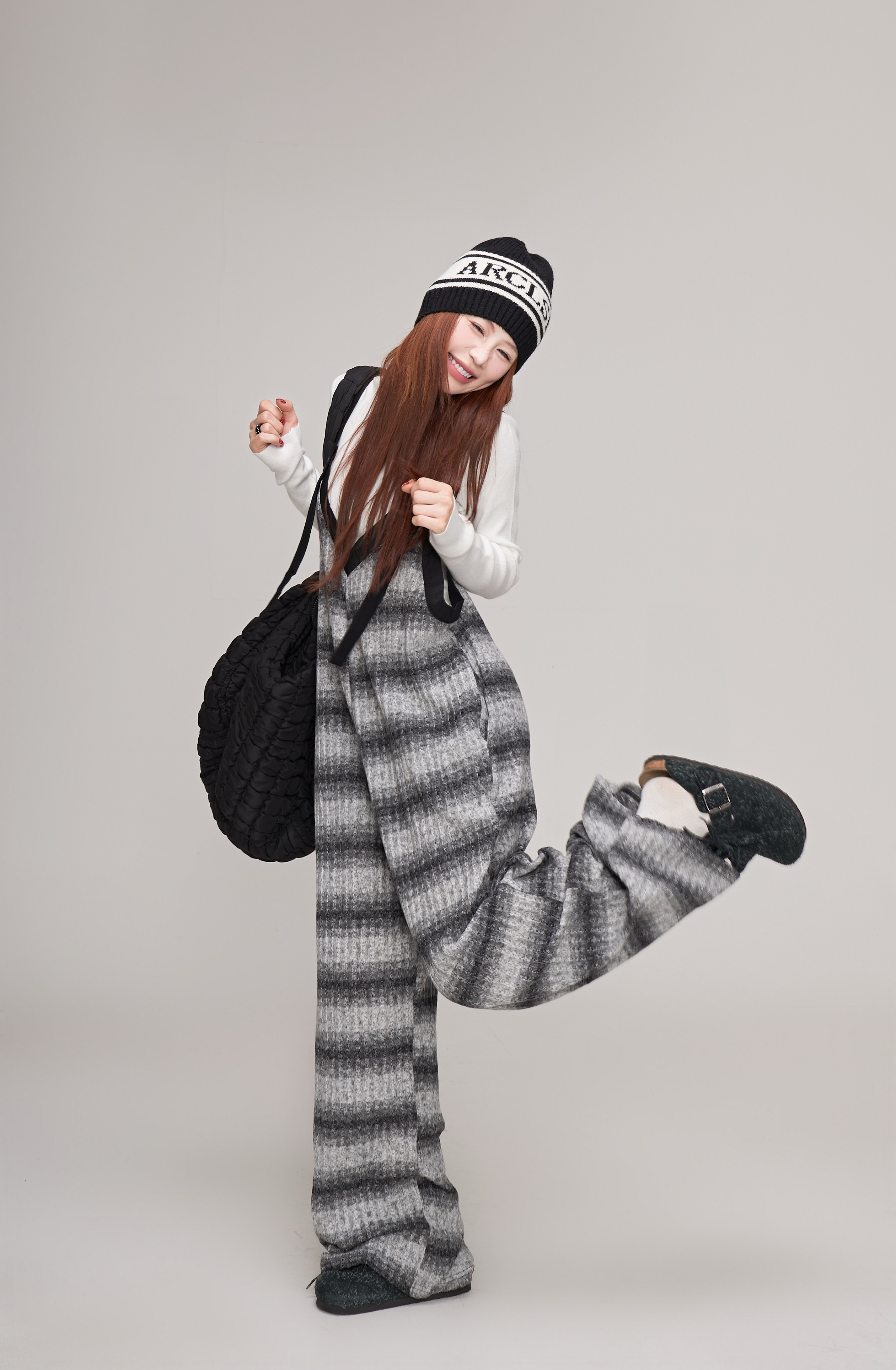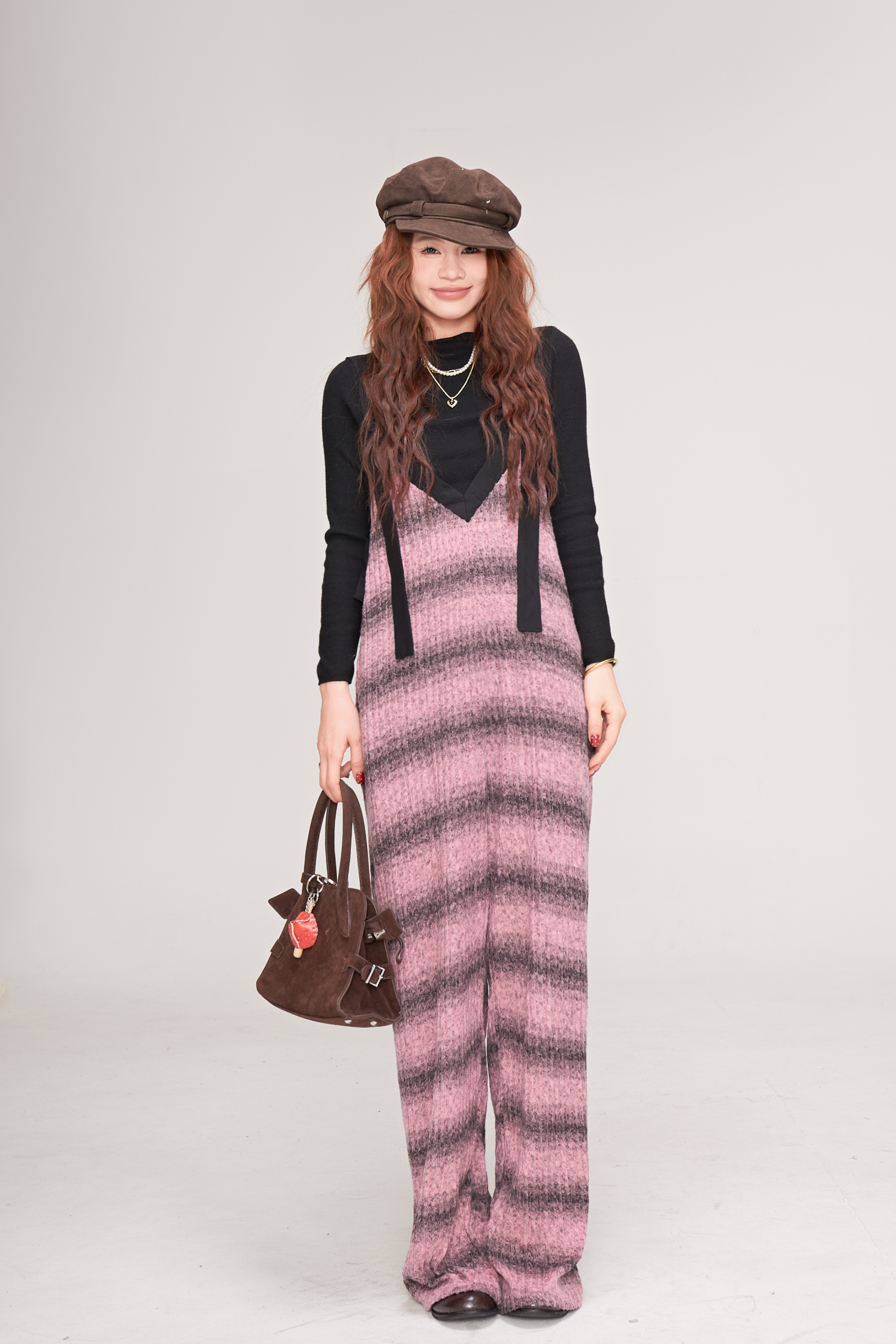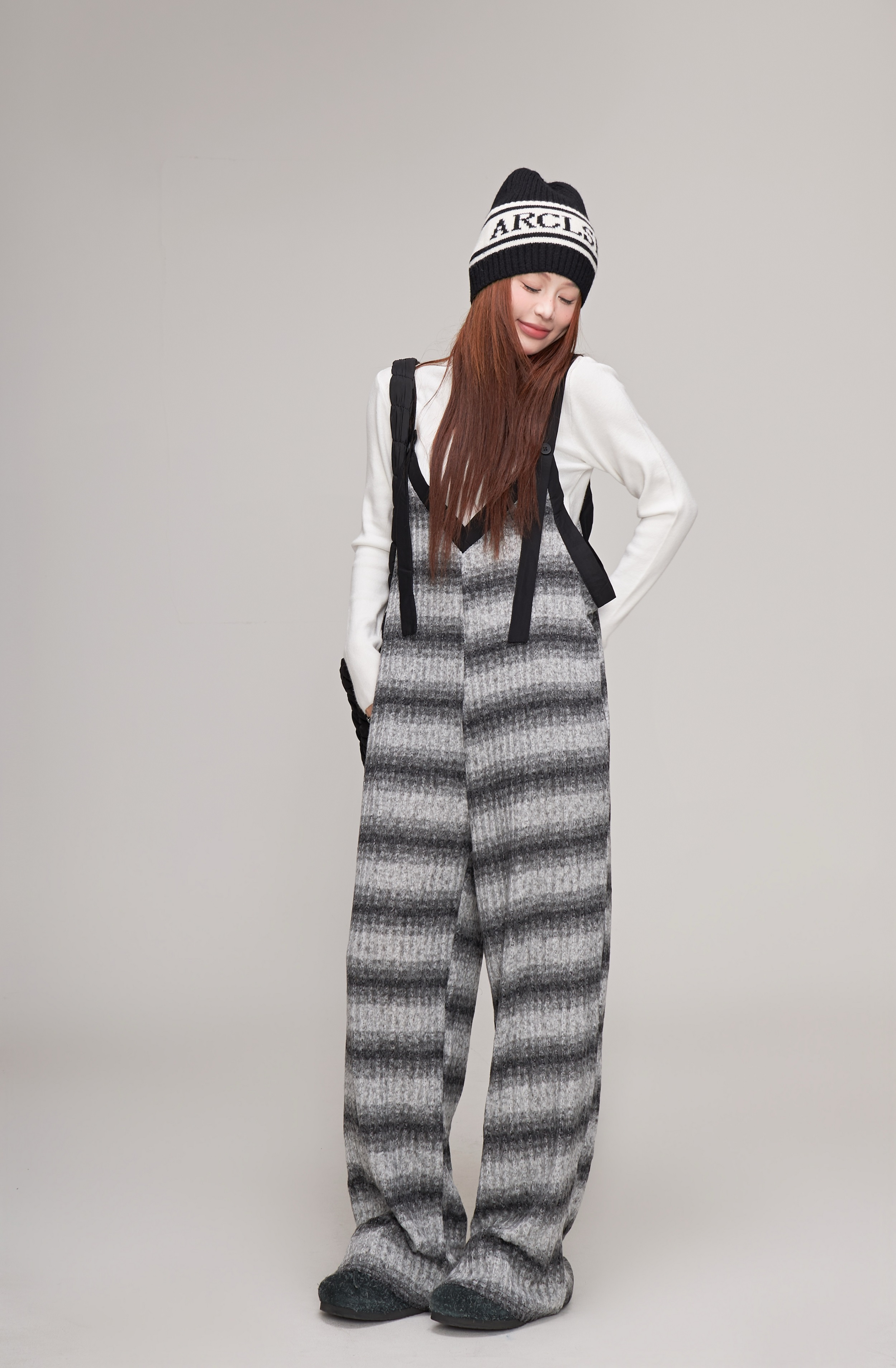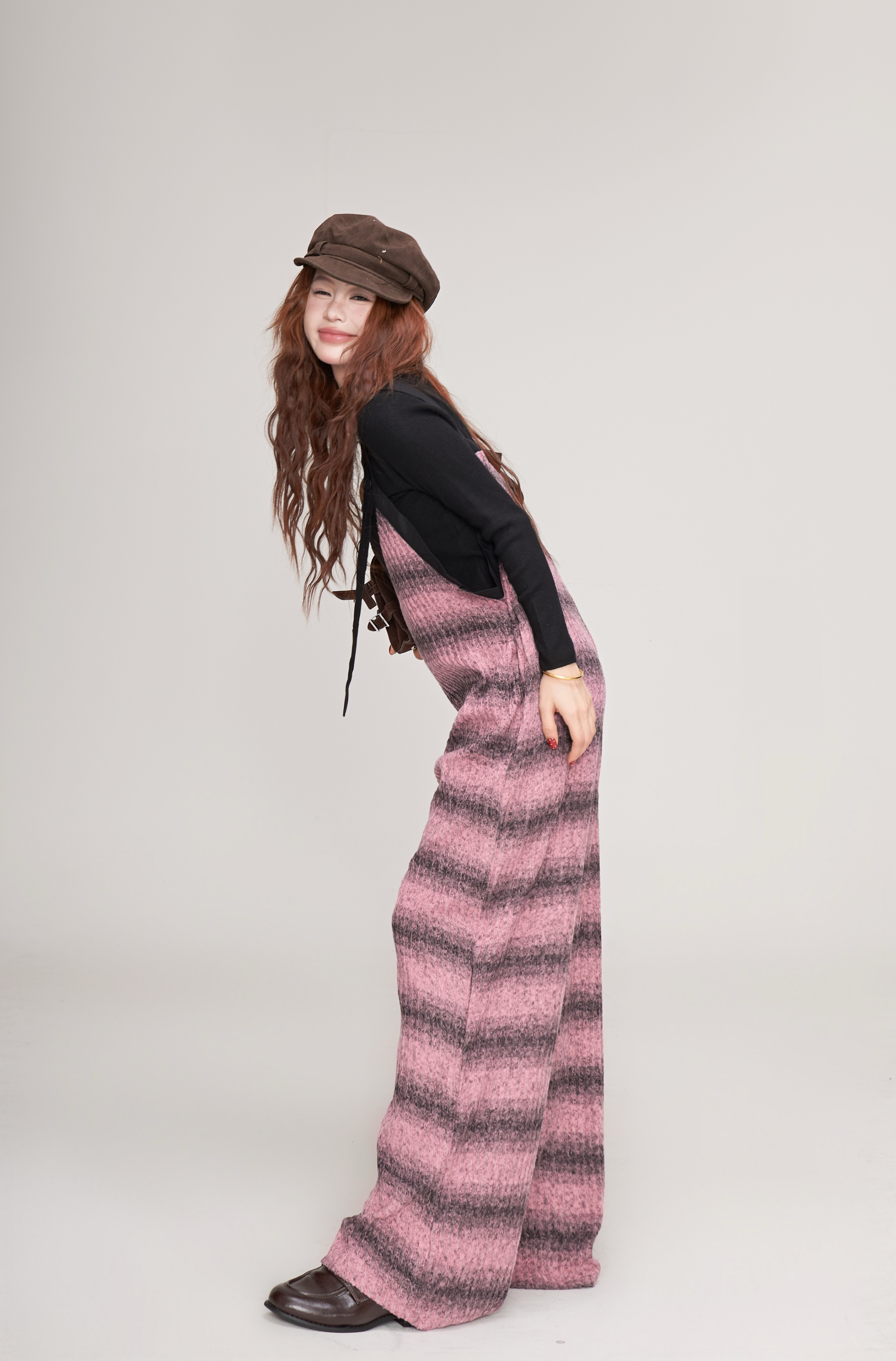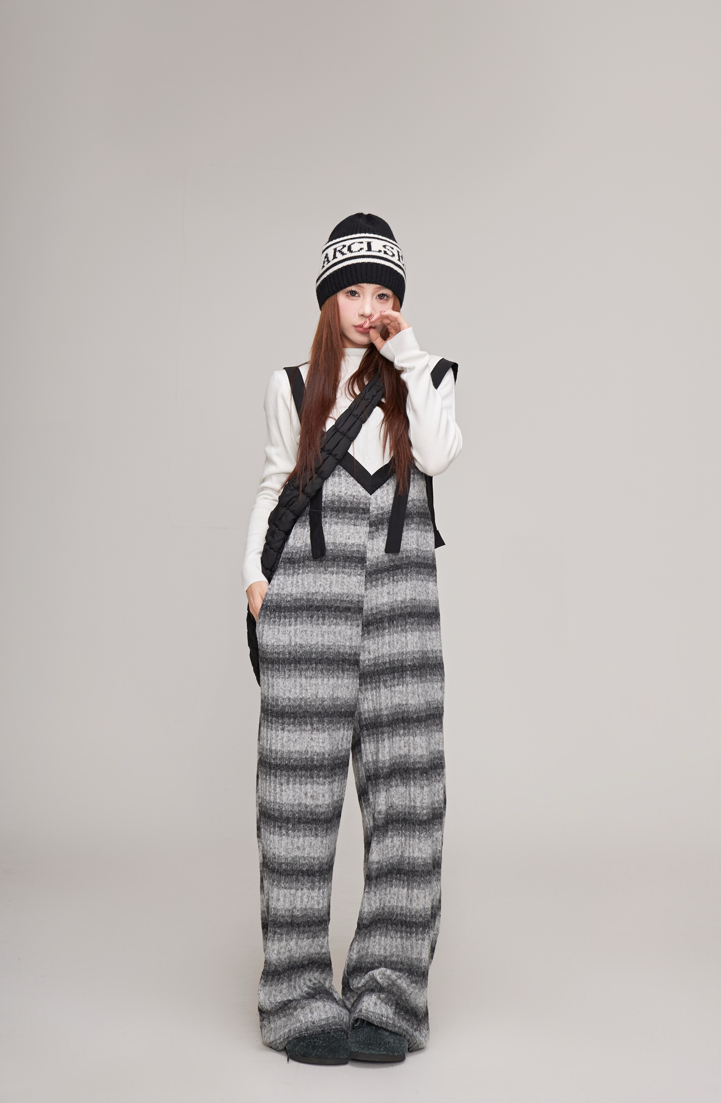 【ボトムス】秋冬 ゆったりVネック ニットサロペット グラデーション ワイドパンツ レディース オールインワン【SHシリーズ】
