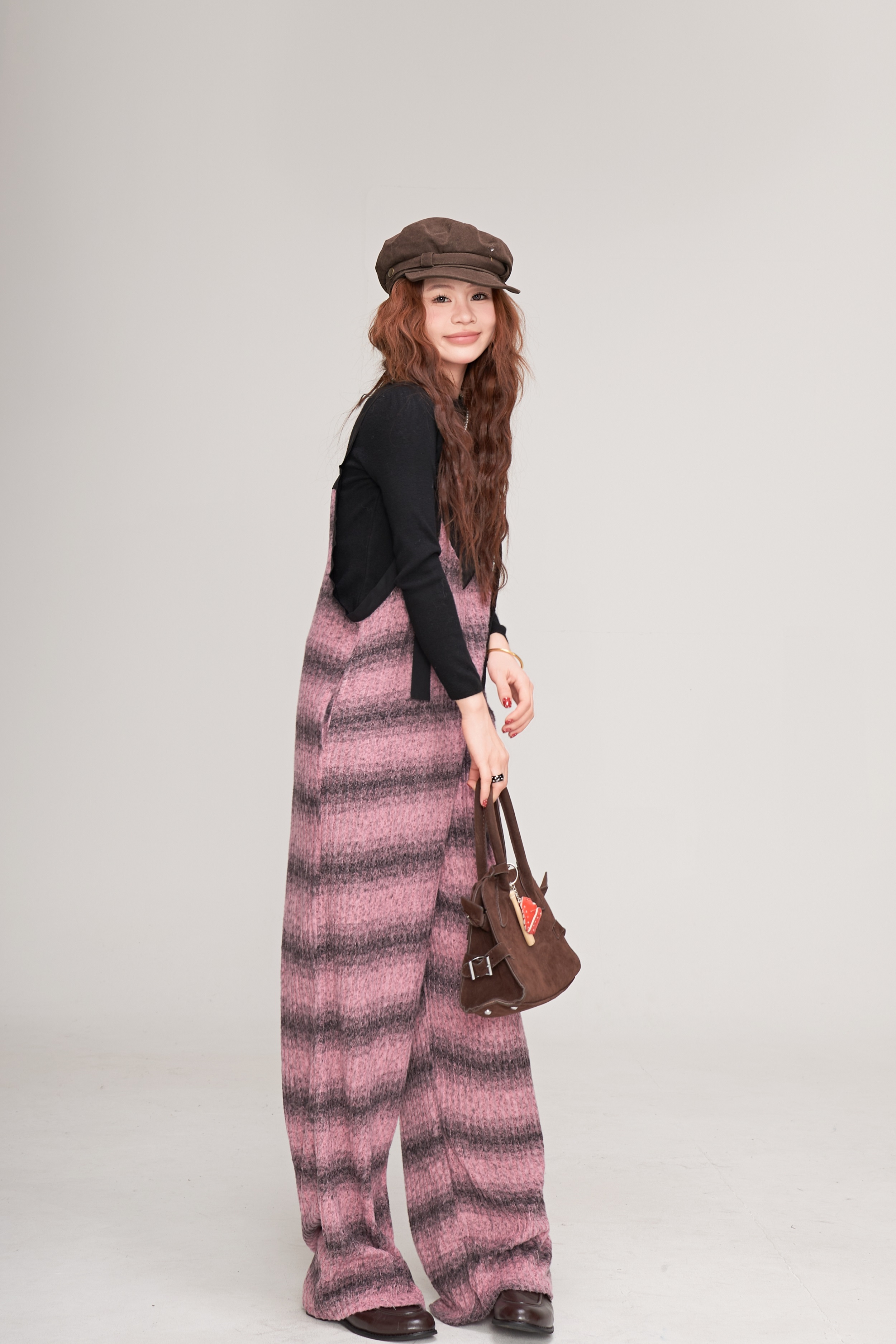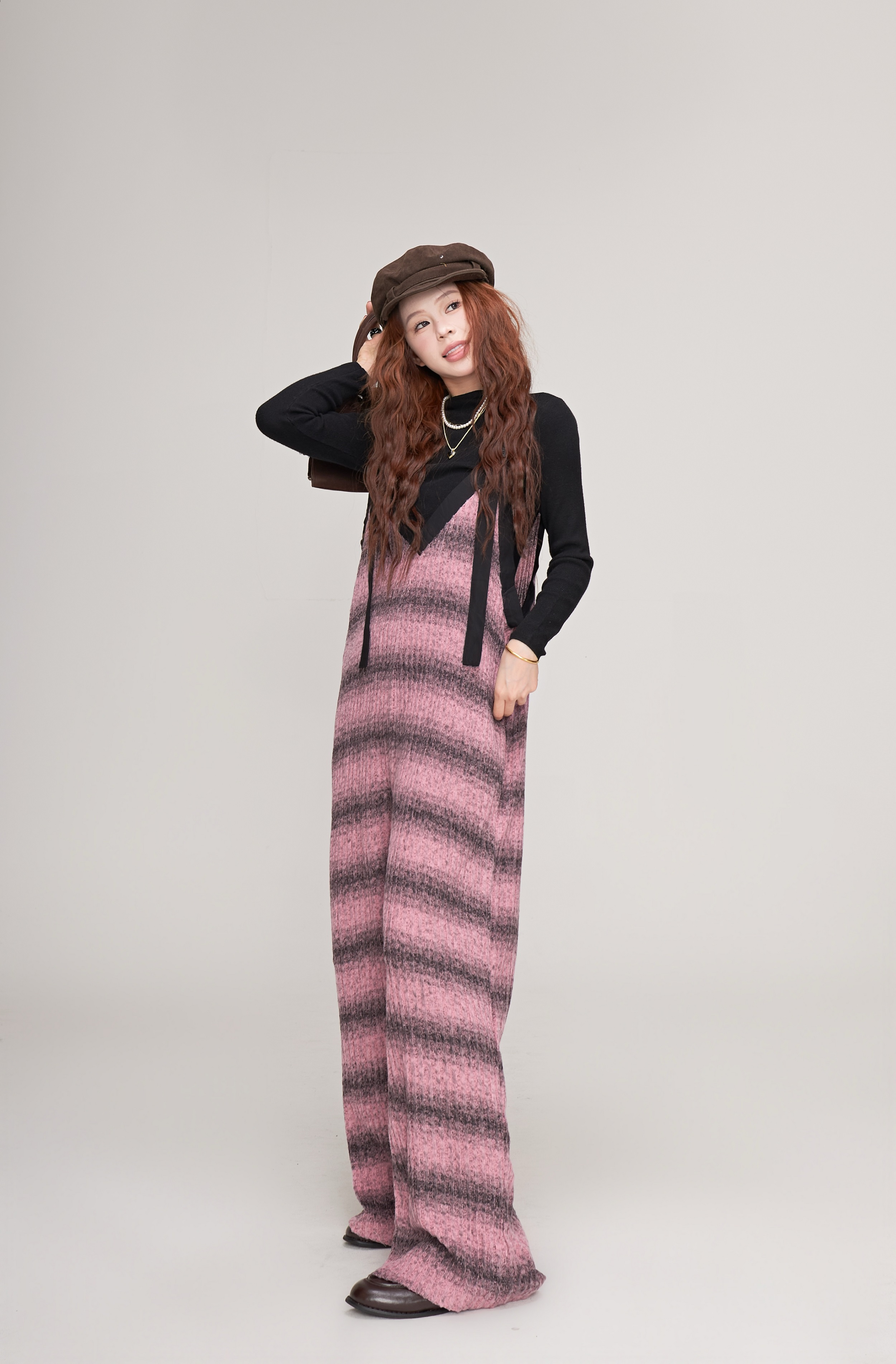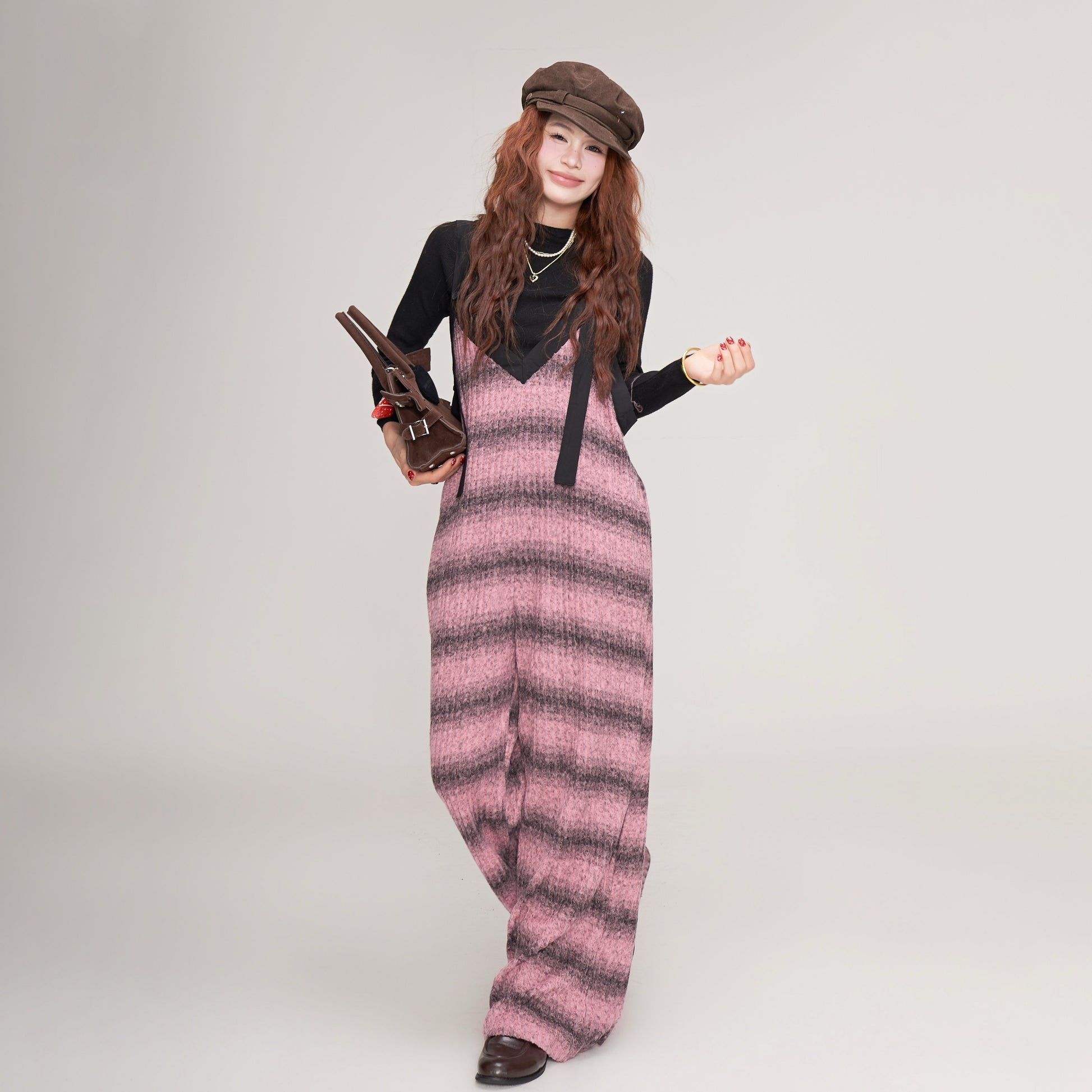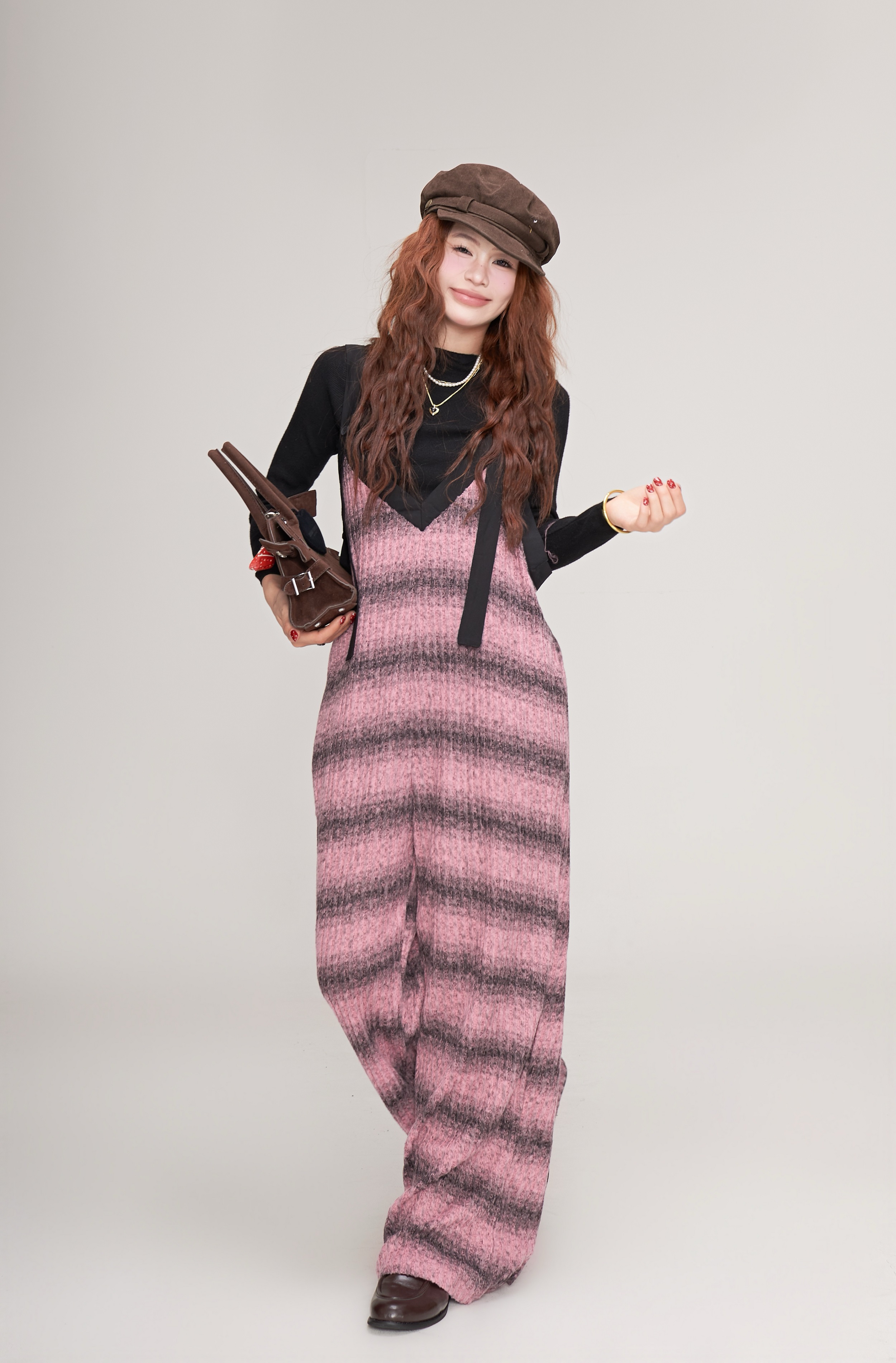 【ボトムス】秋冬 ゆったりVネック ニットサロペット グラデーション ワイドパンツ レディース オールインワン【SHシリーズ】