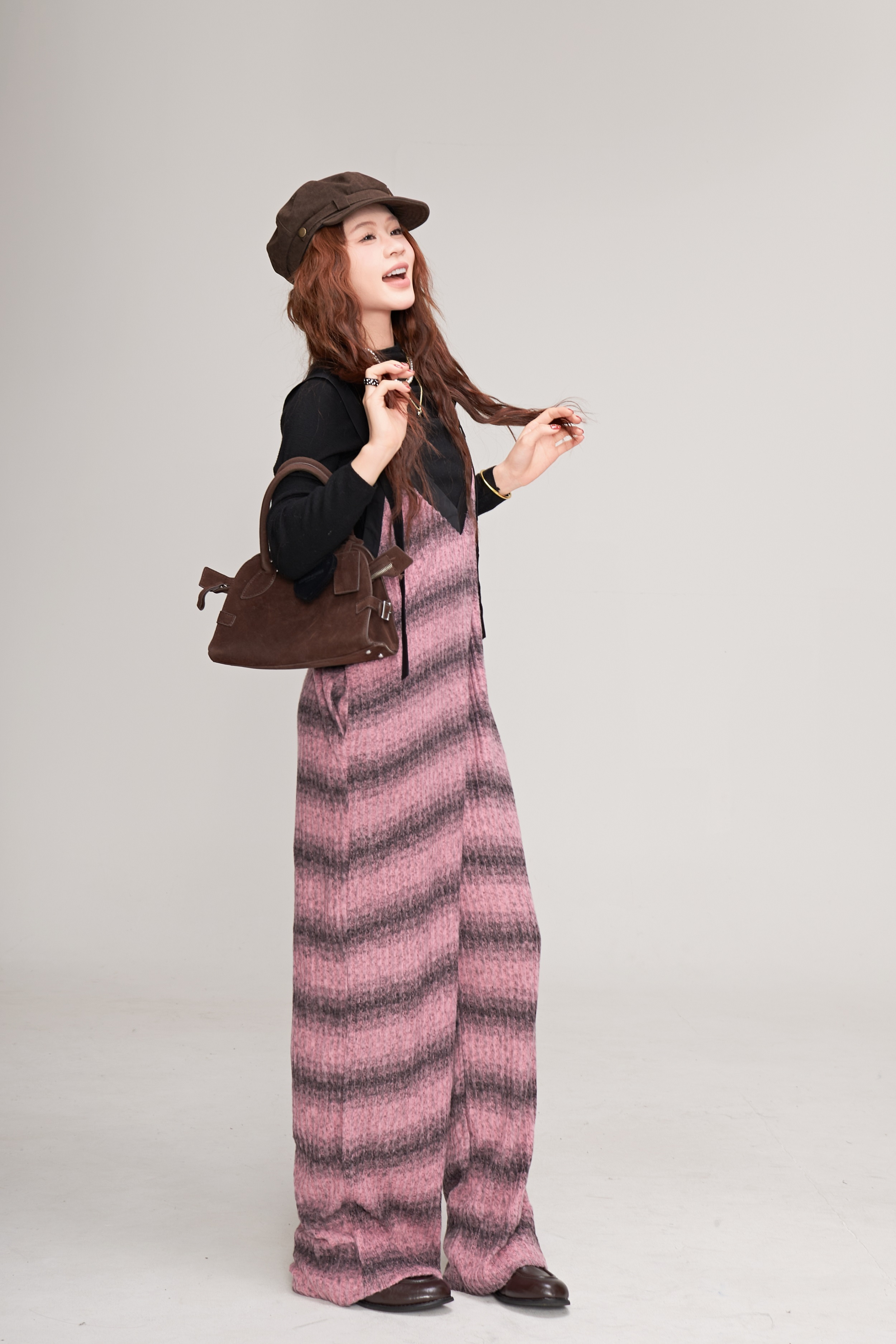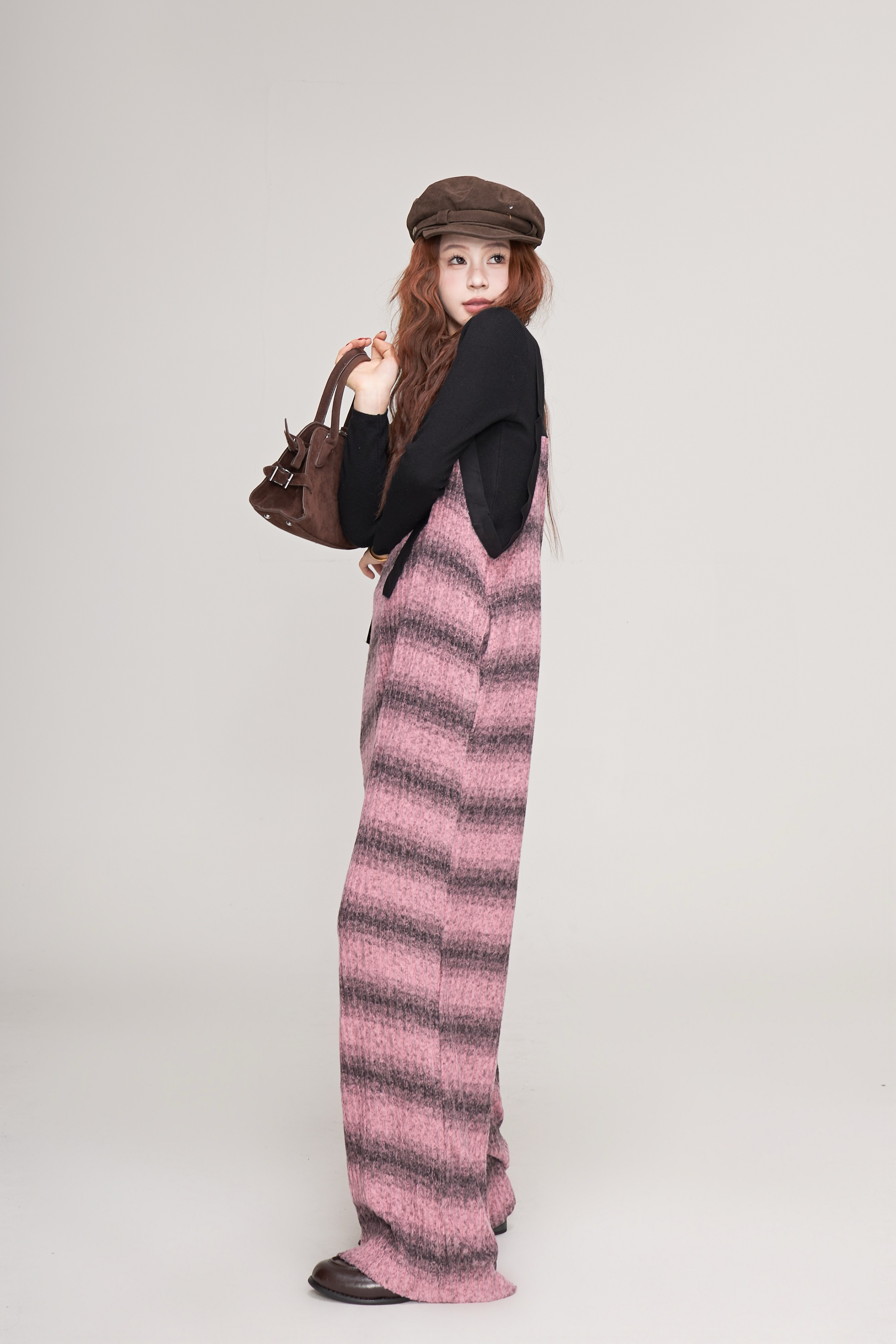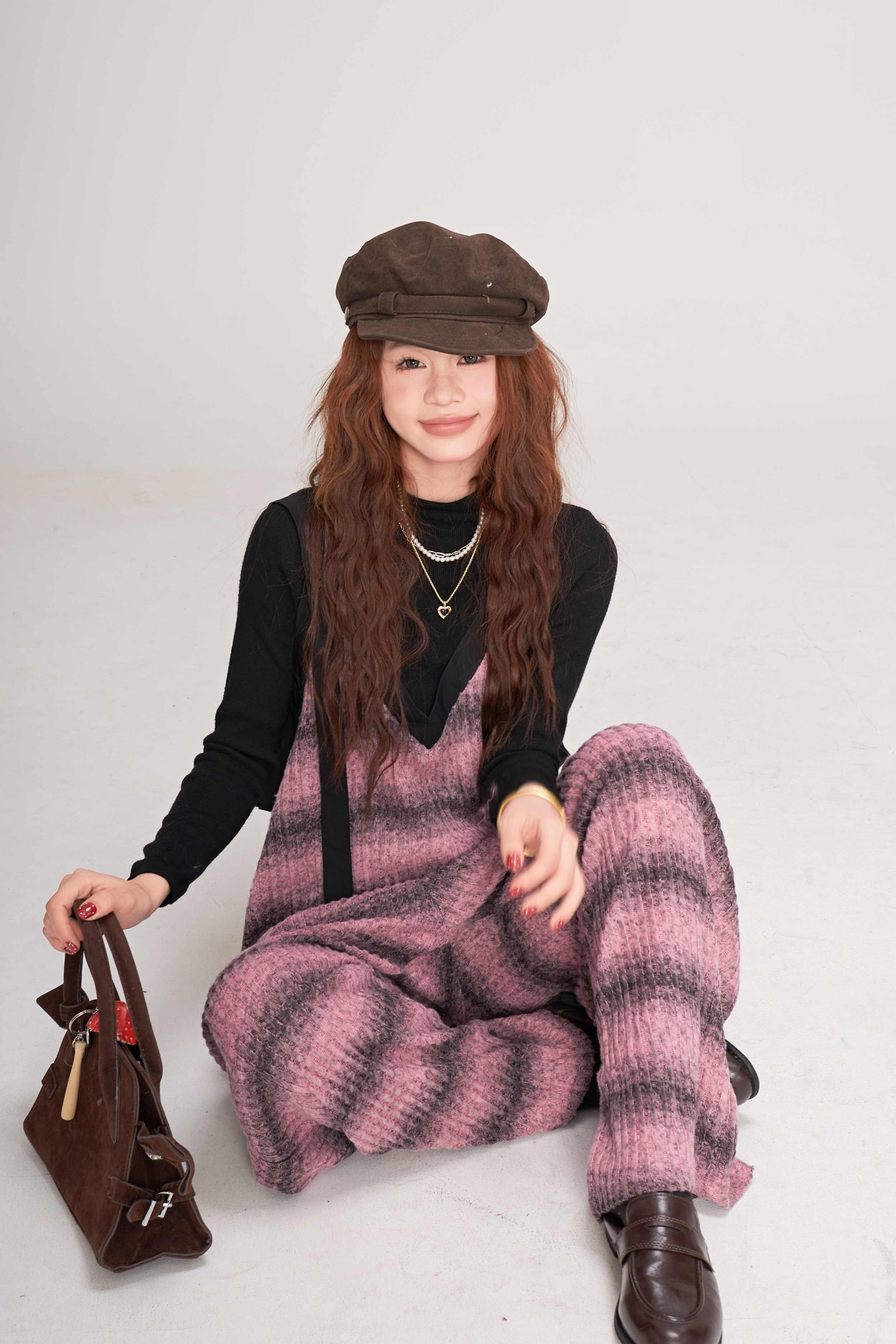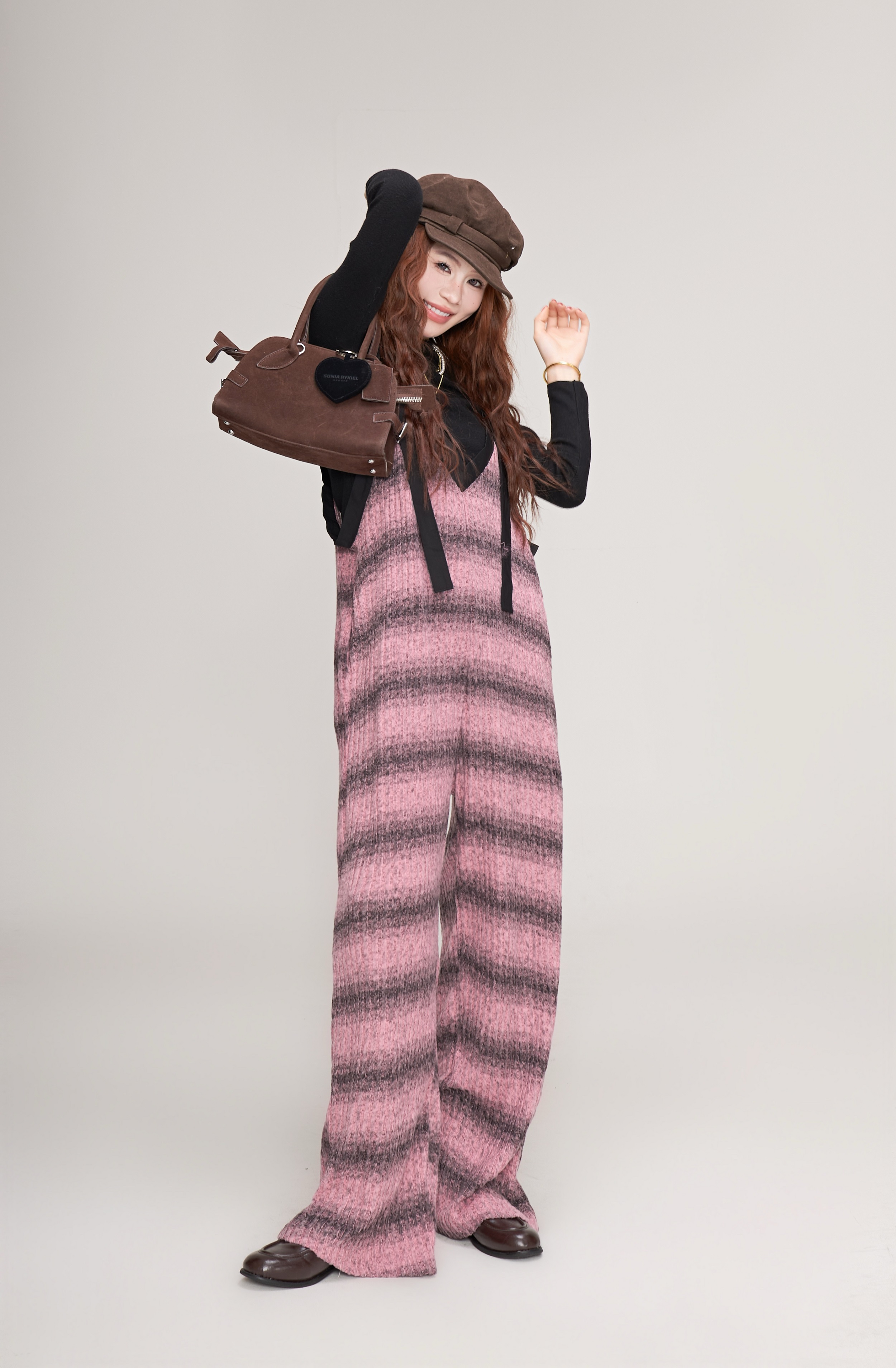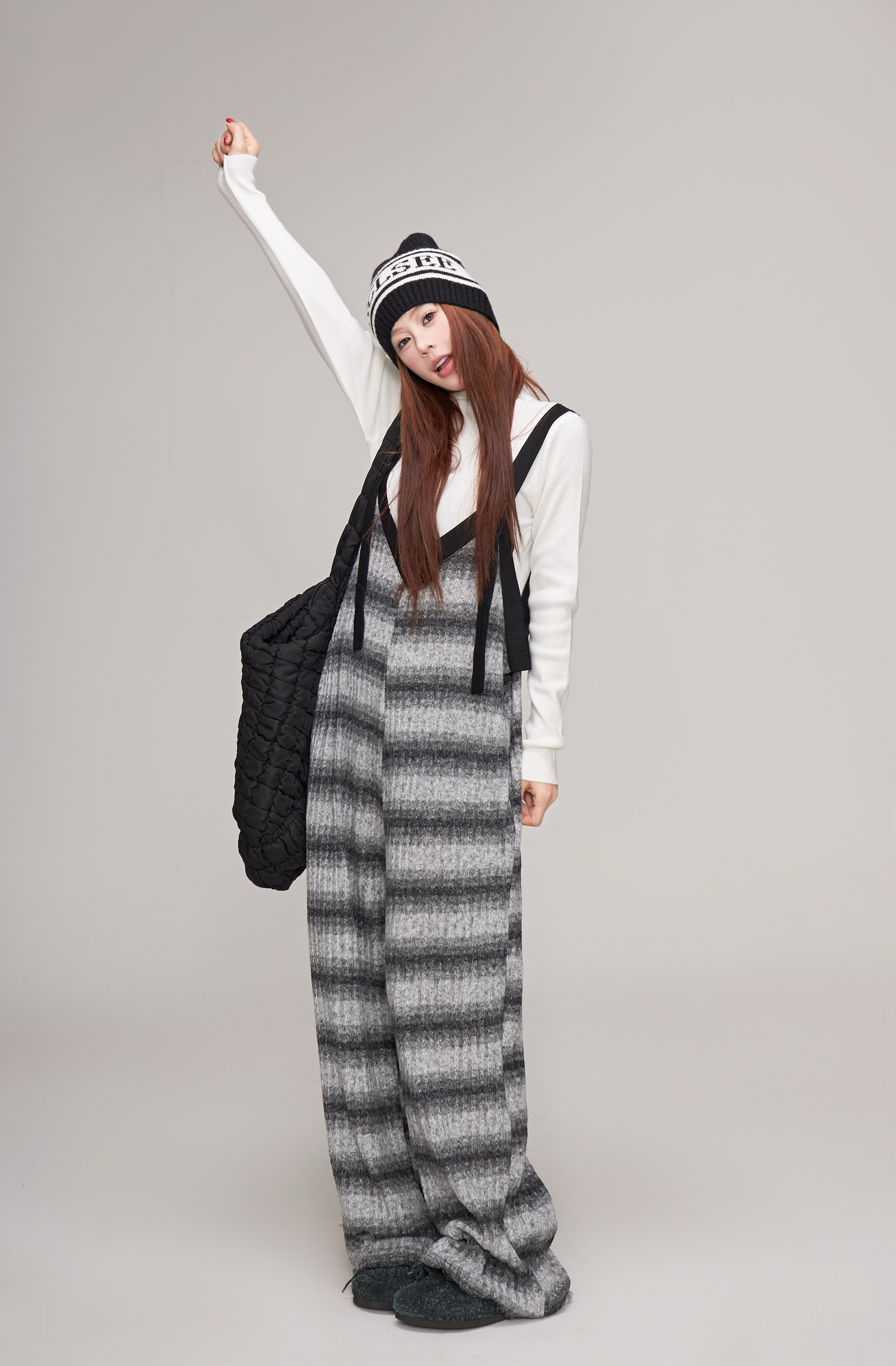 【ボトムス】秋冬 ゆったりVネック ニットサロペット グラデーション ワイドパンツ レディース オールインワン【SHシリーズ】