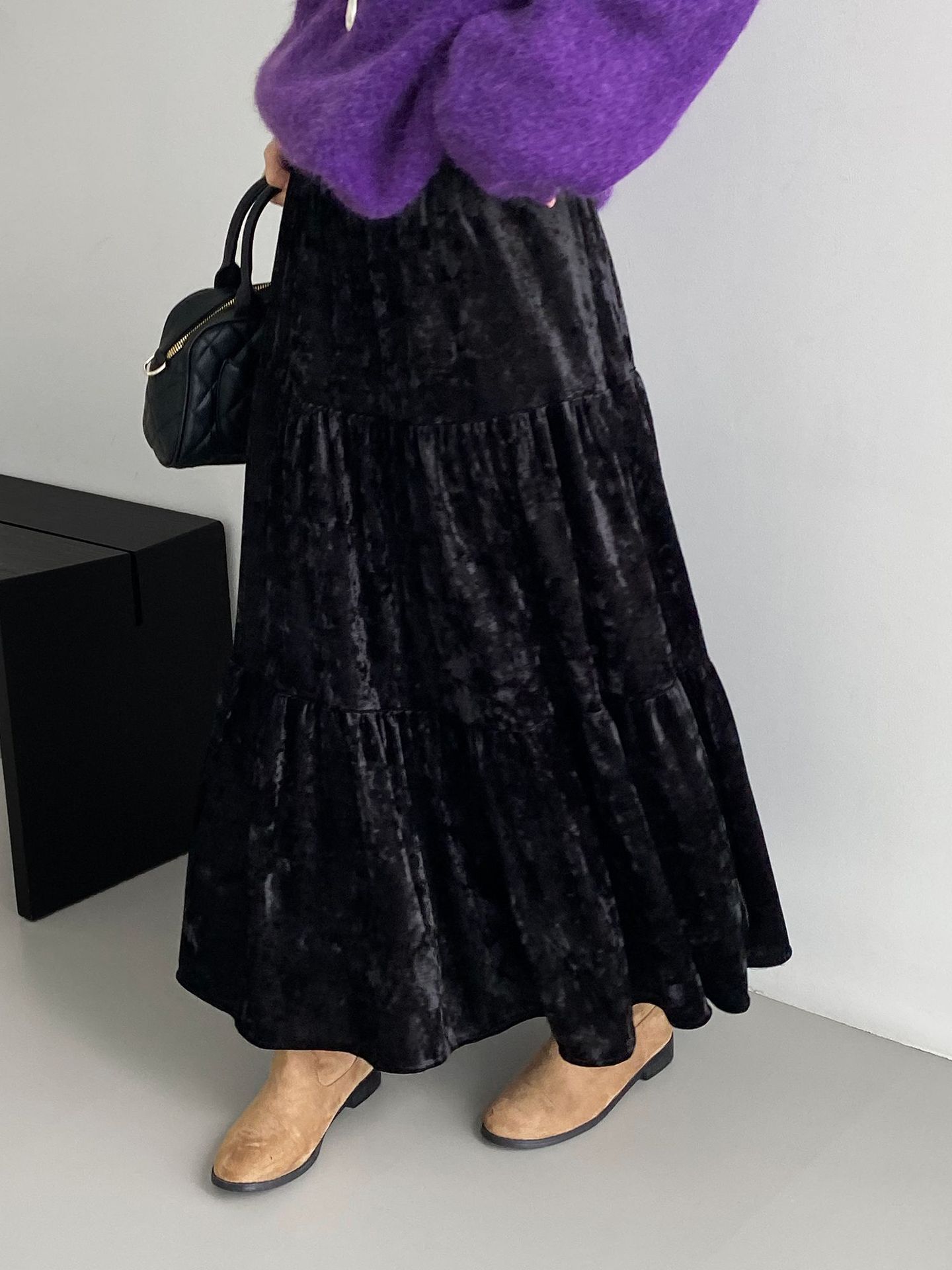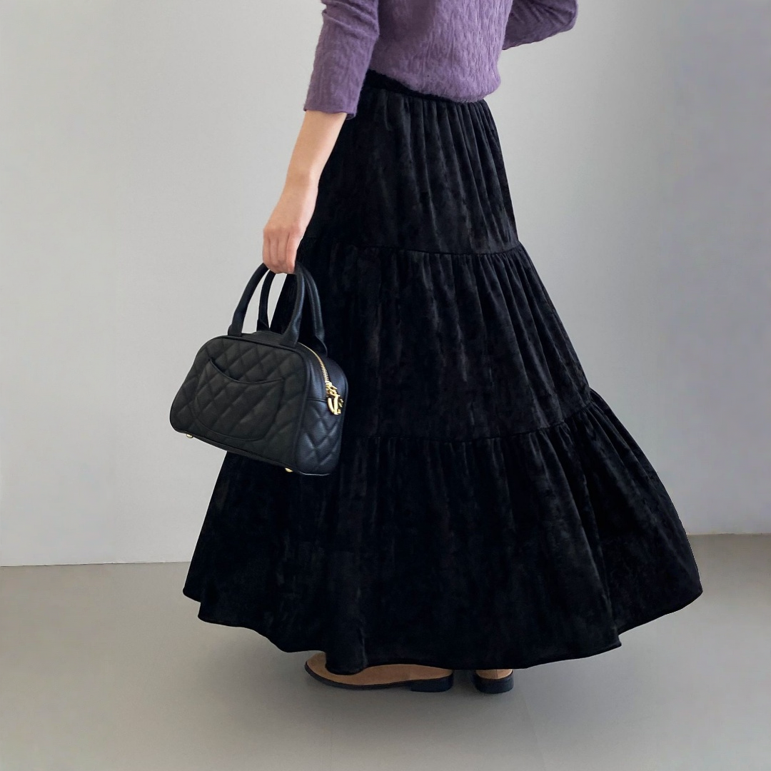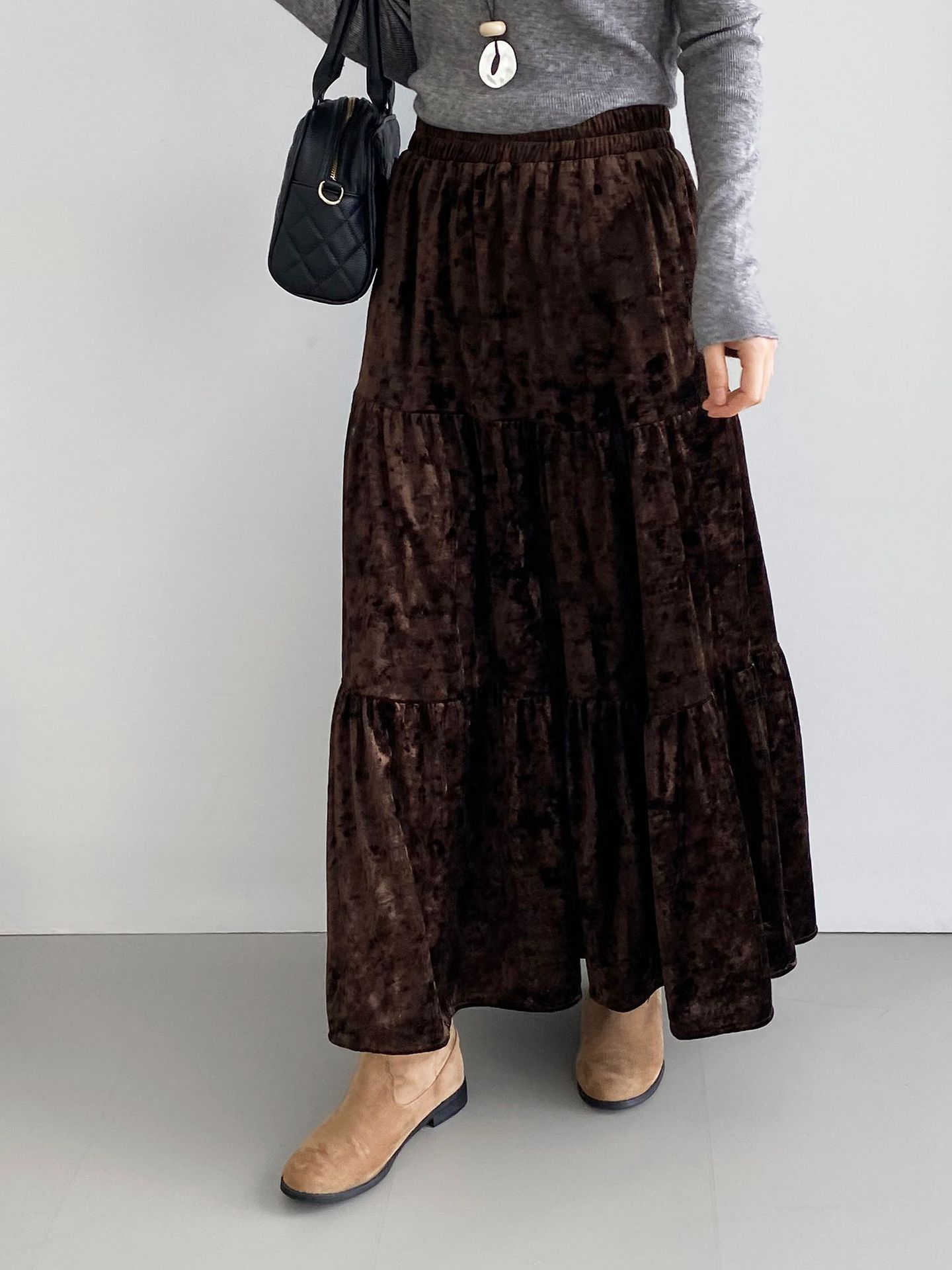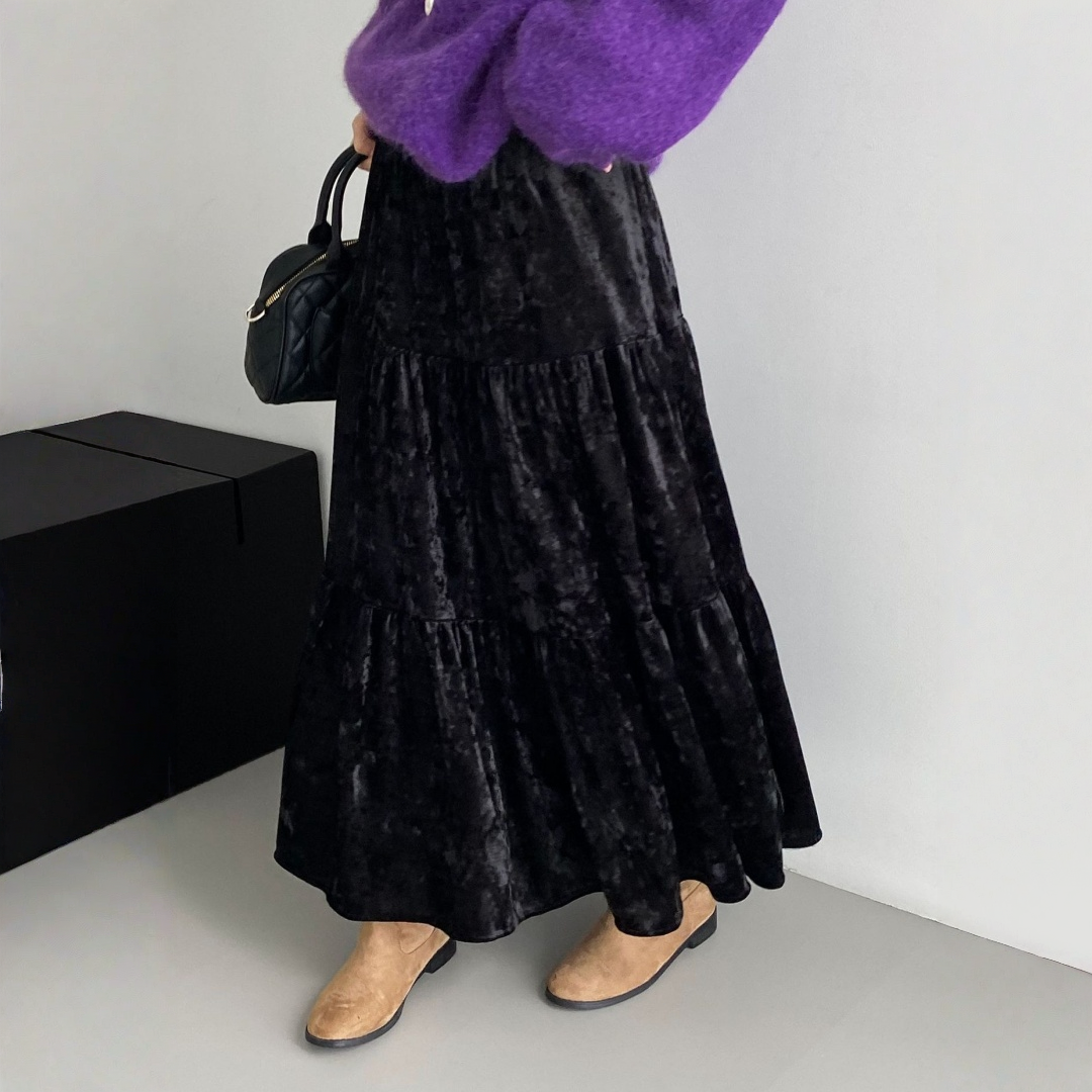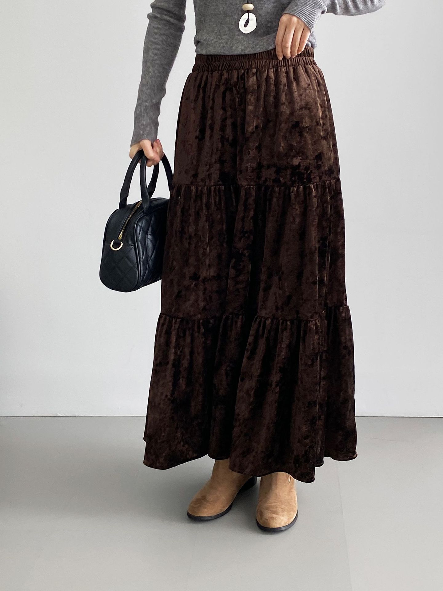 【ボトムス】春 秋 冬 ウエストゴム入り ベルベット素材 フレア スカート 【JZシリーズ】