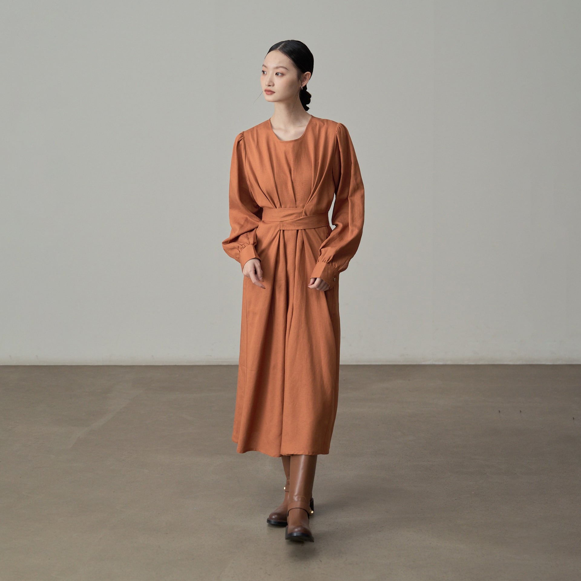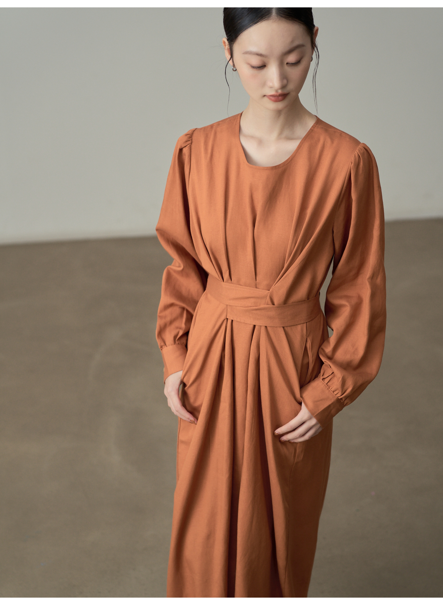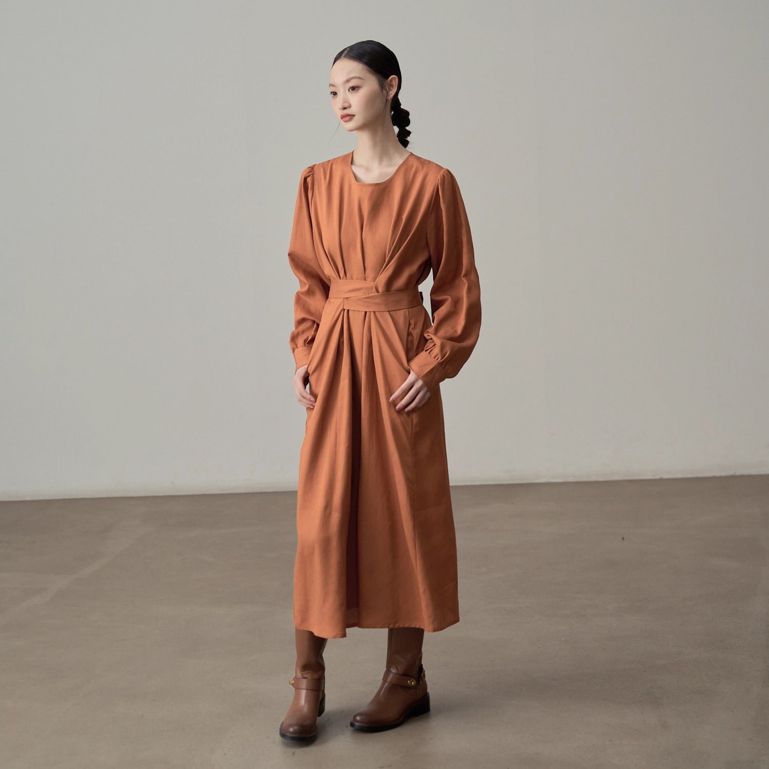 【ワンピース】フレンチレトロ風 オレンジリボン長袖ワンピース レディース ウエストシェイプ ロング丈【JZシリーズ】