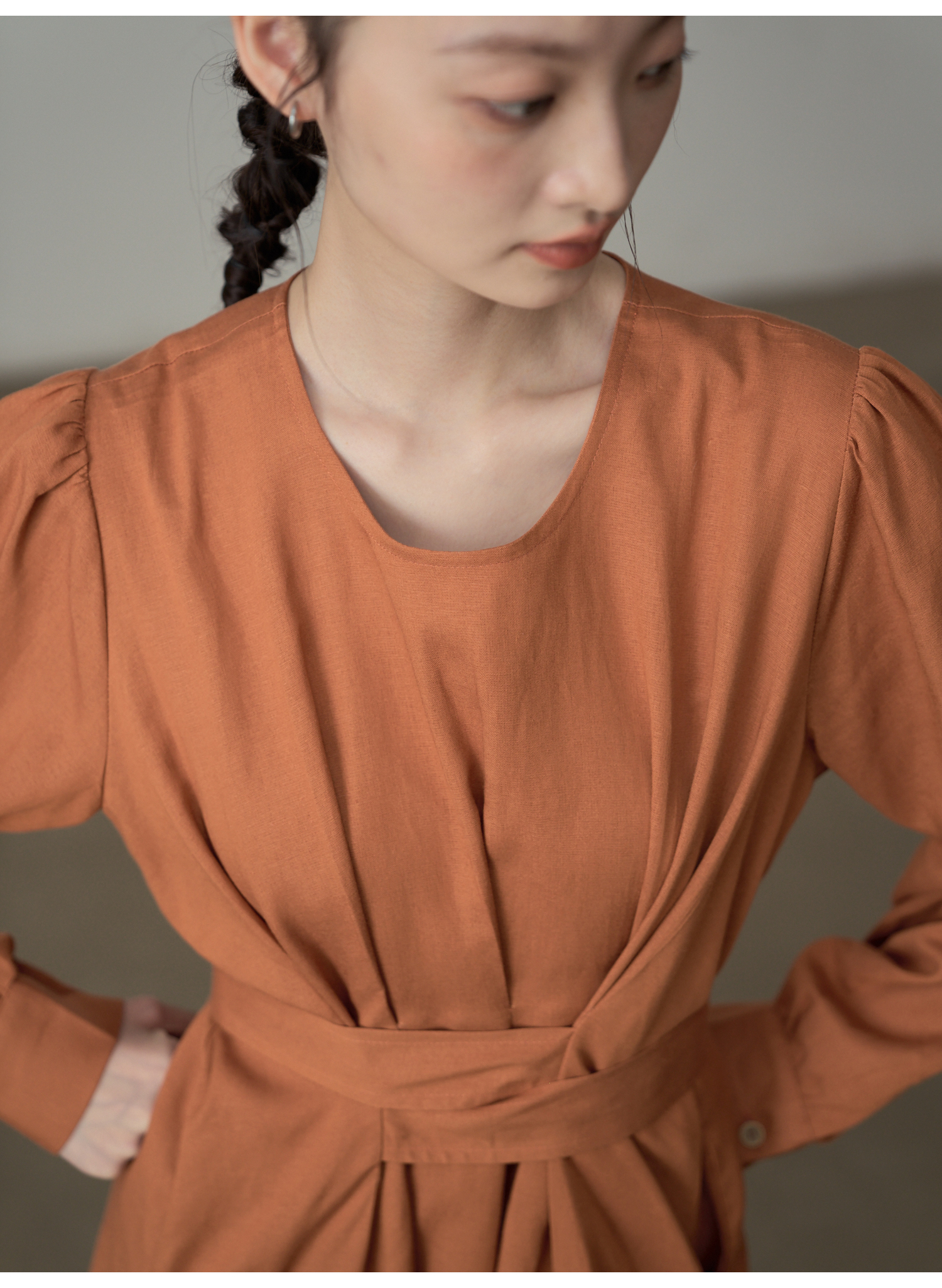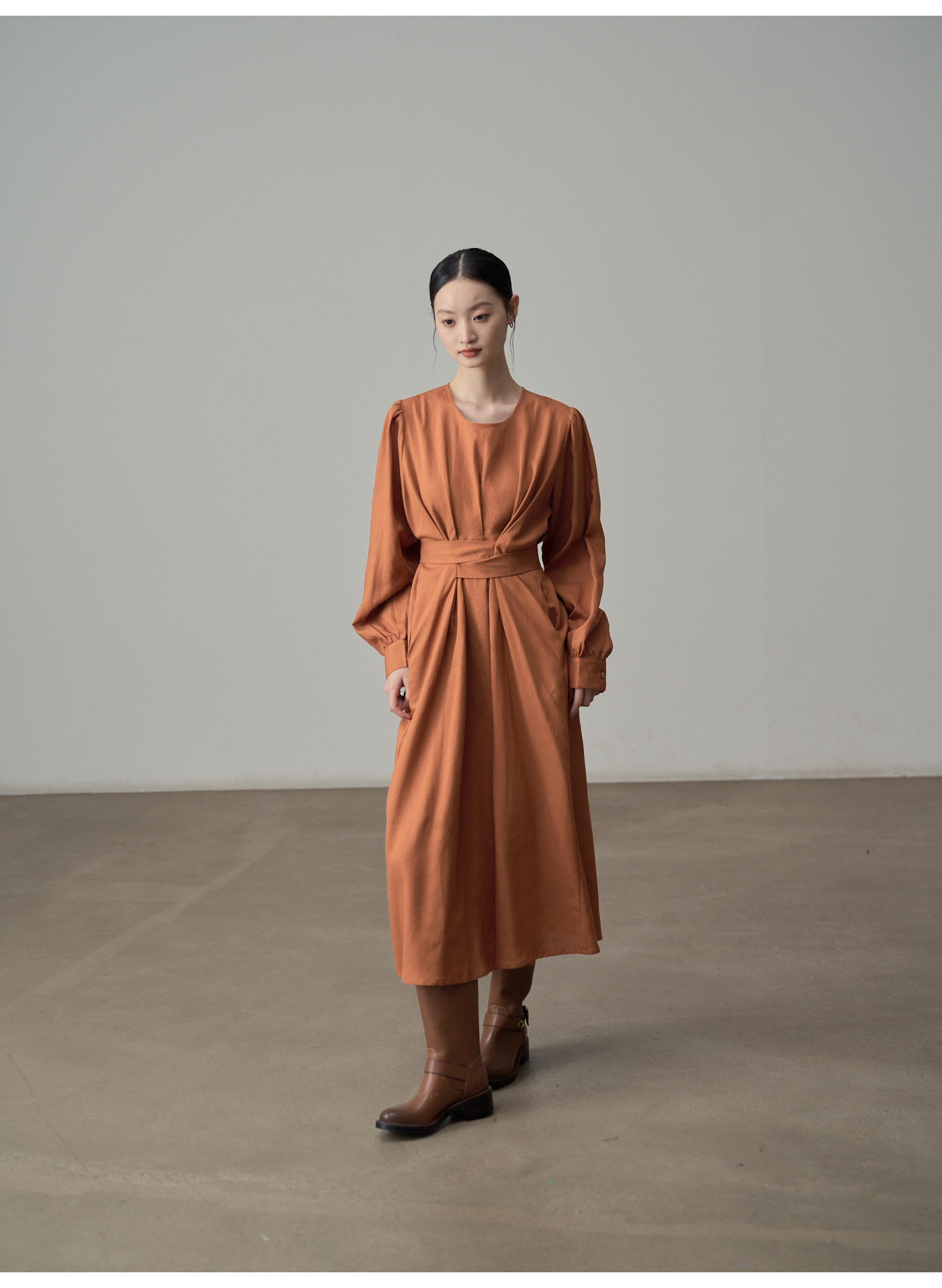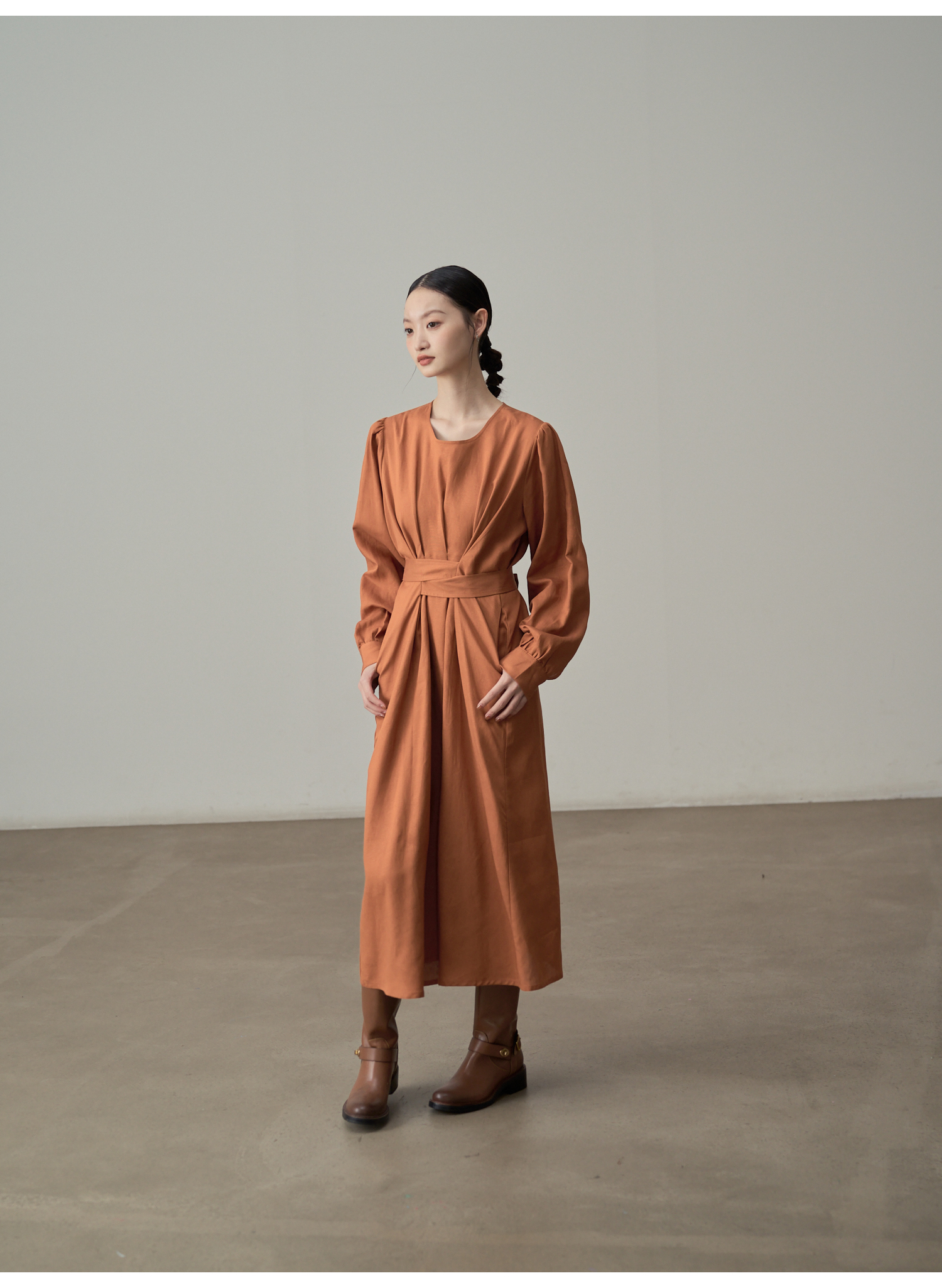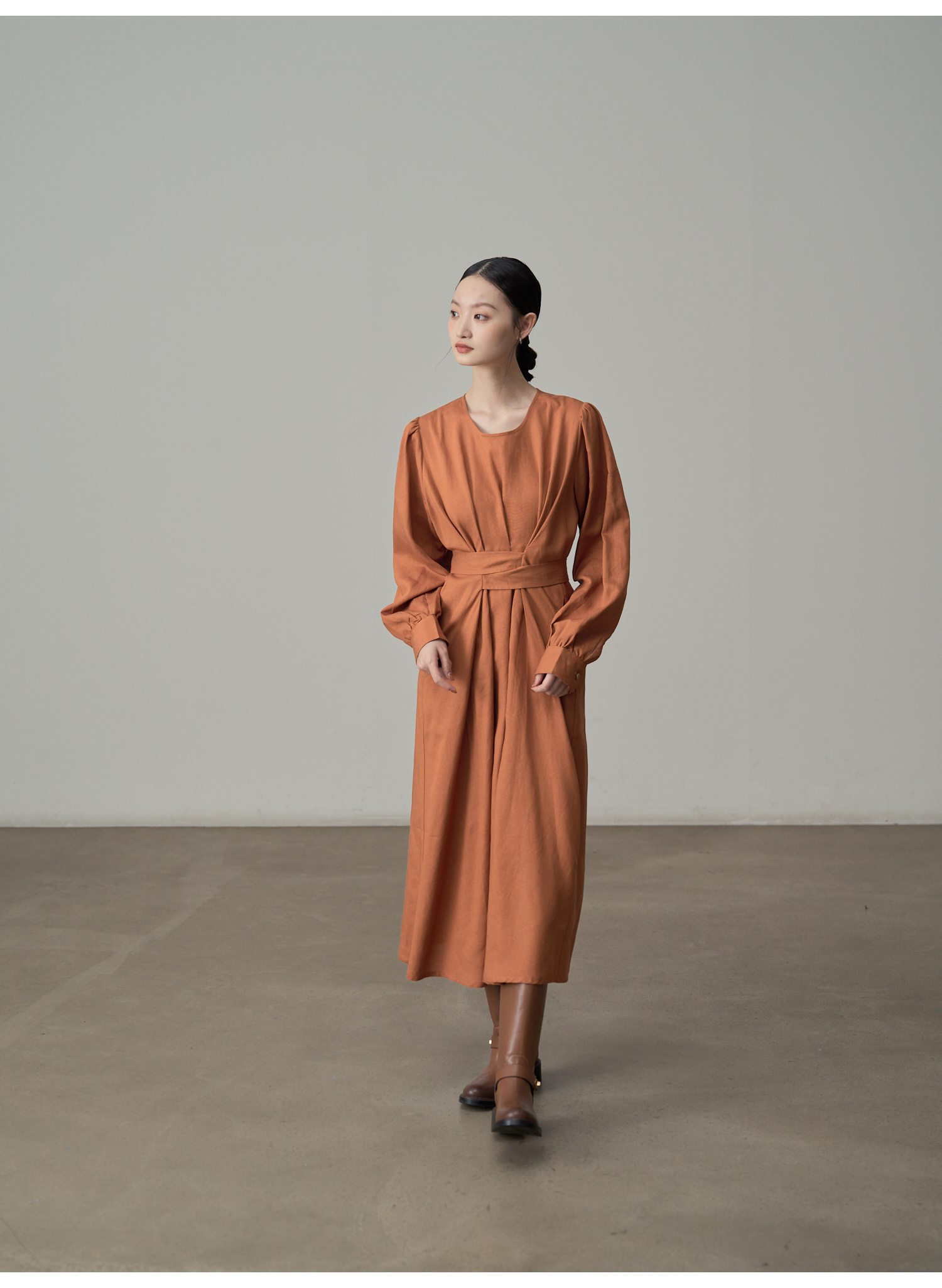 【ワンピース】フレンチレトロ風 オレンジリボン長袖ワンピース レディース ウエストシェイプ ロング丈【JZシリーズ】