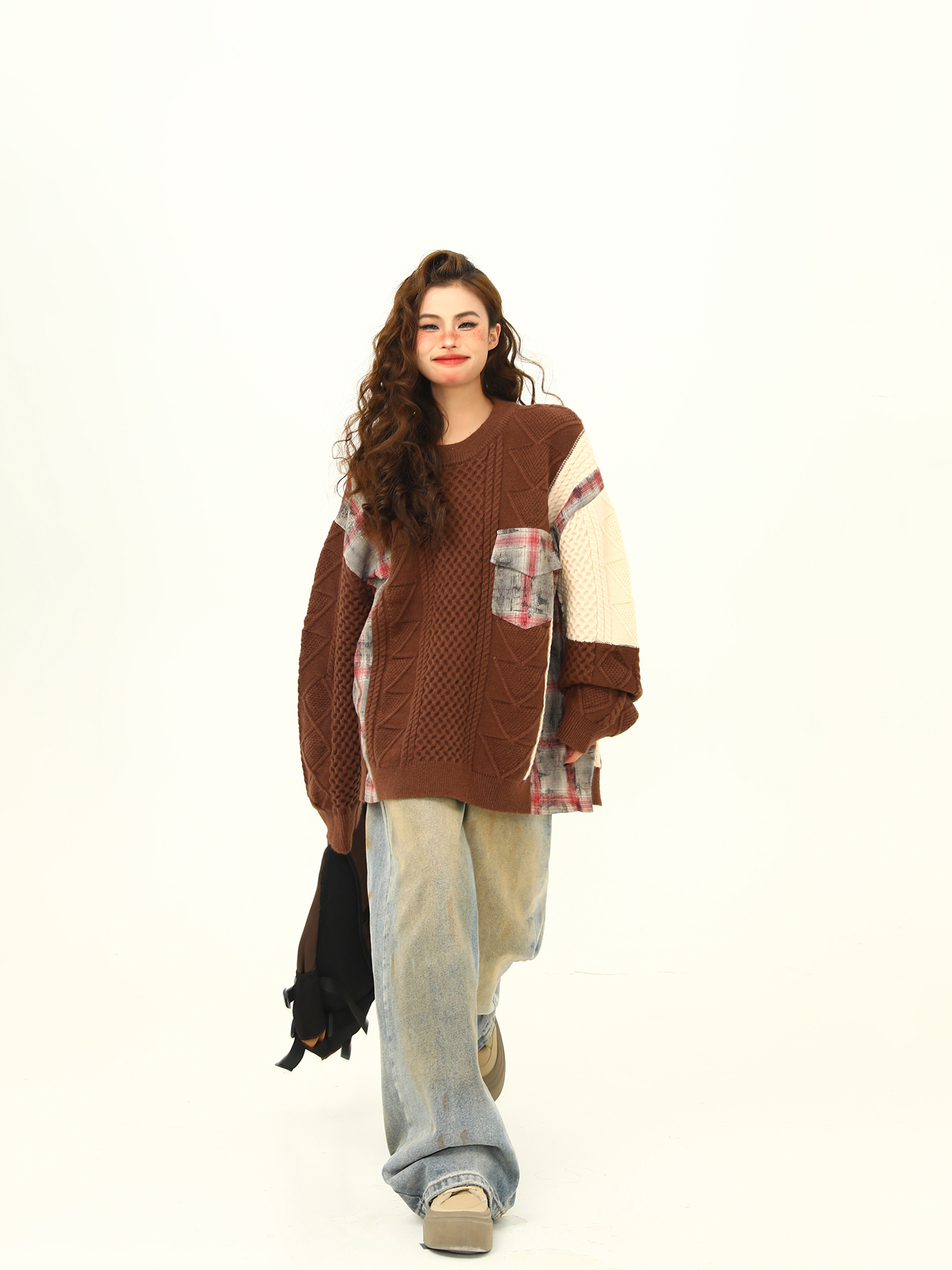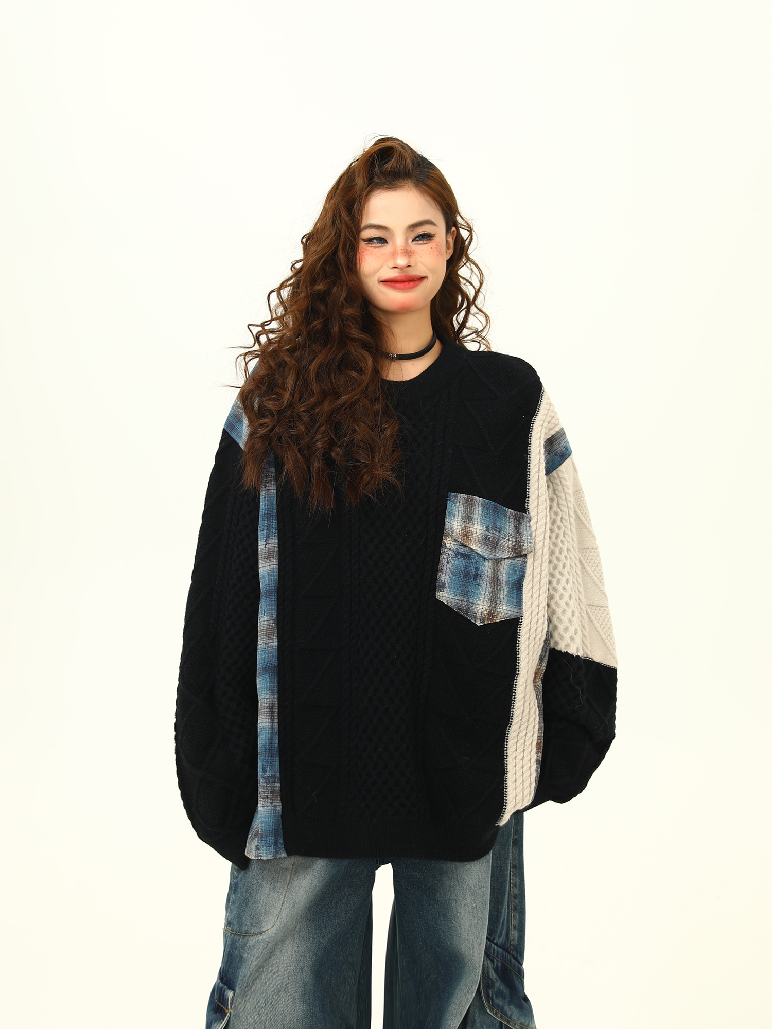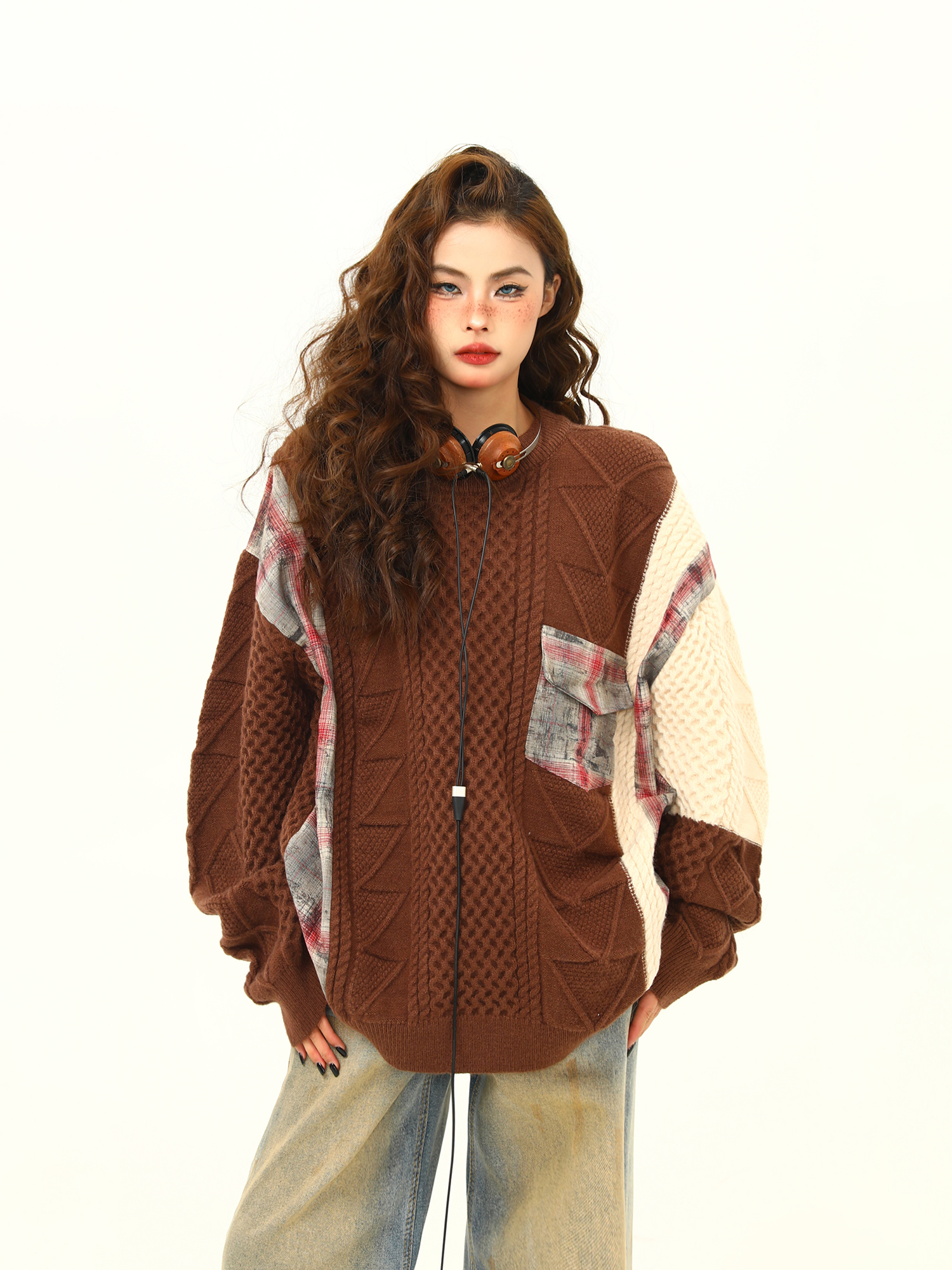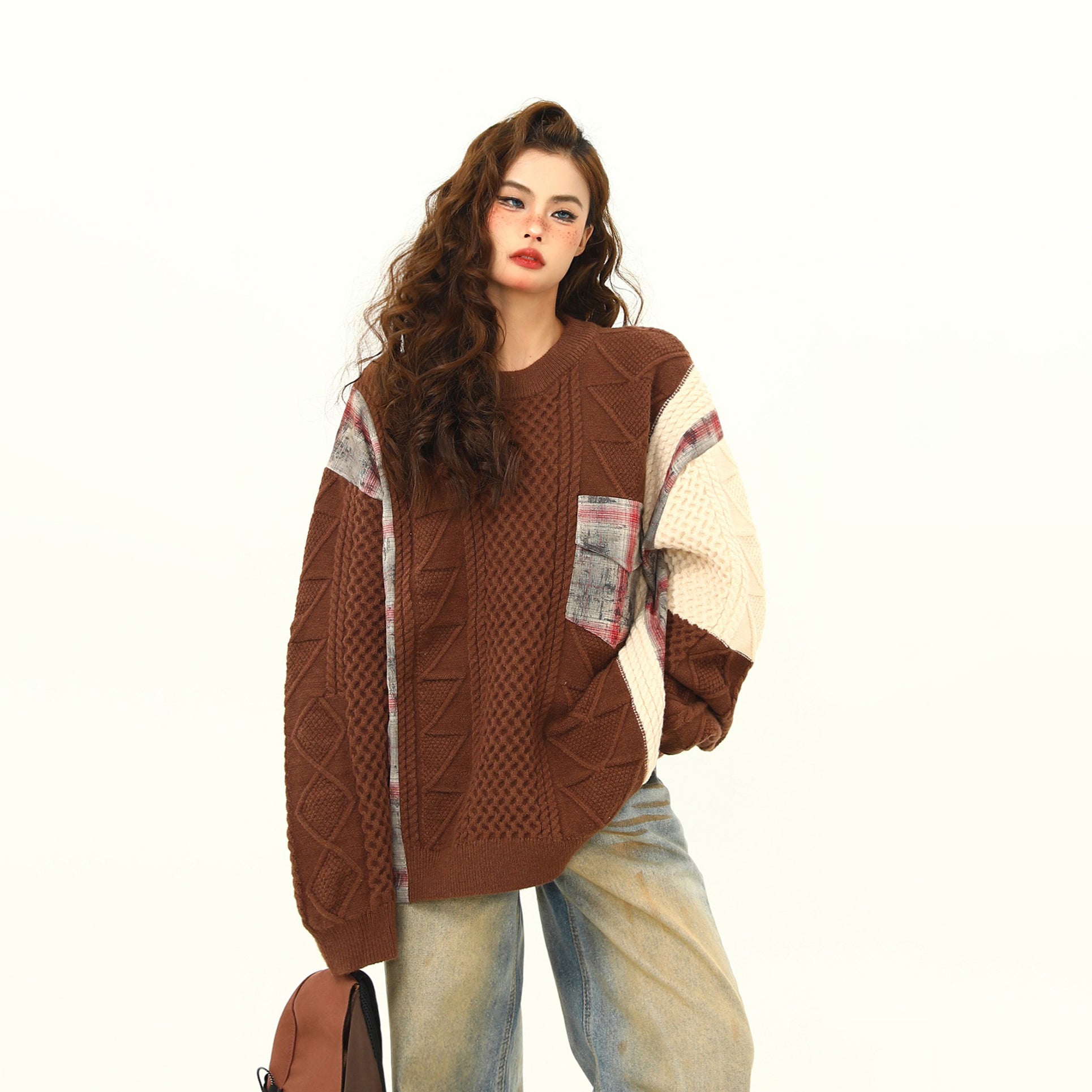 【トップス】ストリート感漂う配色ニット✨秋冬新作 ゆったりシルエットでこなれ感アップ ケーブル編み おしゃれ セーター【FCシリーズ】