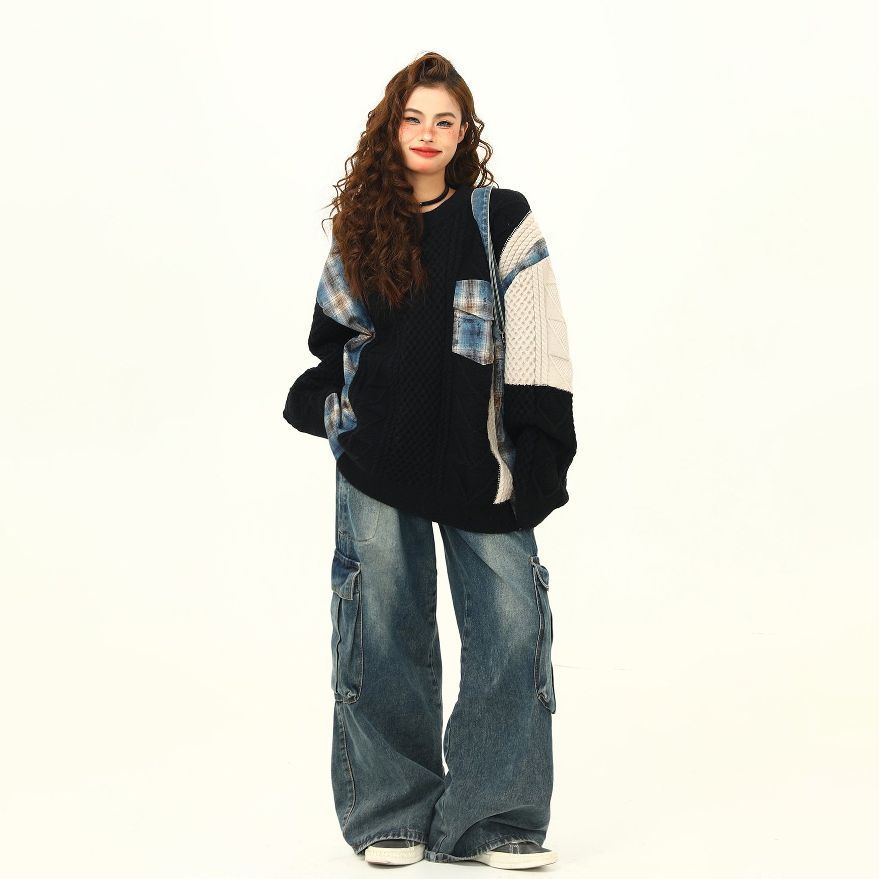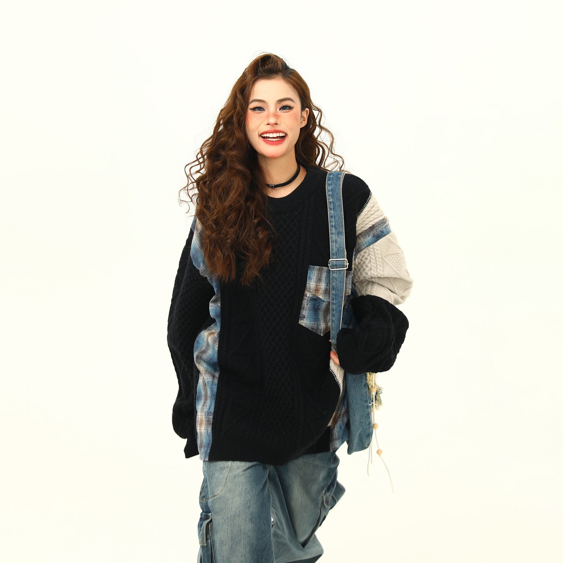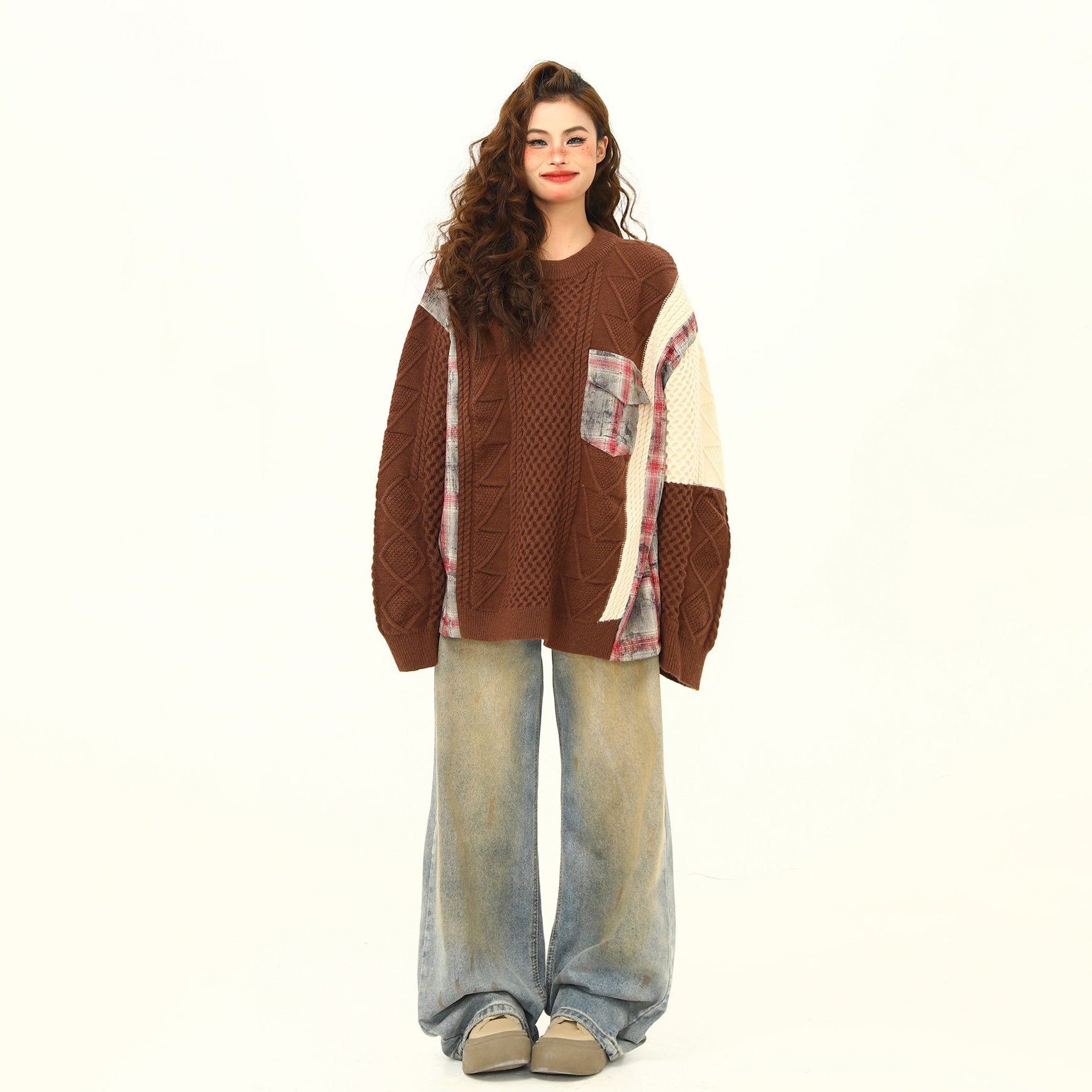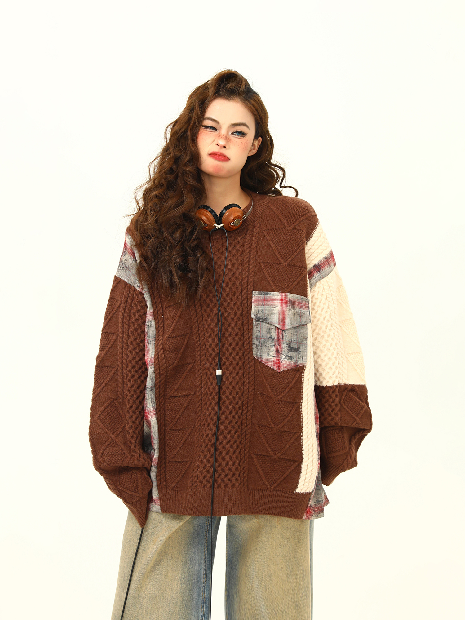【トップス】ストリート感漂う配色ニット✨秋冬新作 ゆったりシルエットでこなれ感アップ ケーブル編み おしゃれ セーター【FCシリーズ】