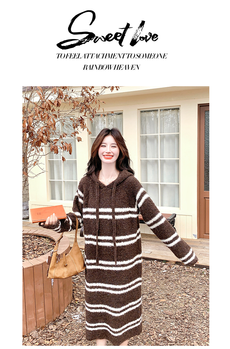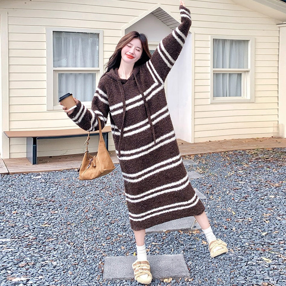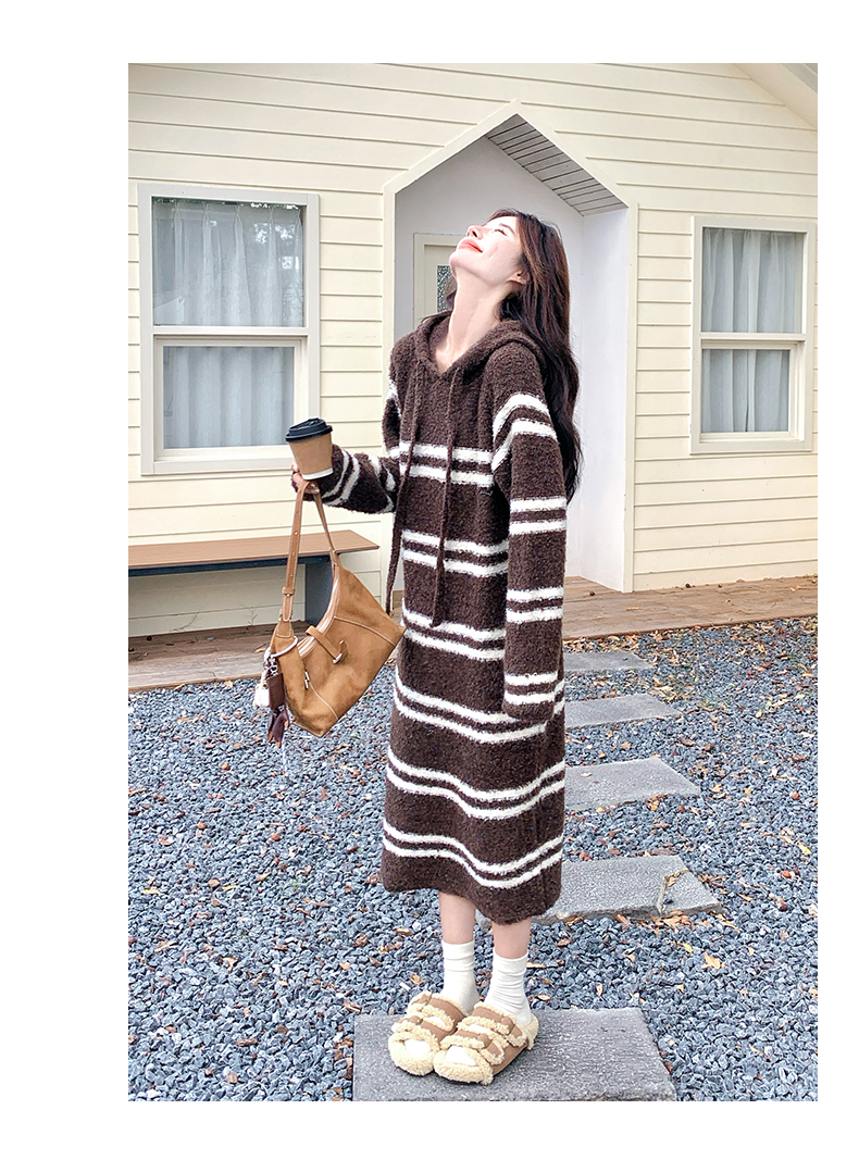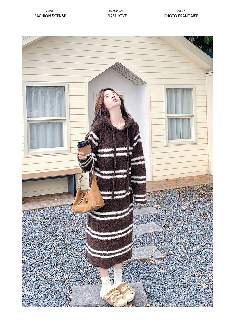 【商品名】【ワンピース】ボーダー ニットパーカーワンピース レディース 韓国風 学院スタイル ミディ丈 大人可愛い【JZシリーズ】