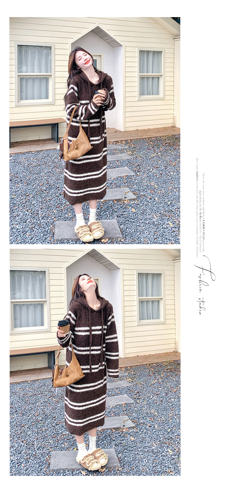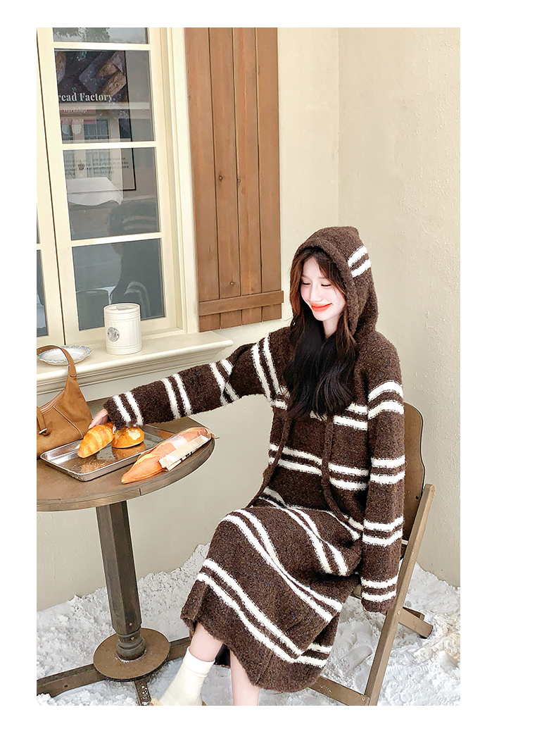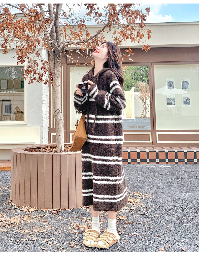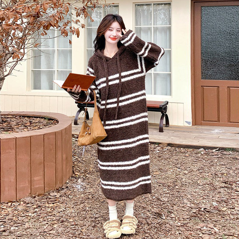 【商品名】【ワンピース】ボーダー ニットパーカーワンピース レディース 韓国風 学院スタイル ミディ丈 大人可愛い【JZシリーズ】