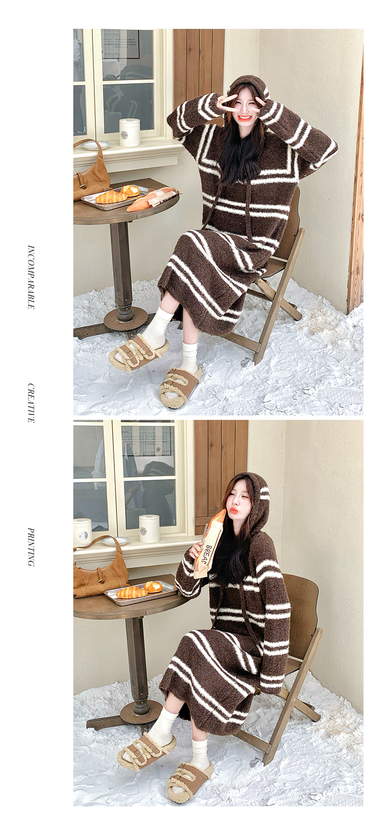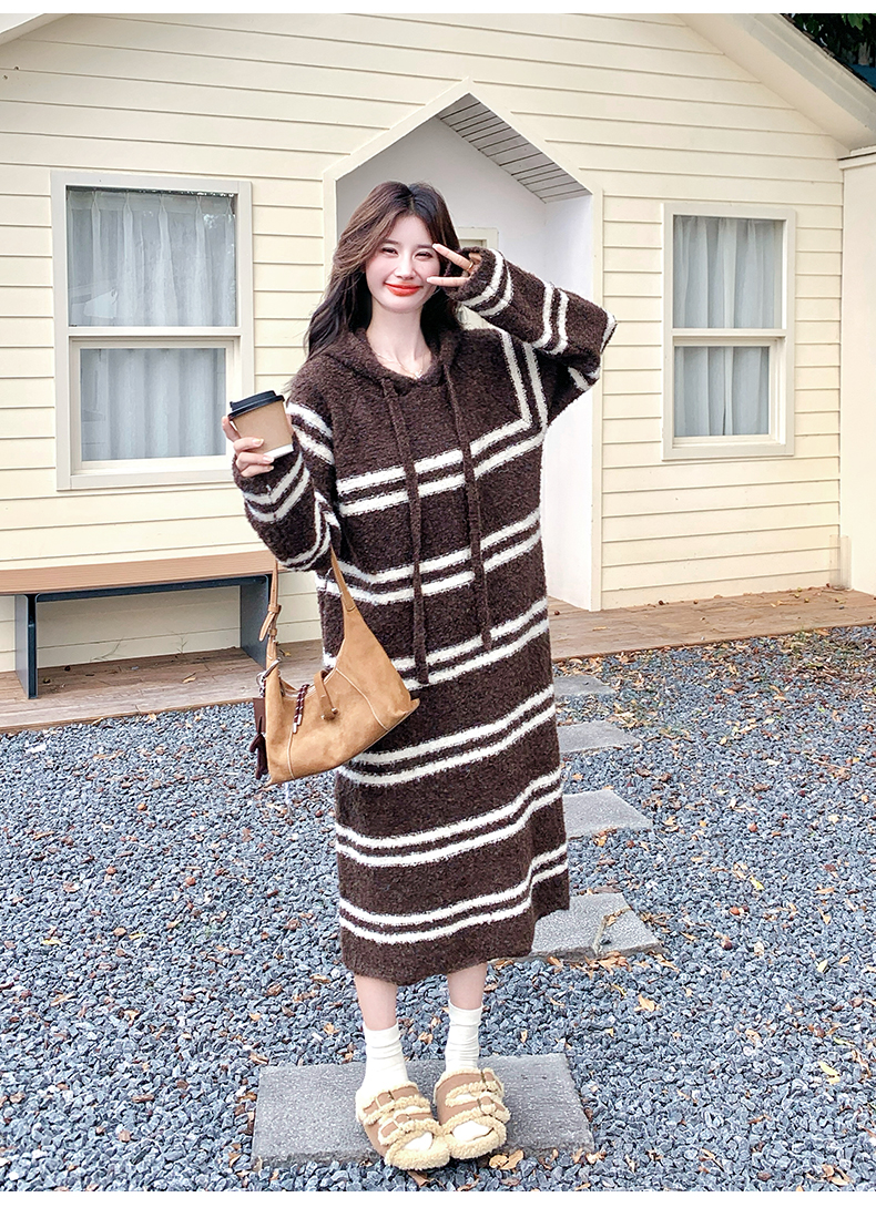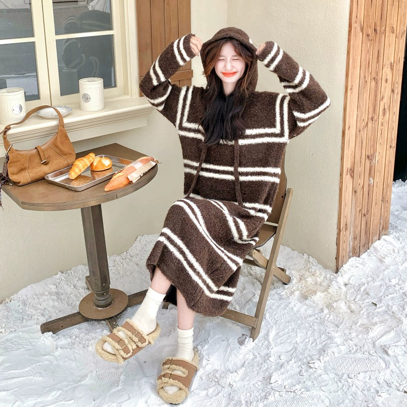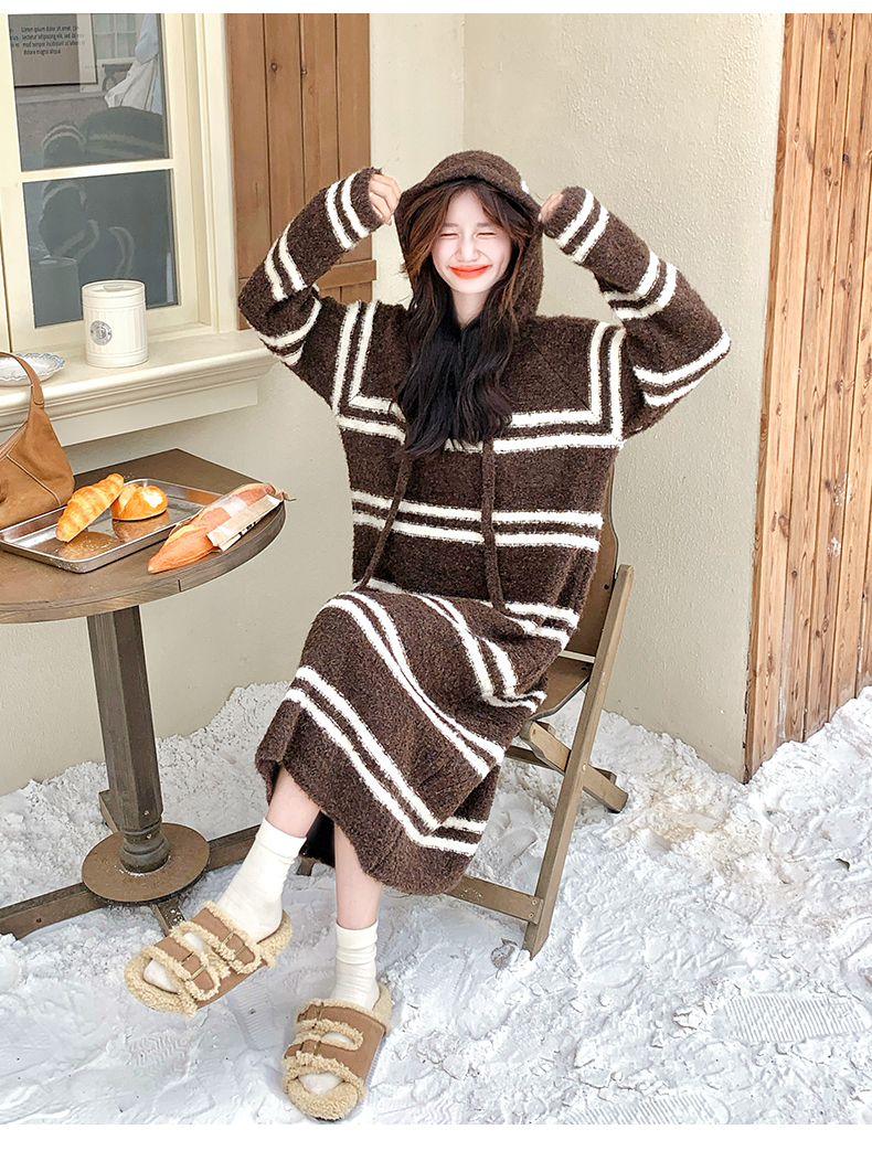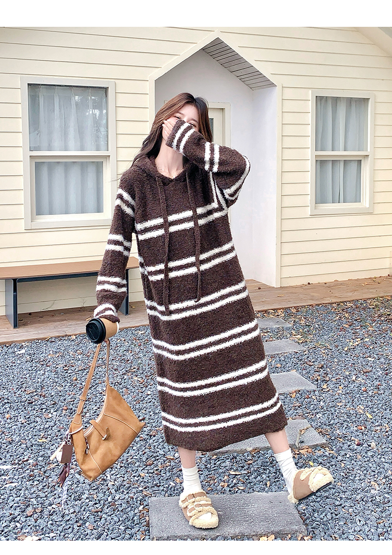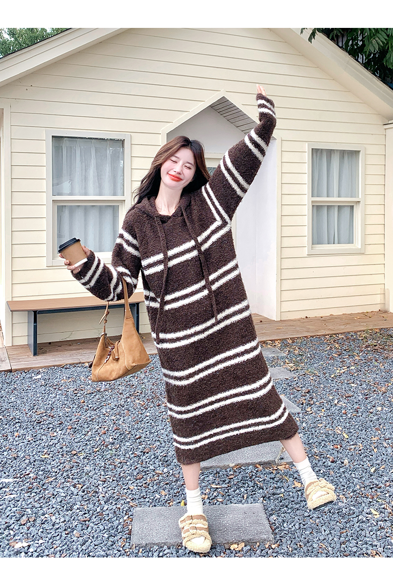 【ワンピース】ボーダー ニットパーカーワンピース レディース 韓国風 学院スタイル ミディ丈 大人可愛い【JZシリーズ】