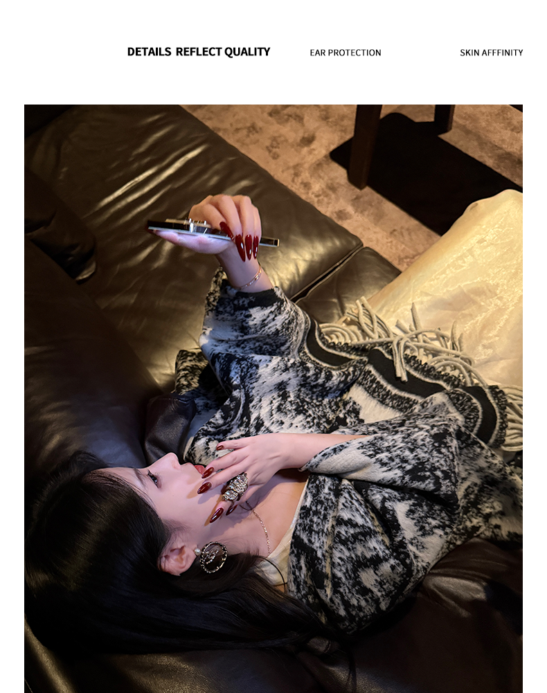 【トップス】レトロ 猫柄ジャカード クルーネック ニット レディース フリンジデザイン ゆったり 着回し セーター【FCシリーズ】