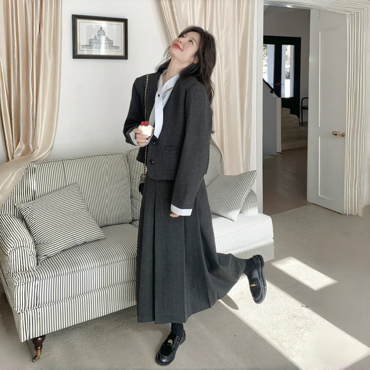 【商品名】【セットアップ】大人可愛い 高級感 シャネル風 フェイクレイヤード 気質よい 2点セット