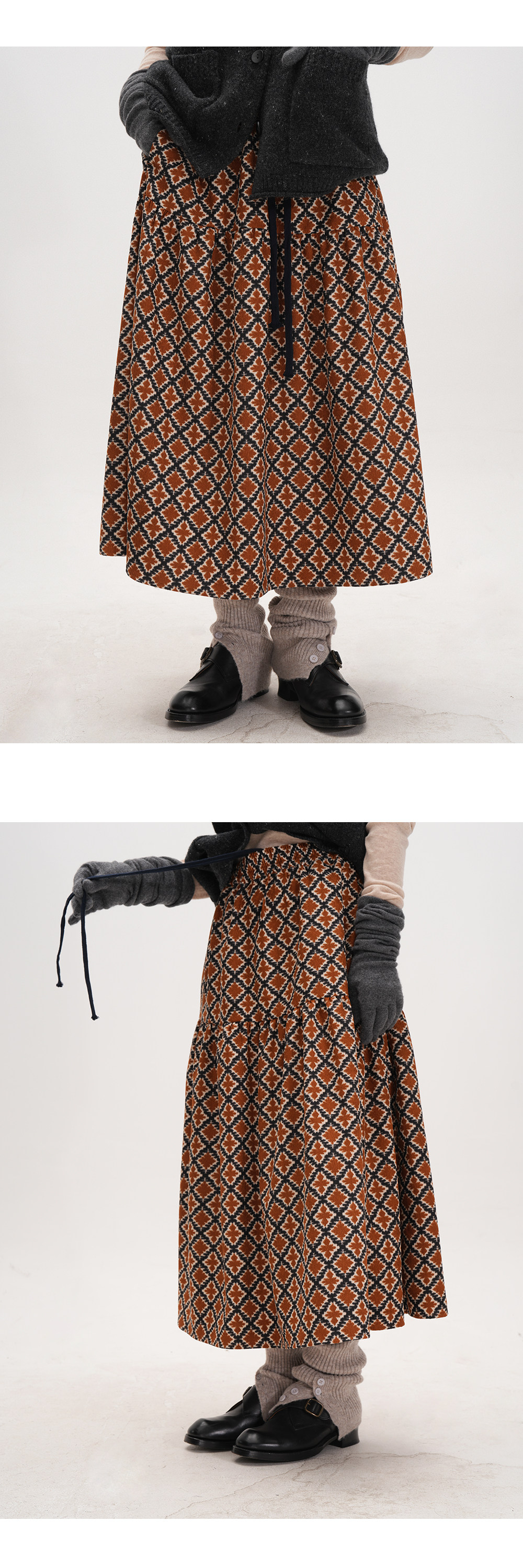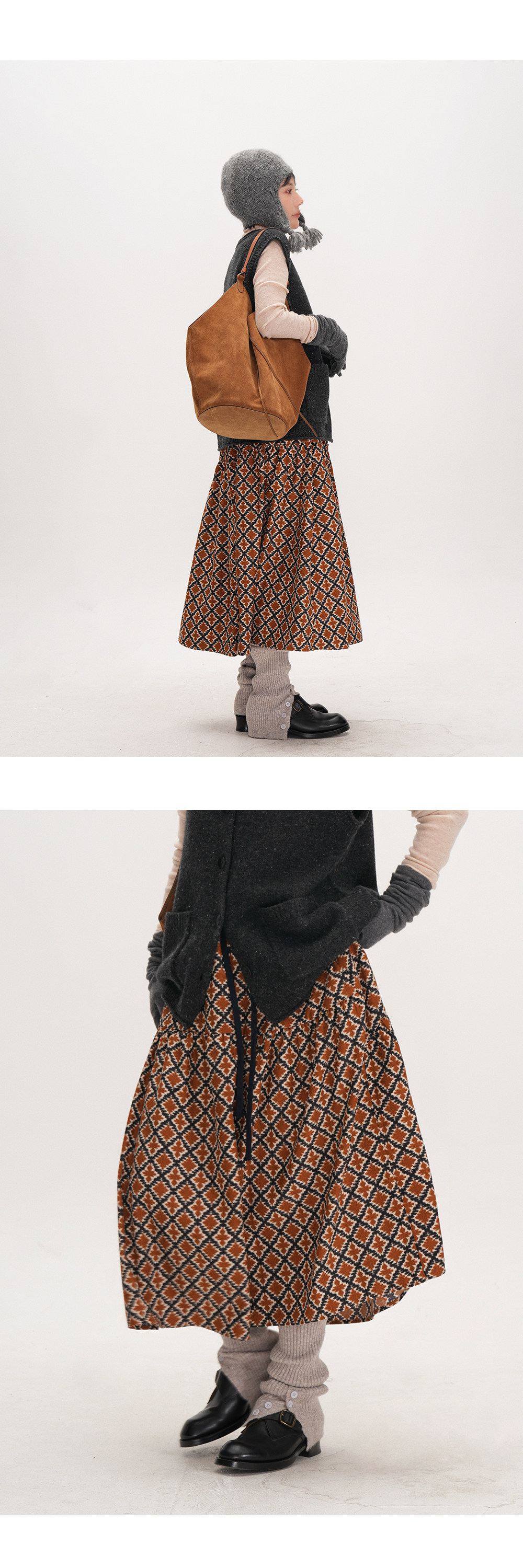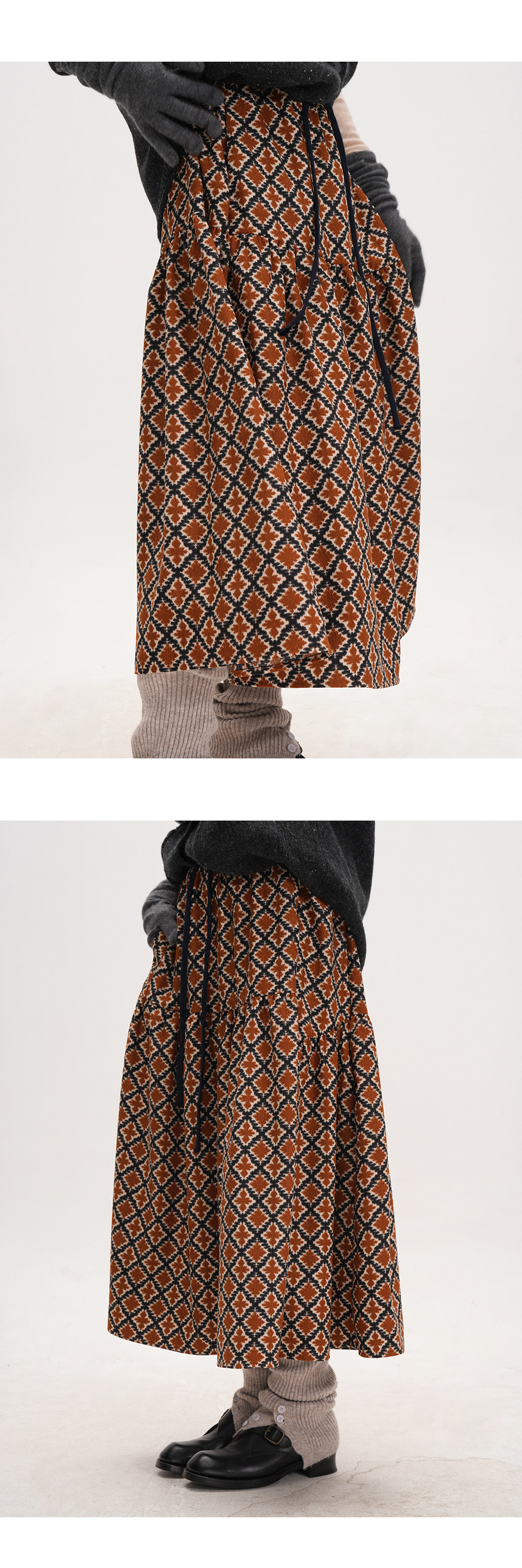 【ボトムス】秋冬らしい温もり素材 ⭐ プリントコーデュロイ ハイウエスト ゴムウエスト 学院風 シンプル ミモレ丈 スカート【JZシリーズ】【SHシリーズ】【15~20日内発送】